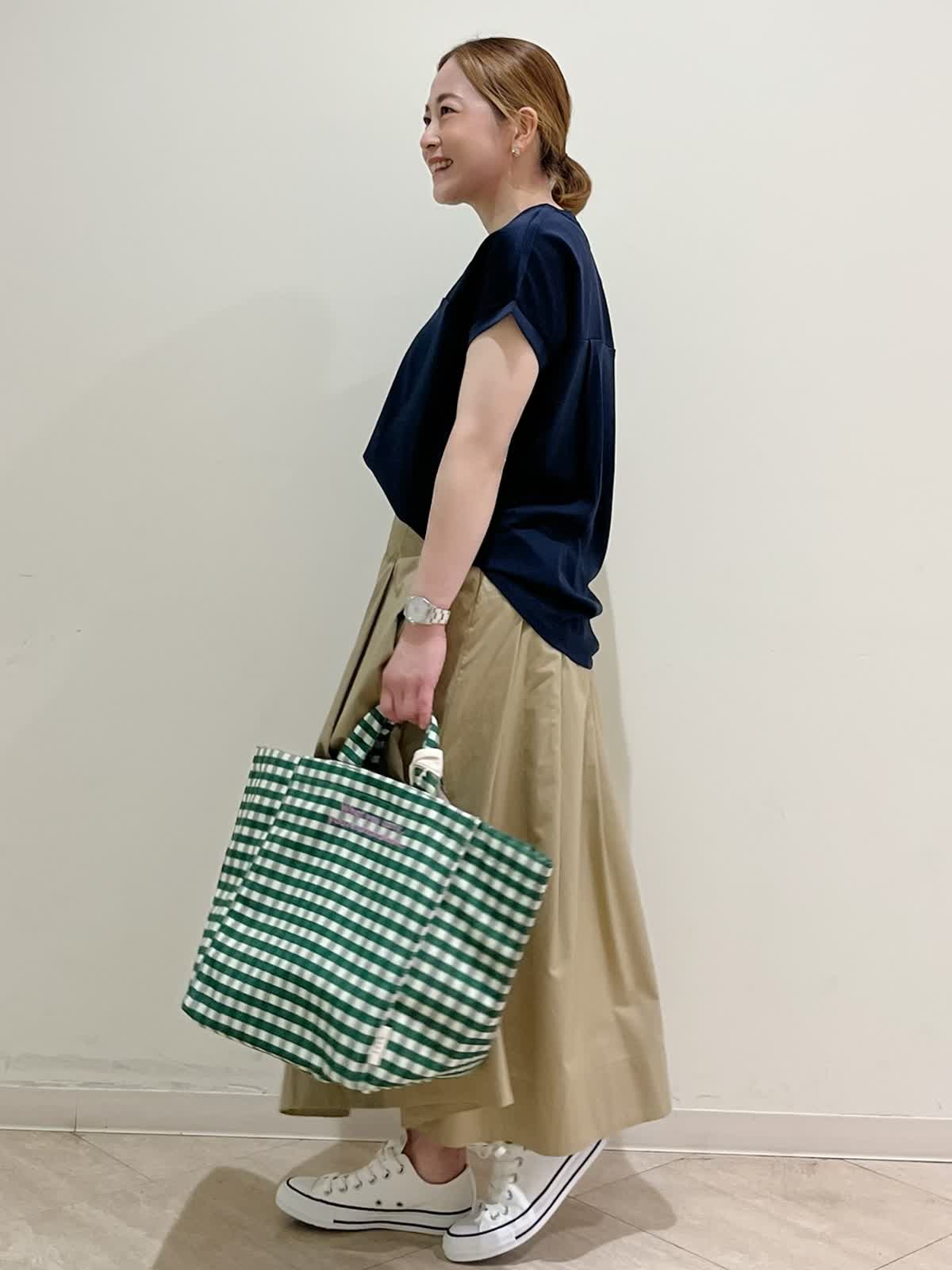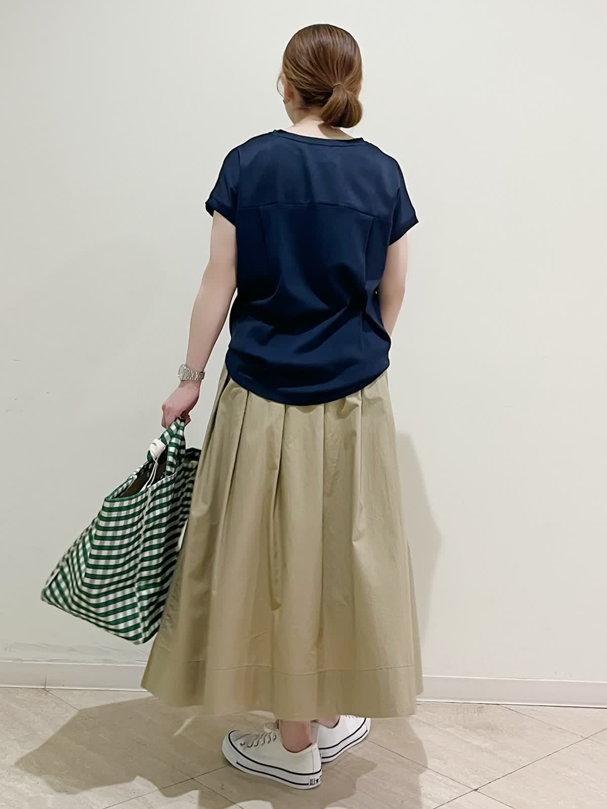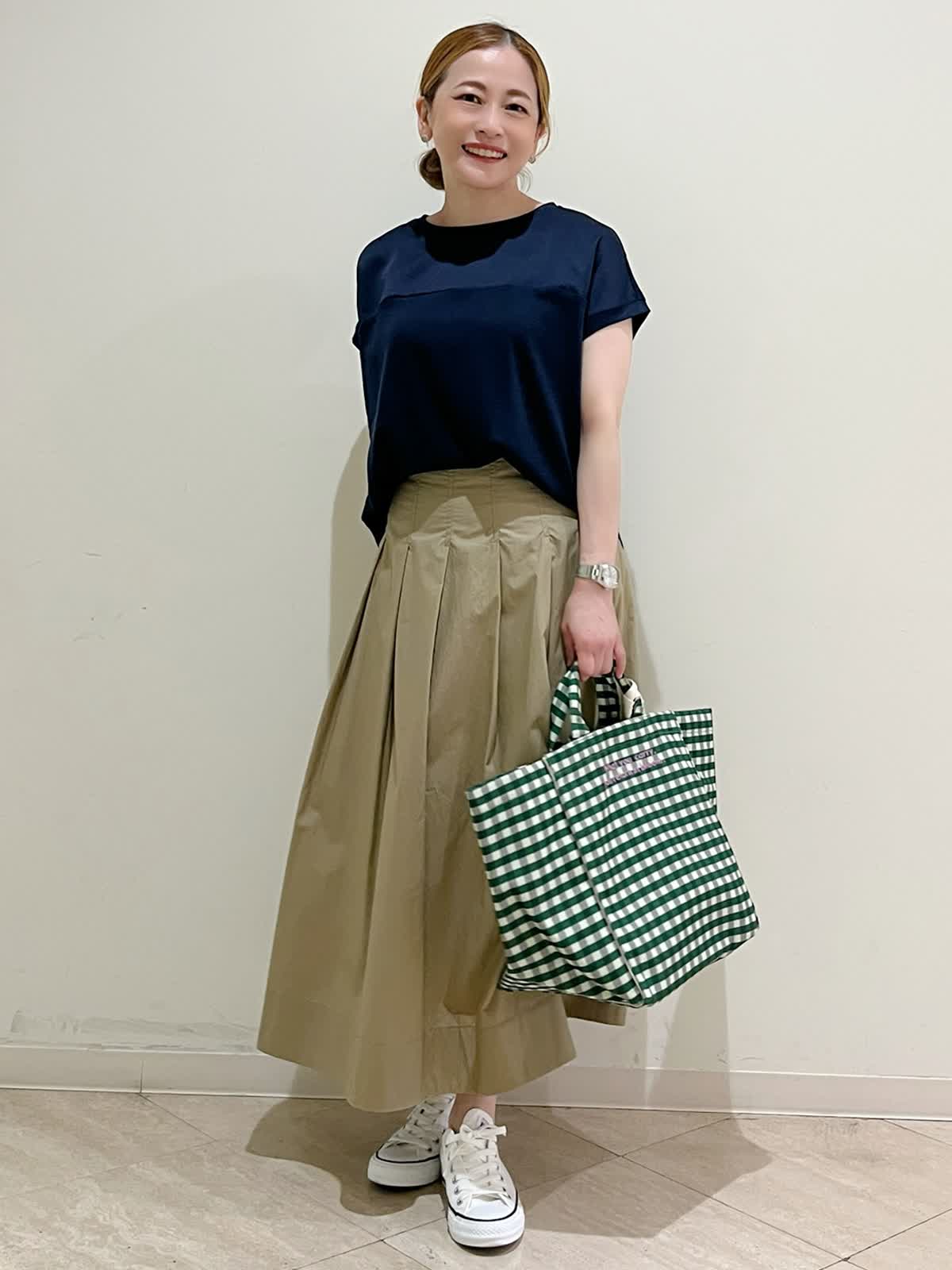 【着用サイズ】カットソー:フリーサイズ スカート:9号 【着用カラー】カットソー:ネイビー スカート:ベージュ 休日のショッピングにおすすめスタイリングです。人気のサテン切り替えのカットソーは着心地が良過ぎて色違いで欲しくなります。切り替えの位置が高めなのでお顔まわりをすっきり見せてくれます。ゆったりのサイズ感もお気に入りです。スカートは揺れ感がきれいです。程良い着丈で足元も合わせやすいです。