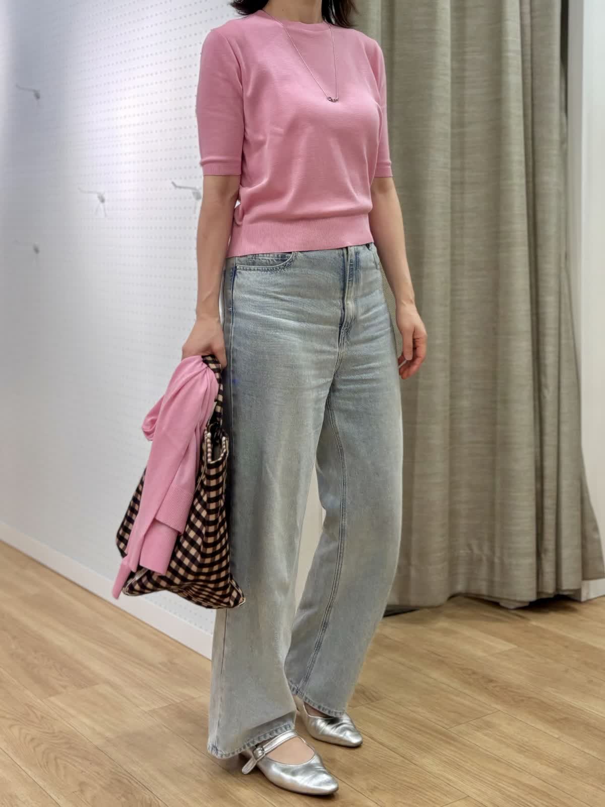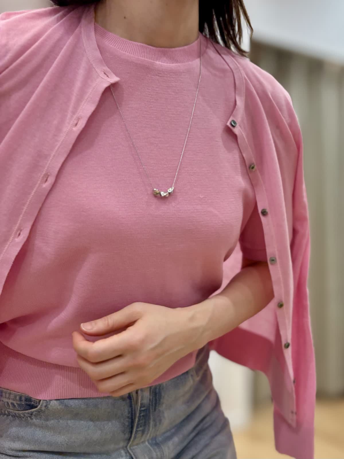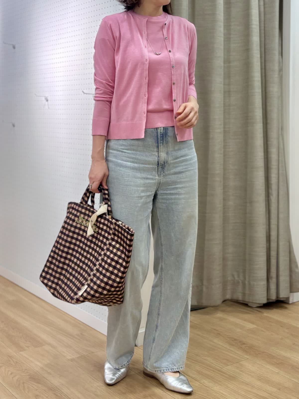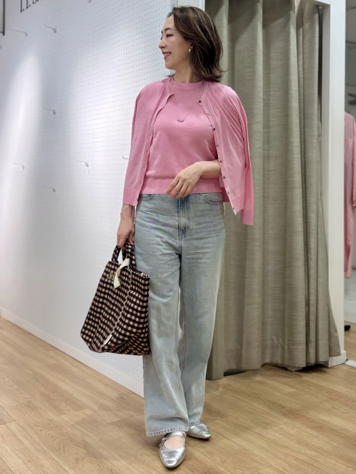 【着用カラー/サイズ】 ニット:ピンク/9号 カーディガン:ピンク/9号 パンツ:サックス/11号 初夏のお出掛けスタイリング。真夏に重宝するカーディガンとニットはコットン100%で表面の毛羽を焼くことで滑らかな手触り感と肌心地です。とても軽く薄手の生地なのでストレス無く着られます。夏のお出掛けには気分の上がるピンクがオススメです。