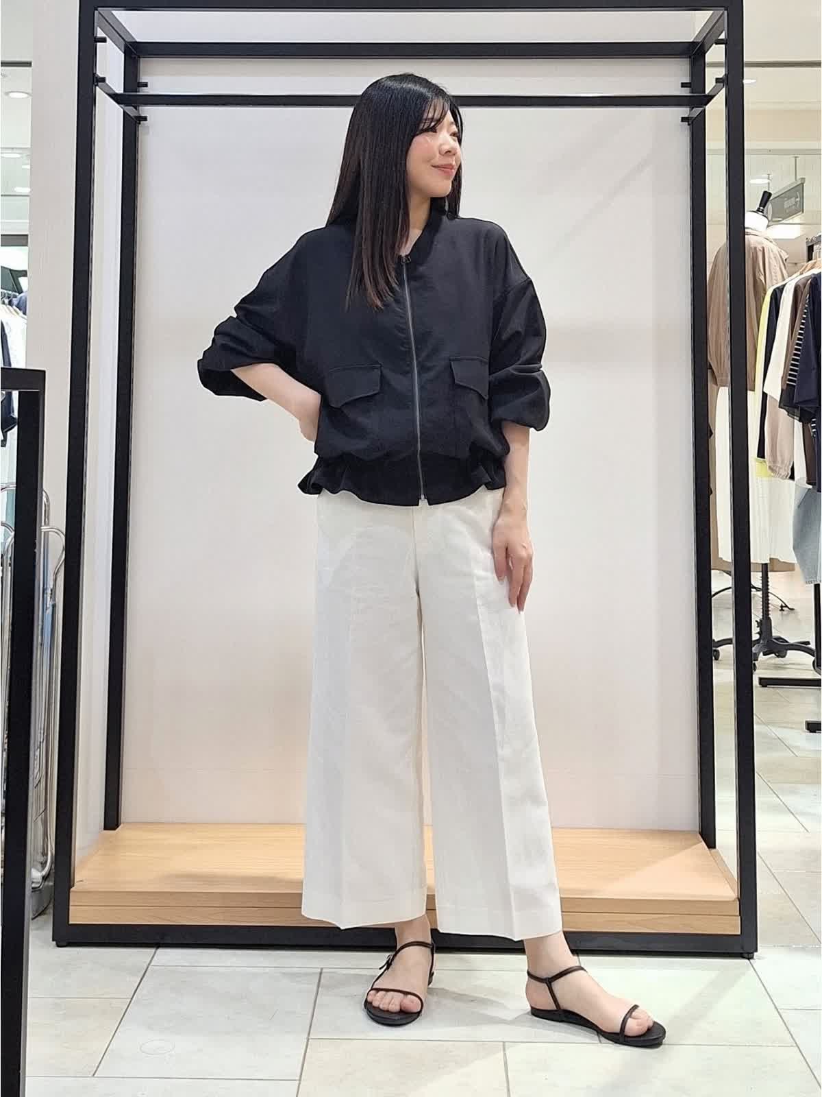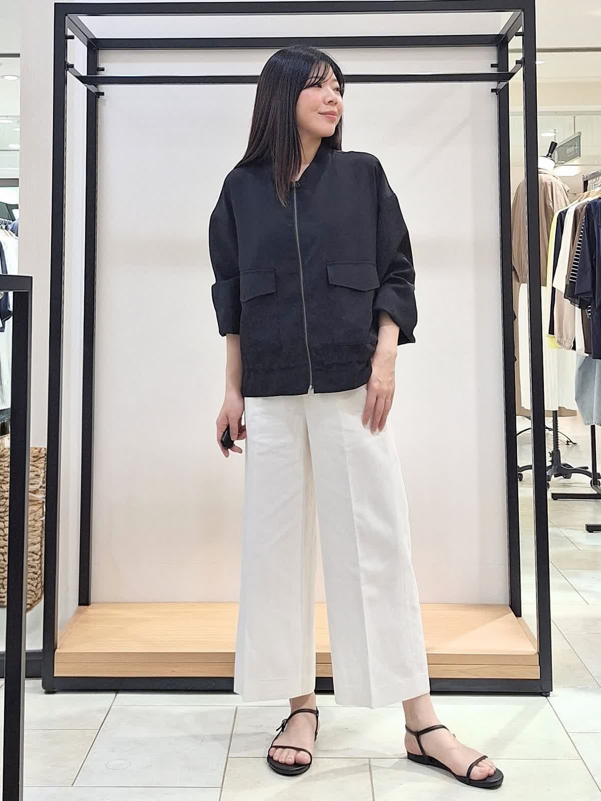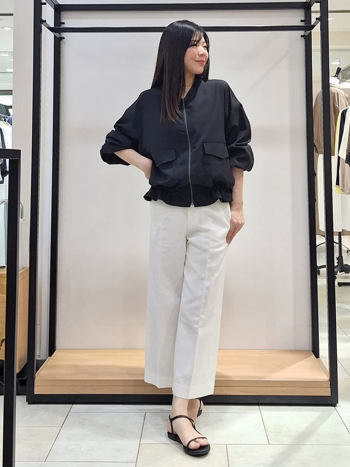 【着用サイズ、カラー】ブルゾン:9号、ブラック パンツ:7号、オフホワイト 羽織りでもプルオーバーでも着れるリネンライクブルゾン。シワになりにくく超軽量、洗えるのも嬉しいポイントです!袖口はゴム入りで袖丈調節が可能。裾はゴム仕様のドロスト紐をキュッと絞って表情を変えれます。ボトムはリネン混のクロップドパンツ。オフホワイトでさらに爽やか。ゴム仕様のバックウエストで穿き心地ラクチン♪サイズ展開が豊富です!暑くなってきたので、足元はサンダルで涼しげにコーディネートしました。ぜひチェックしてみて下さいね☆