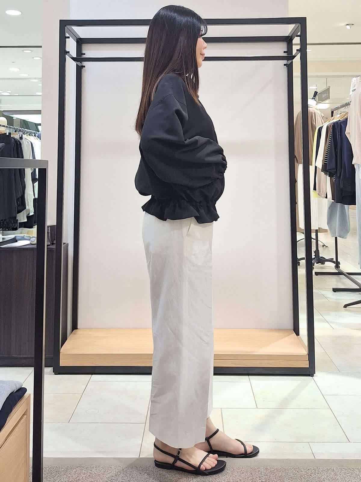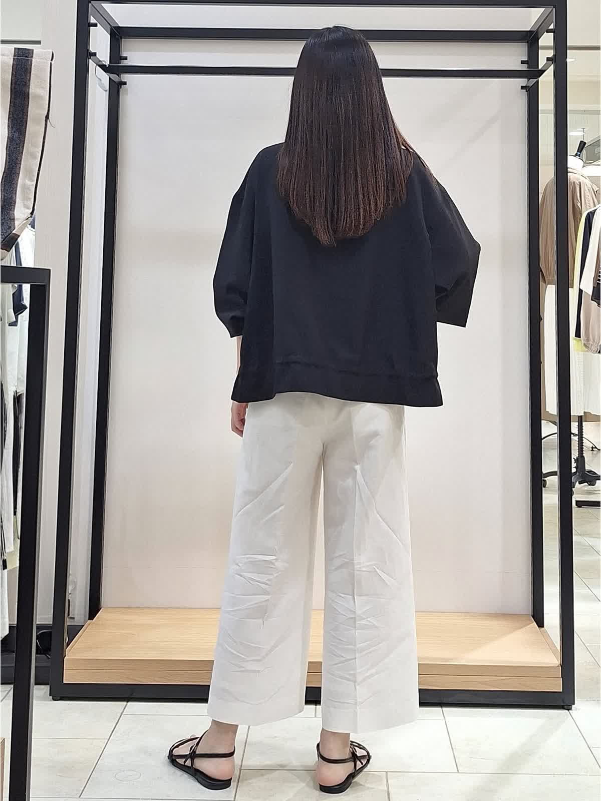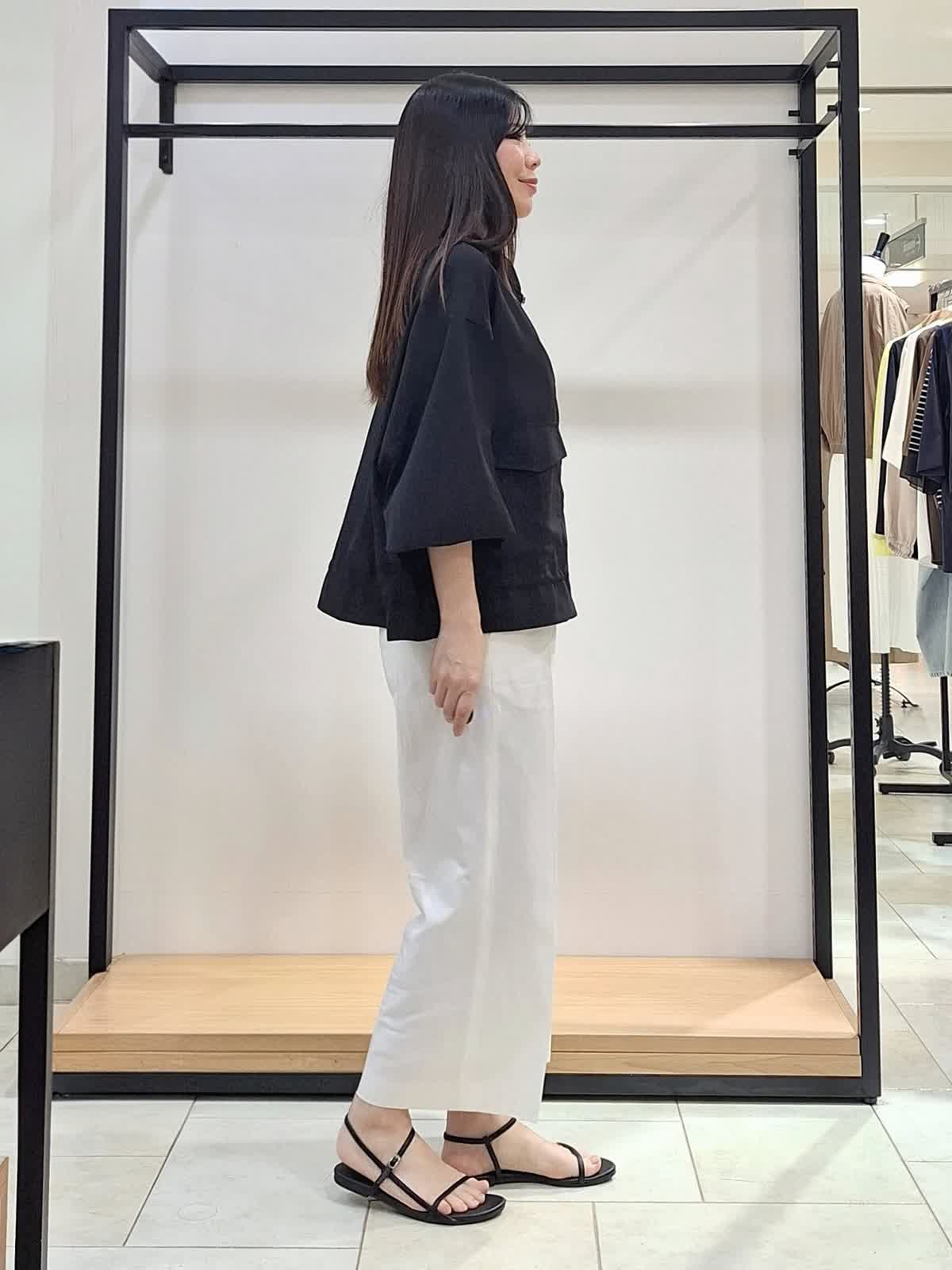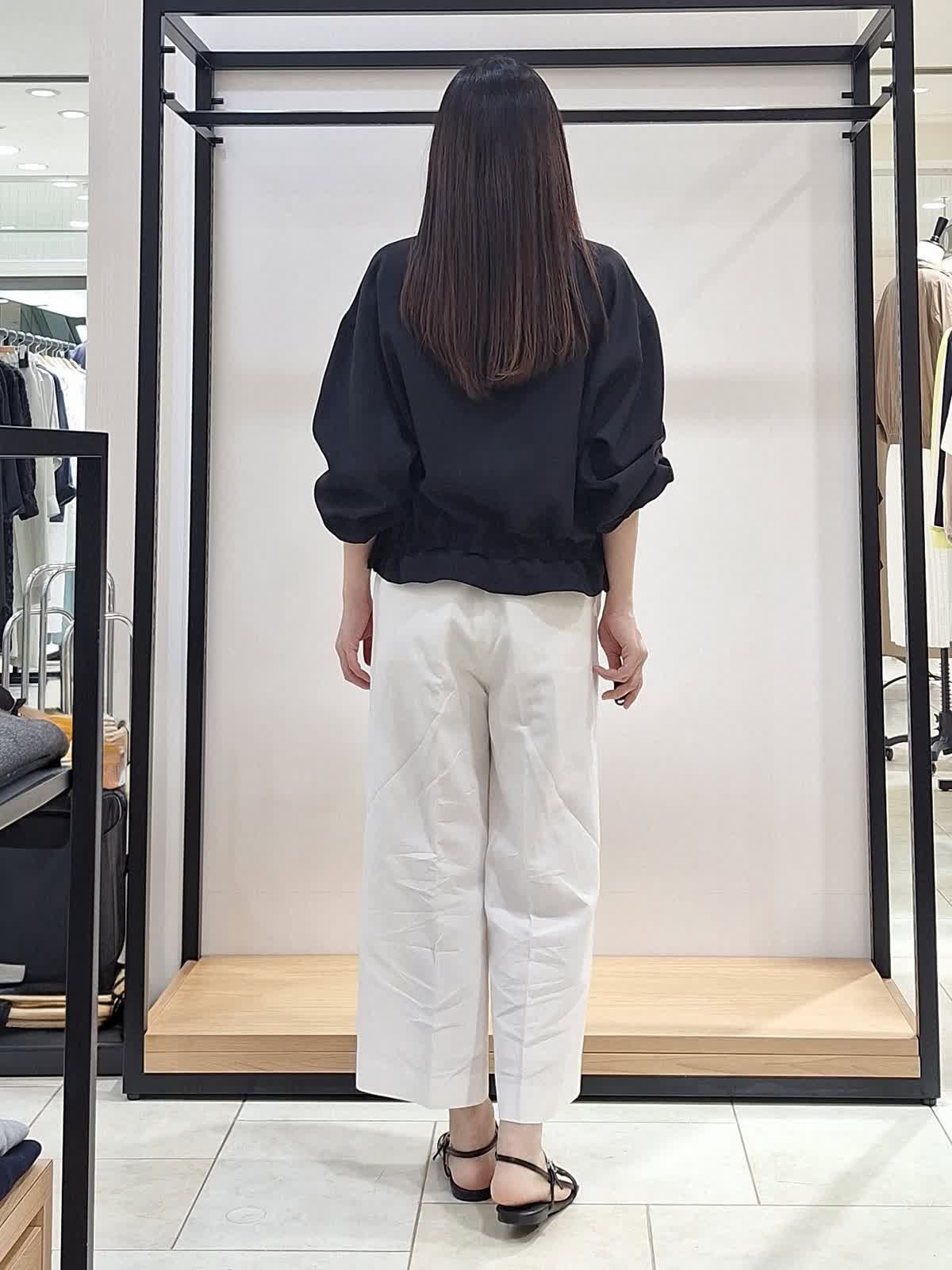 【着用サイズ、カラー】ブルゾン:9号、ブラック パンツ:7号、オフホワイト 羽織りでもプルオーバーでも着れるリネンライクブルゾン。シワになりにくく超軽量、洗えるのも嬉しいポイントです!袖口はゴム入りで袖丈調節が可能。裾はゴム仕様のドロスト紐をキュッと絞って表情を変えれます。ボトムはリネン混のクロップドパンツ。オフホワイトでさらに爽やか。ゴム仕様のバックウエストで穿き心地ラクチン♪サイズ展開が豊富です!暑くなってきたので、足元はサンダルで涼しげにコーディネートしました。ぜひチェックしてみて下さいね☆