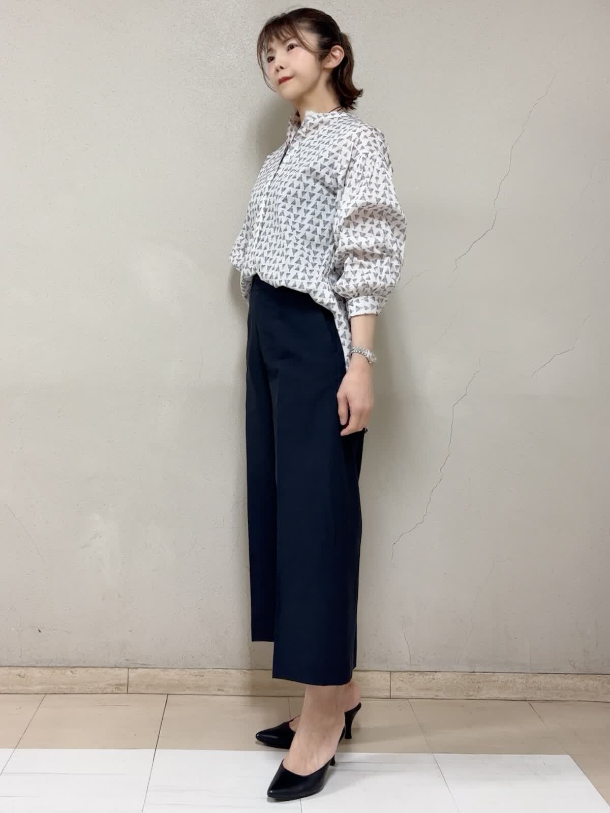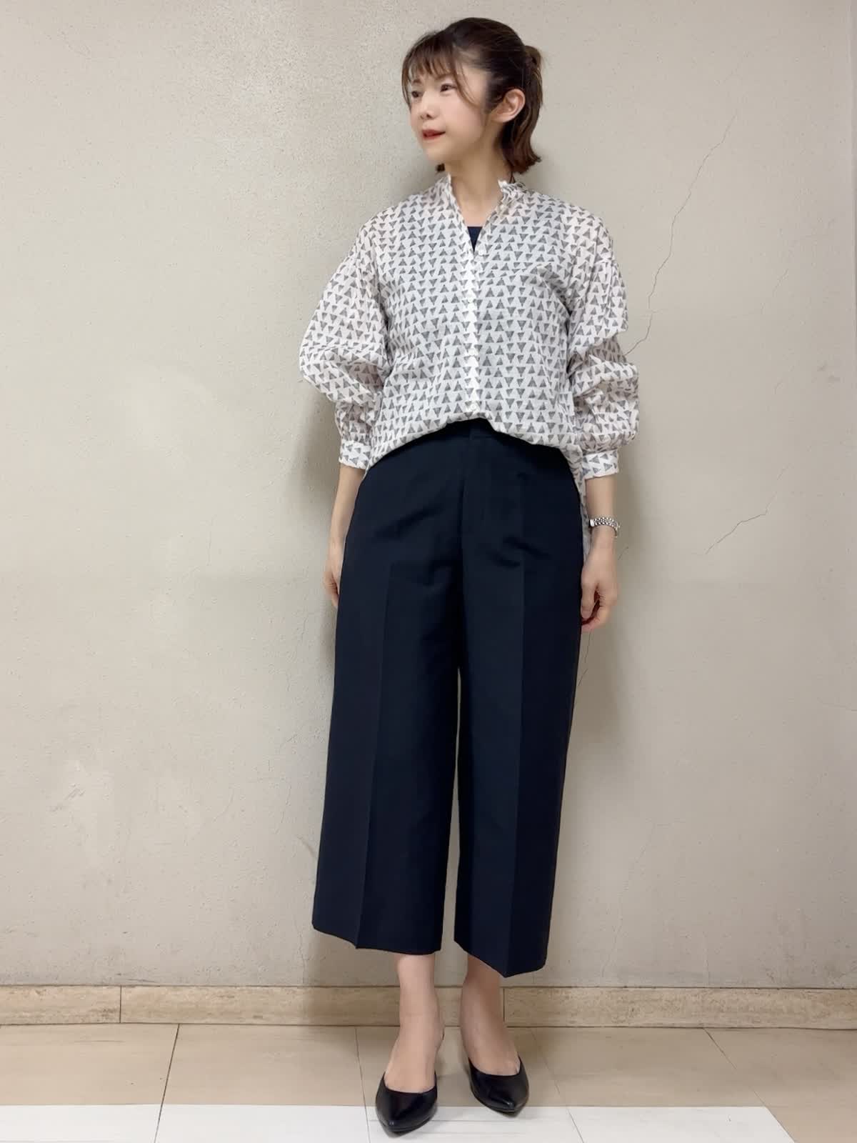 【着用サイズ】ブラウス:フリー タンクトップ:9号 パンツ:11号 【着用カラー】ブラウス:アイボリー タンクトップ:ネイビー パンツ:ネイビー お出掛けスタイル 若干シアー感のあるコットン100%のブラウスは、涼し気で嫌味無い柄がお気に入り。ボトムのカラーに合わせて、タンクトップのトーンを選んで楽しめる。