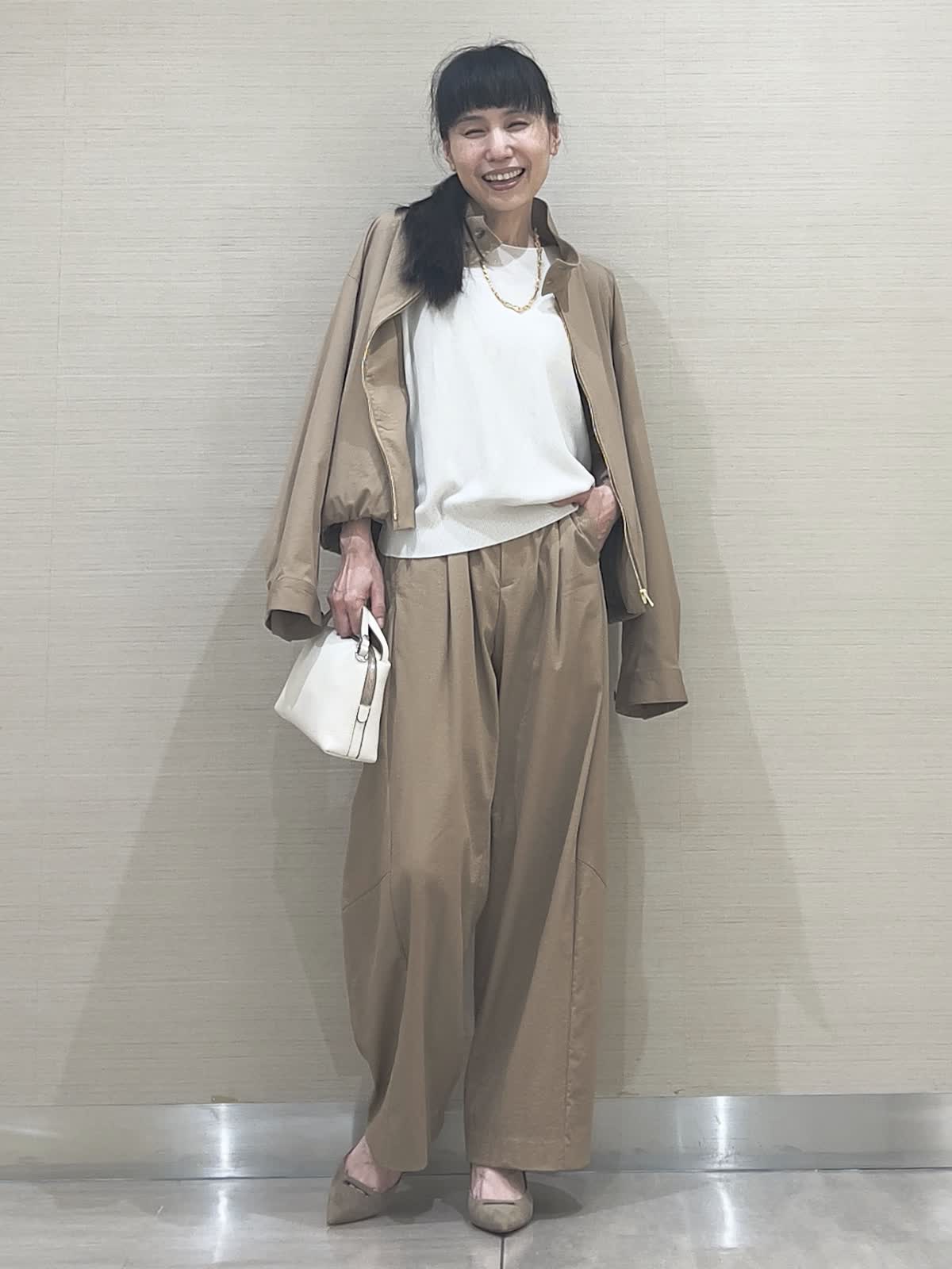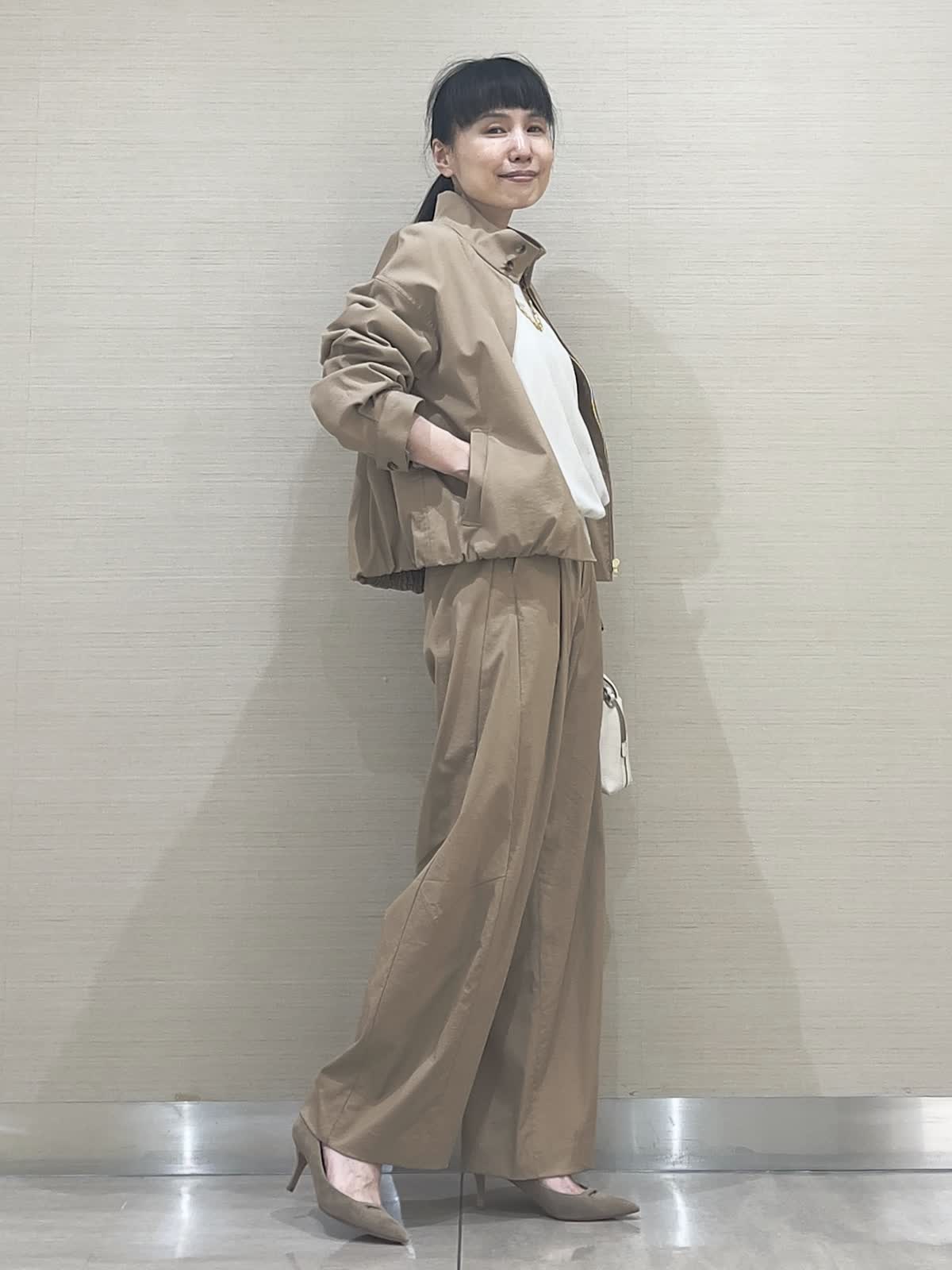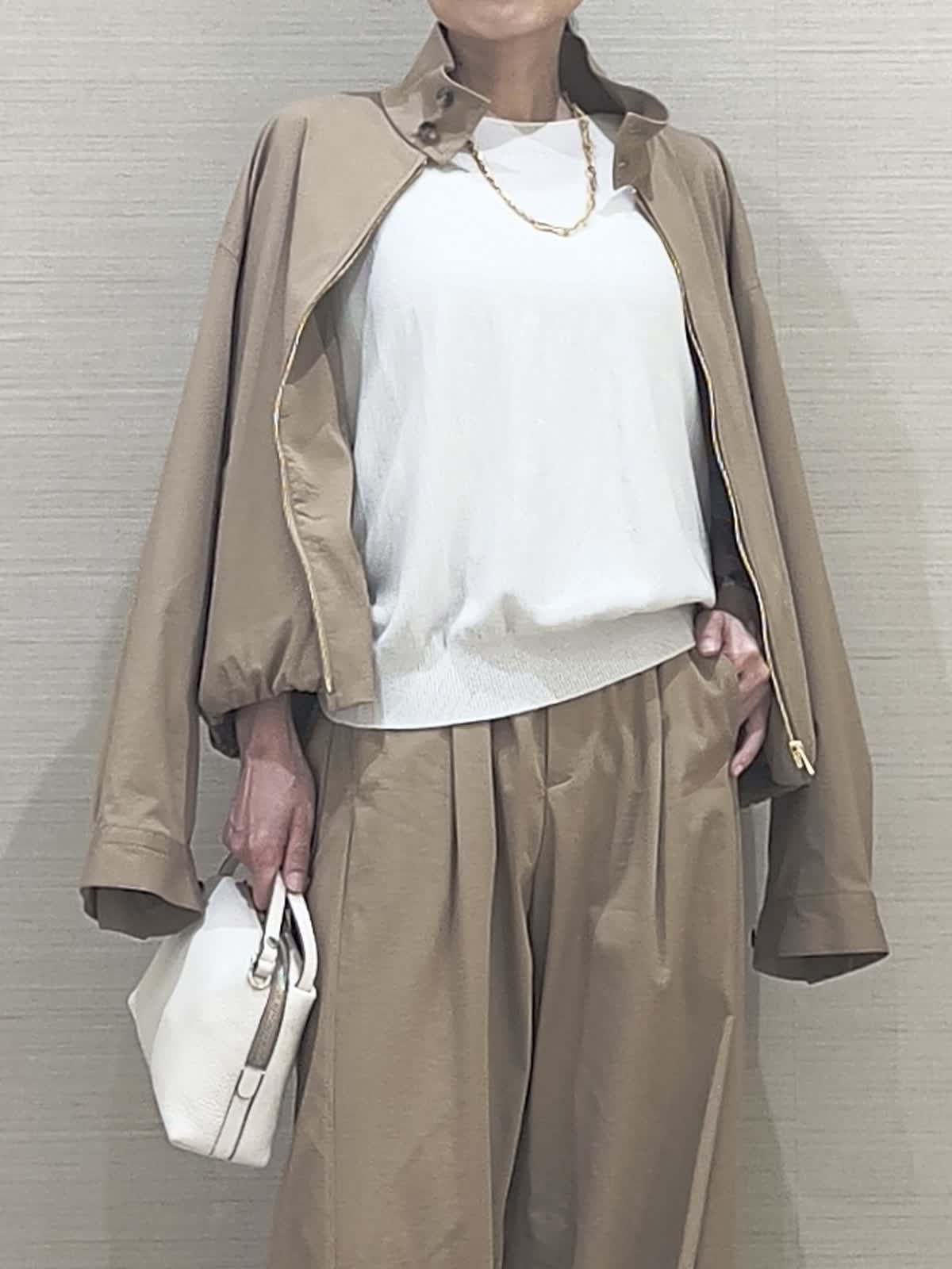 【着用サイズ】アイテム:ブルゾン/カラー キャメル/サイズ09(9号) アイテム:パンツ/カラー キャメル/サイズ07(7号) アイテム:ニット/カラー サグレーベージュ/サイズ 09(9号)アイテム:バッグ/カラー オフホワイト/サイズ 40(フリー) ブルゾンセットアップコーディネート 薄手で軽やかセットアップ。今の季節に丁度良い、重宝する軽さが魅力です。お揃いパンツはほんのりカーブライン。これなら大人が穿いてもやり過ぎないのが嬉しいですね。夏にも活躍するサラッと素材のニットを合わせて。