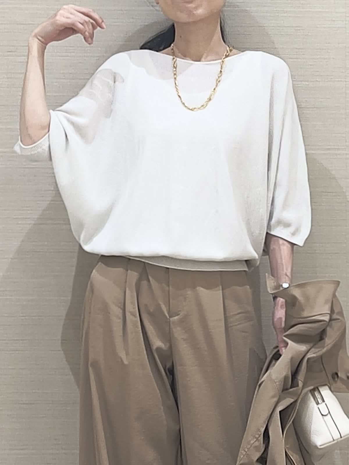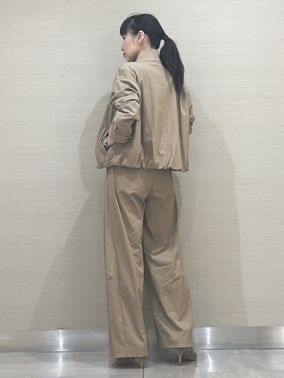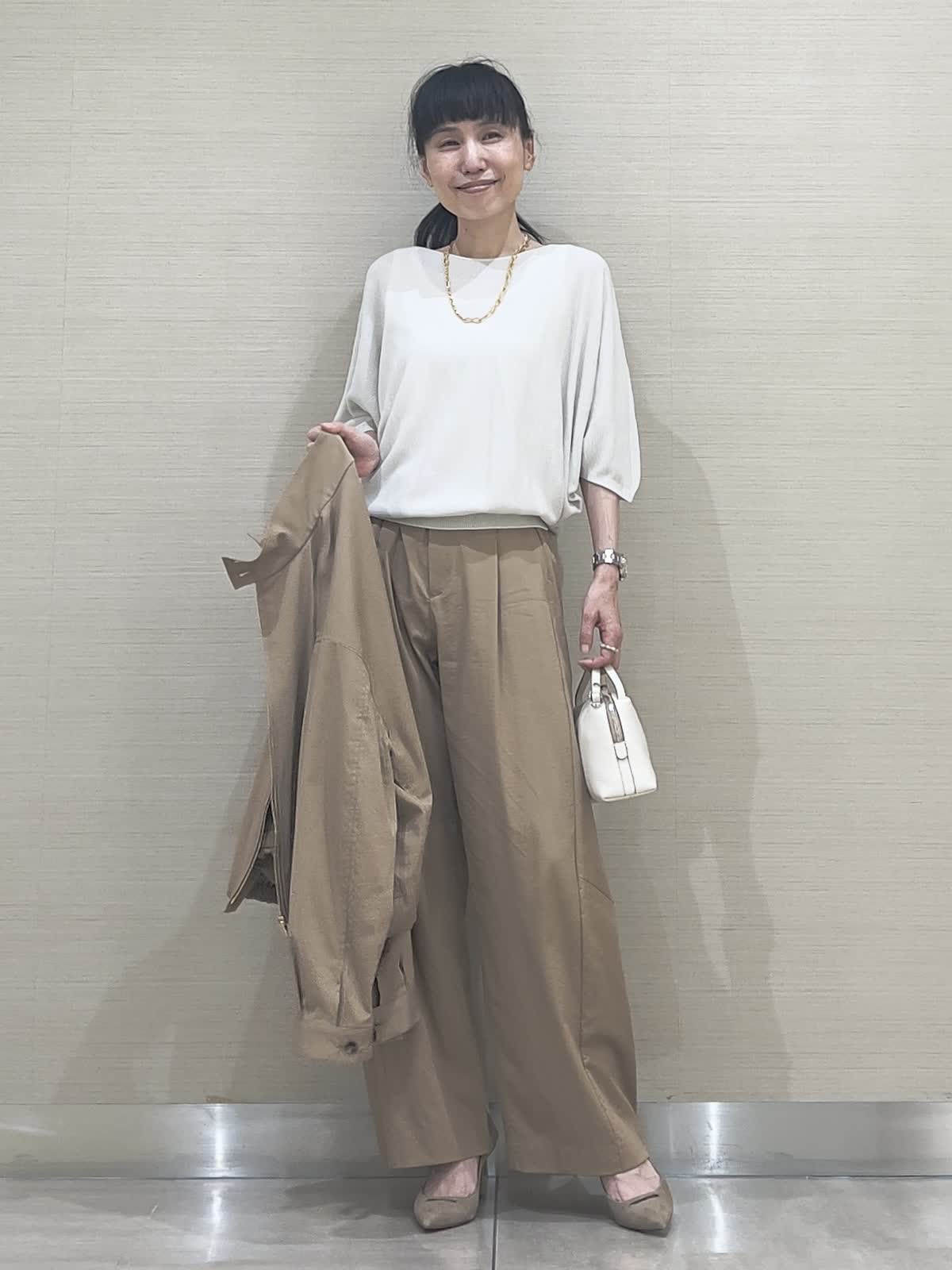 【着用サイズ】アイテム:ブルゾン/カラー キャメル/サイズ09(9号) アイテム:パンツ/カラー キャメル/サイズ07(7号) アイテム:ニット/カラー サグレーベージュ/サイズ 09(9号)アイテム:バッグ/カラー オフホワイト/サイズ 40(フリー) ブルゾンセットアップコーディネート 薄手で軽やかセットアップ。今の季節に丁度良い、重宝する軽さが魅力です。お揃いパンツはほんのりカーブライン。これなら大人が穿いてもやり過ぎないのが嬉しいですね。夏にも活躍するサラッと素材のニットを合わせて。