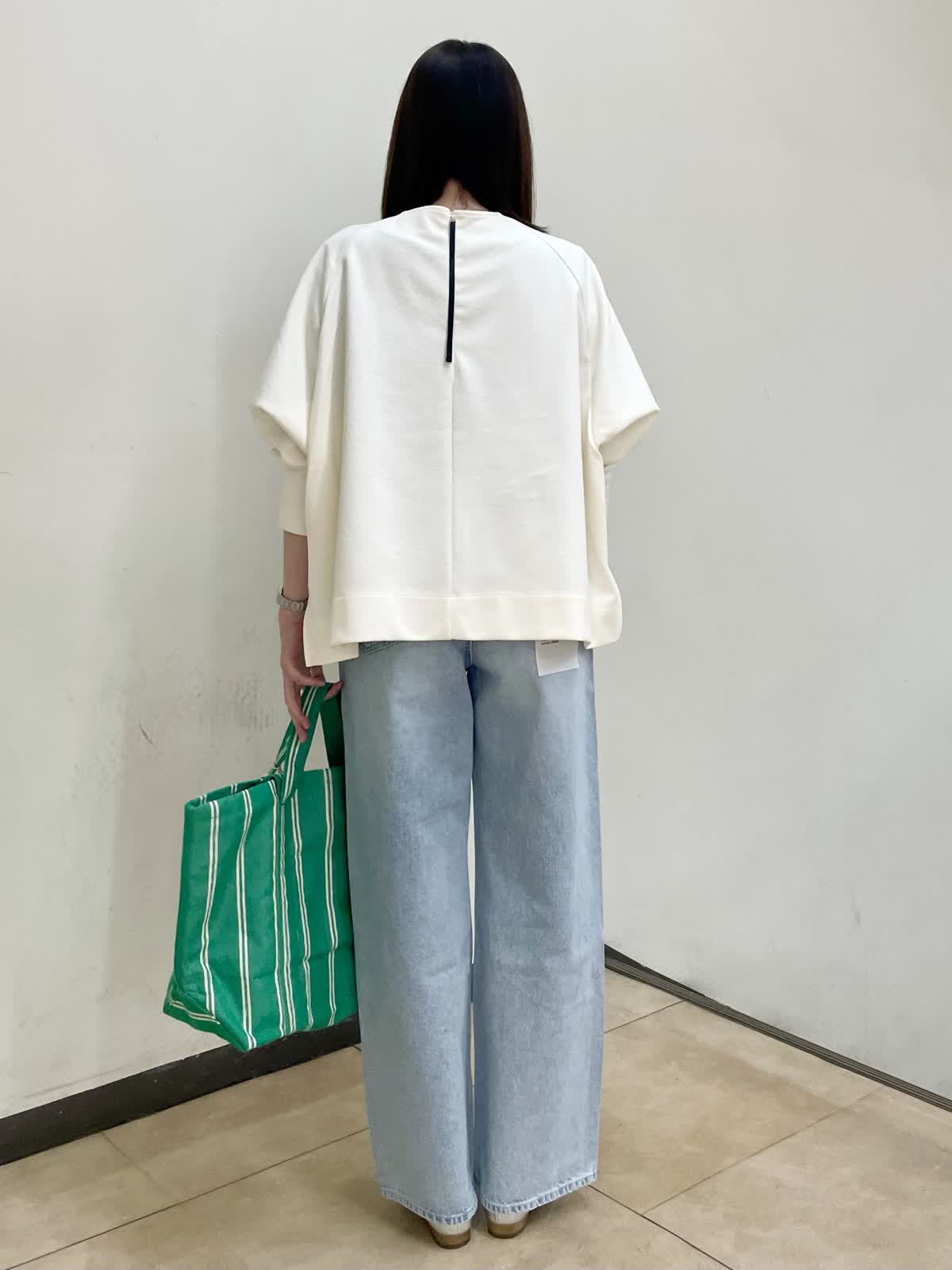 【着用サイズ】カットソー:フリー パンツ:11号 ゆったりシルエットのドルマンスリーブプルオーバー。前後差のあるデザインで、後はヒップが隠れるロング丈。バックジップがポイントになっています。