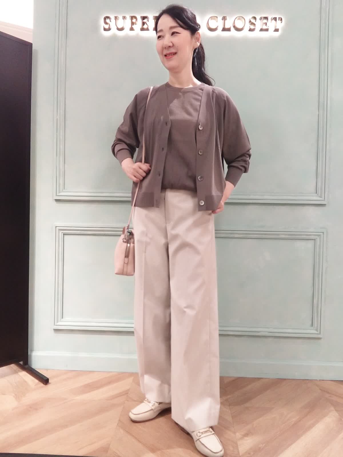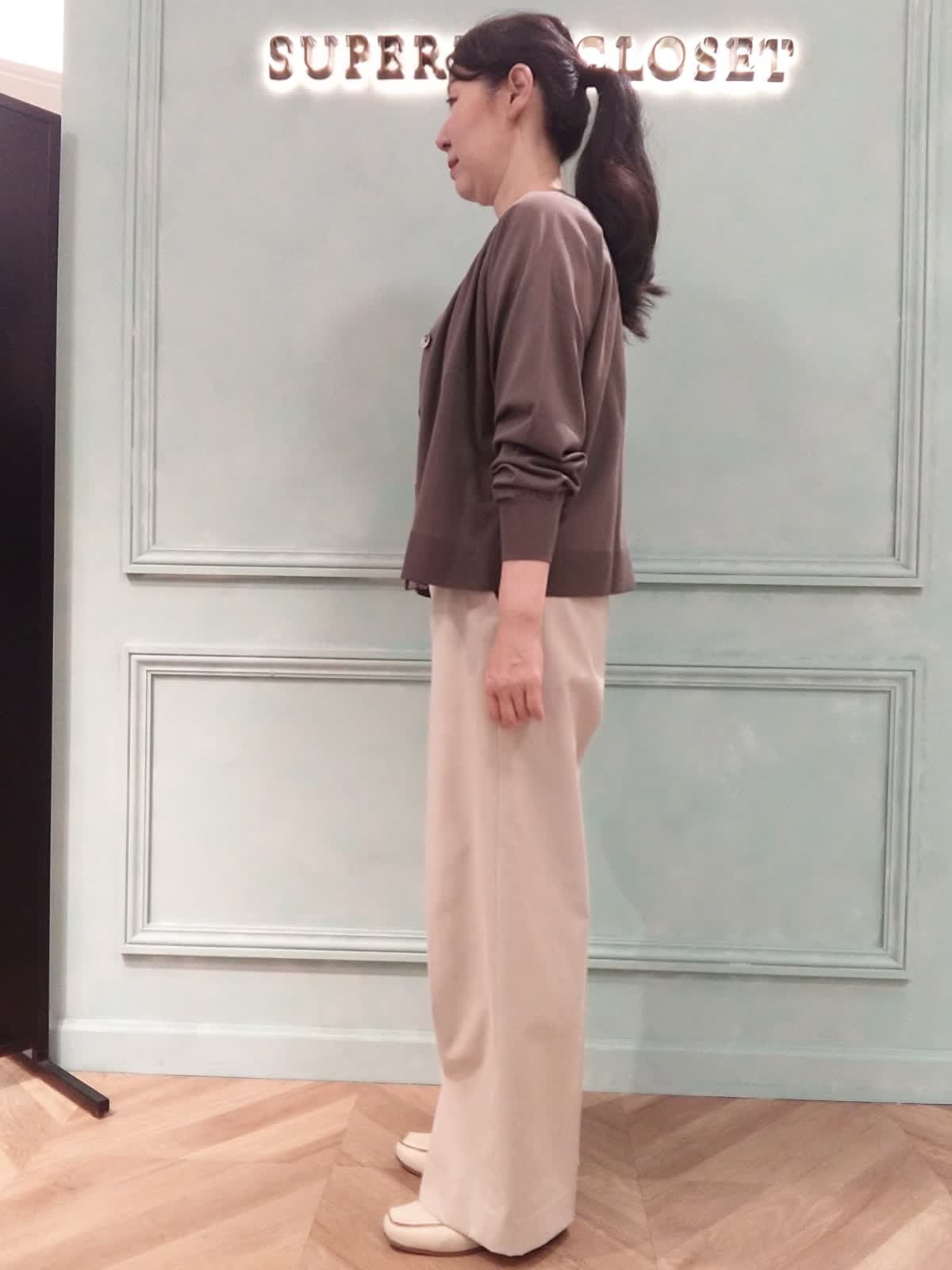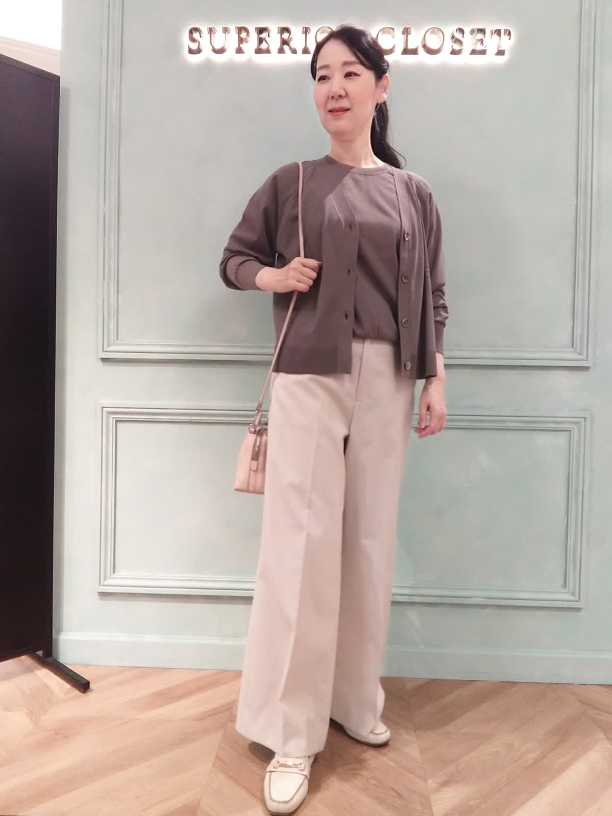 【着用サイズ】カーディガン:9号、ニット:9号、パンツ:9号 【着用カラー】カーディガン:モカチャ、ニット:モカチャ、パンツ:ベージュ 美術館めぐりにオススメのアンサンブルスタイル。1日の時間帯で温度差を感じる季節。薄手のニットアンサンブルはカーディガンを脱ぎ着して体温調節ができる便利アイテム。綿とポリエステル糸が肌当たりがやさしく、ドライタッチ。上品なモカチャの色合いと明るめベージュのパンツでコーディネート。パンツはセンタープレスがあり、スッキリ脚長効果が期待できます。ウエスト後ろゴムでラクな履き心地です。