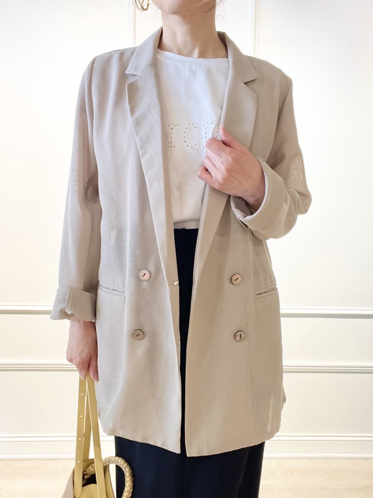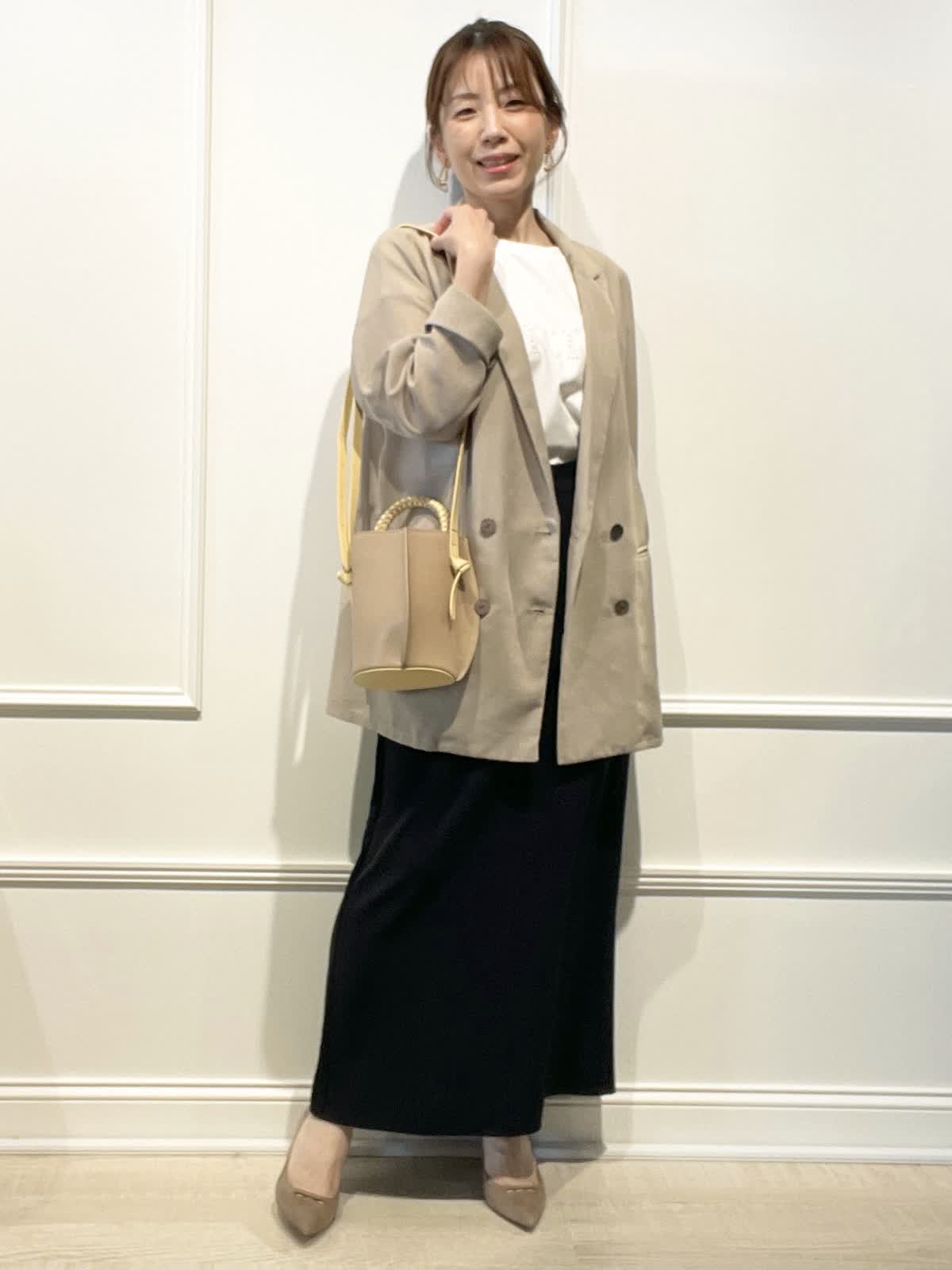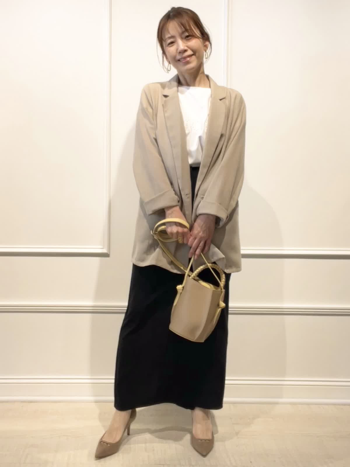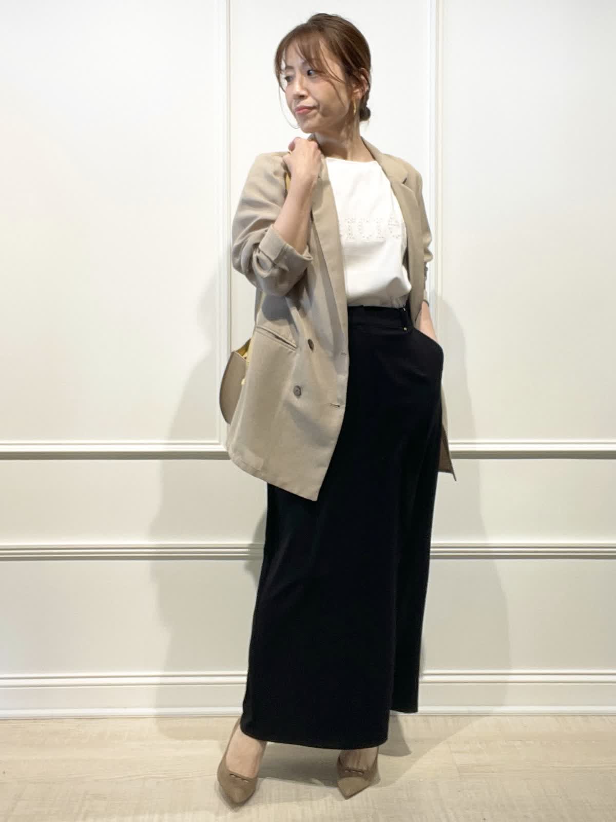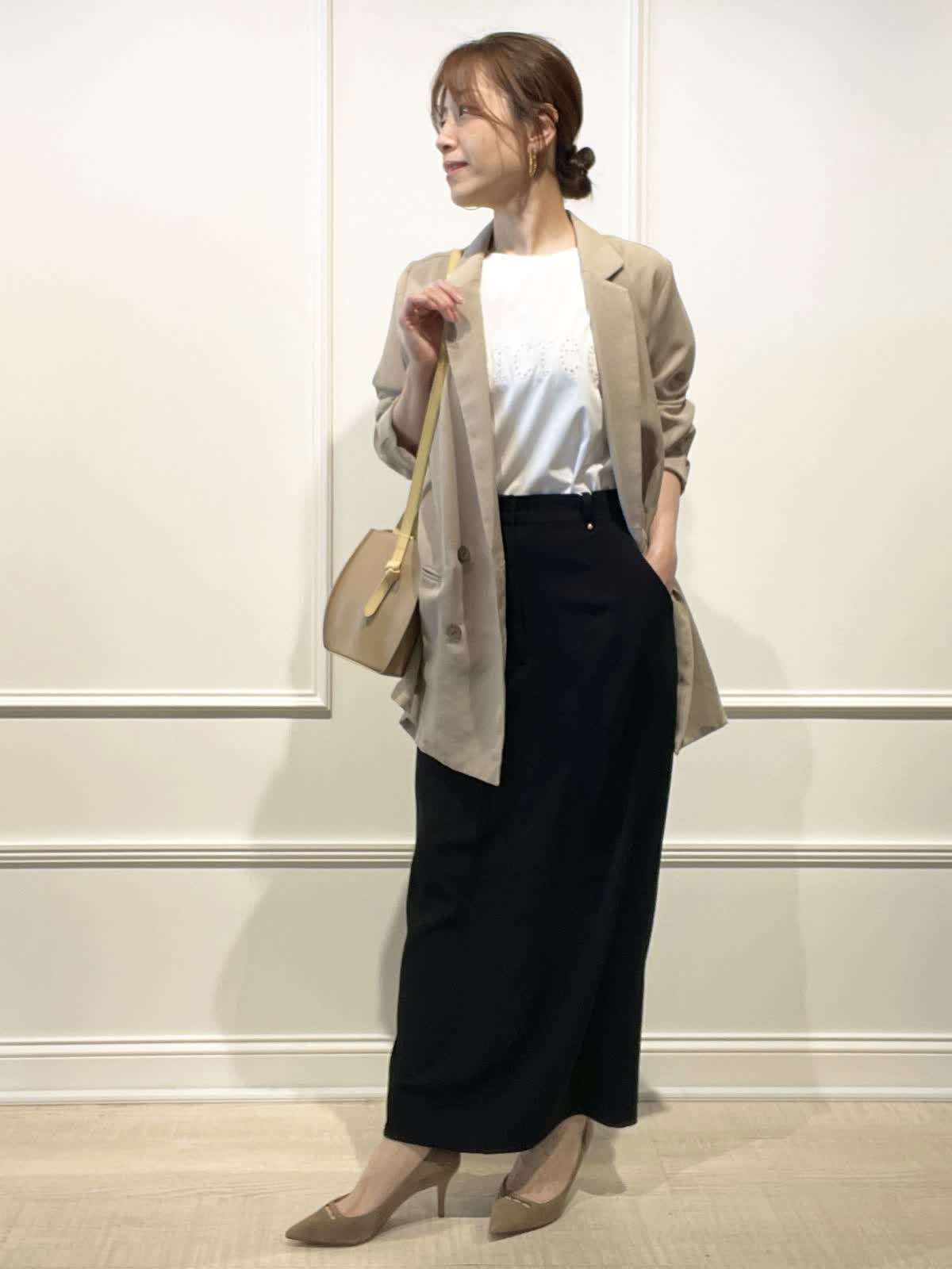 【着用アイテム:カラー/サイズ】 ジャケット:ベージュ/9号 Tシャツ:オフホワイト/9号 スカート:ブラック/9号 夏まで着れるシアー素材のダブルブレスト。インナー次第でカジュアルにも着回せます。カットワークTシャツは、スムース生地でサラリとした着心地。スカートはストレッチ性があり動きやすく、接触冷感、UV効果などもある夏に嬉しいロングタイトです。