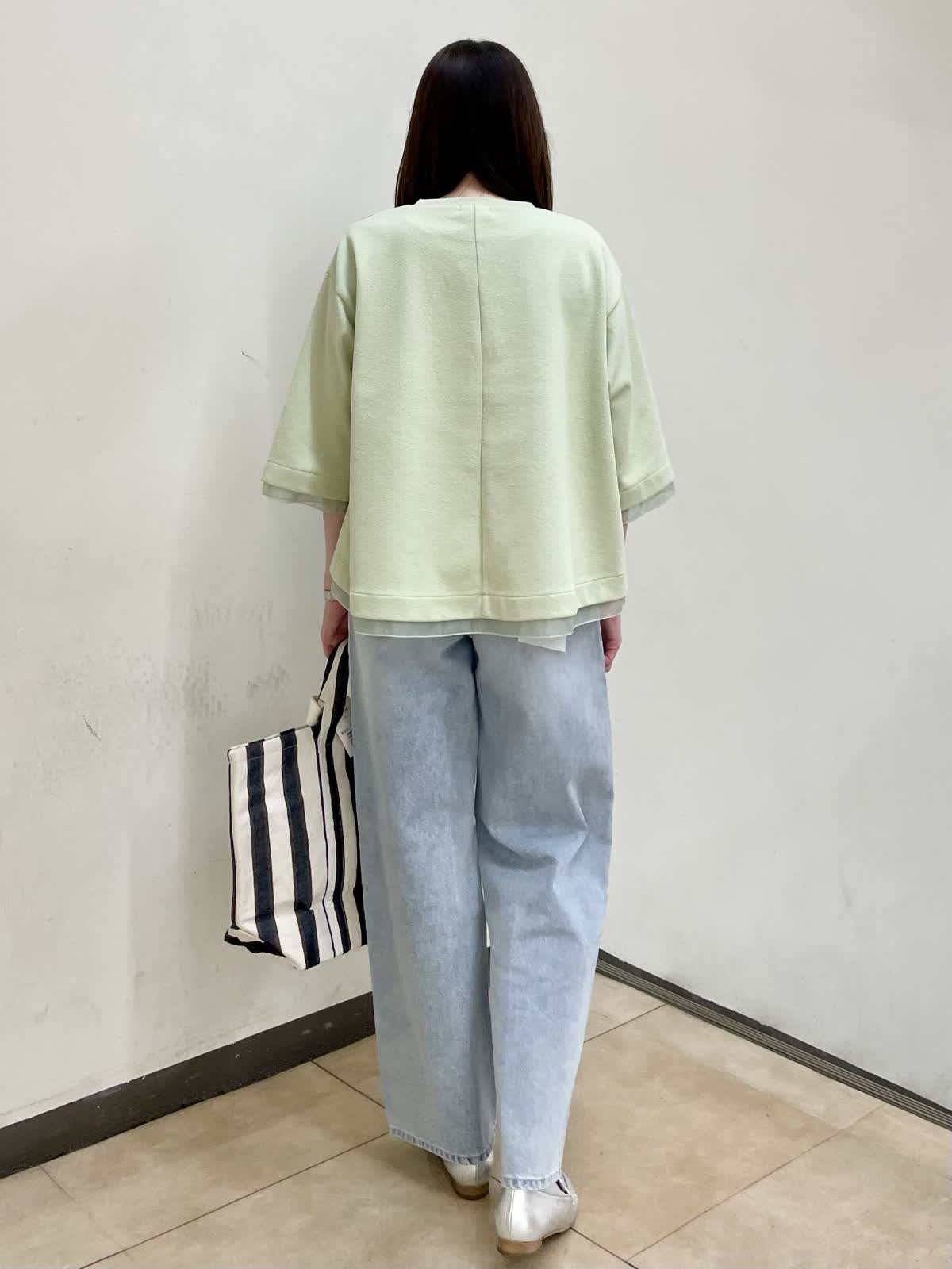 【着用サイズ】カットソー:フリー パンツ:11号 袖口と裾に施されたシアーがポイントのプルオーバー。ゆったりシルエットで前後差のあるデザイン。春らしいカラーがデニムにも合います。