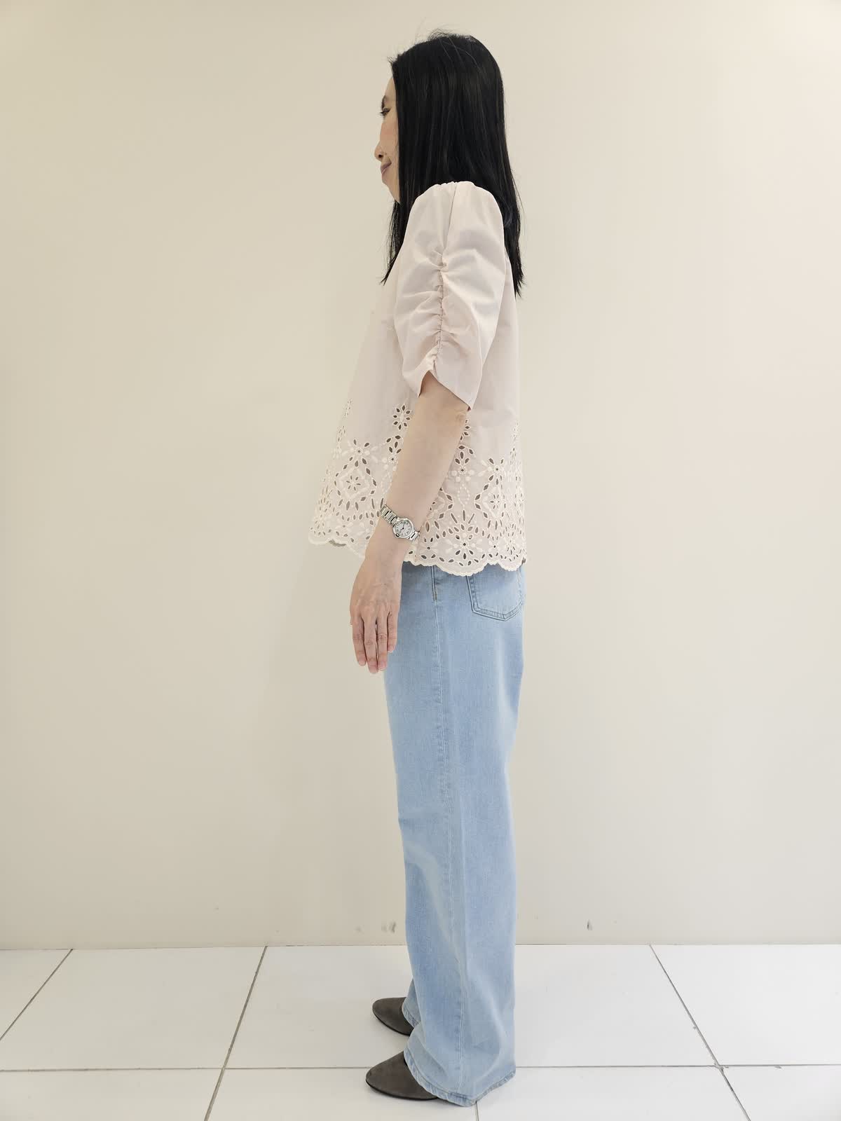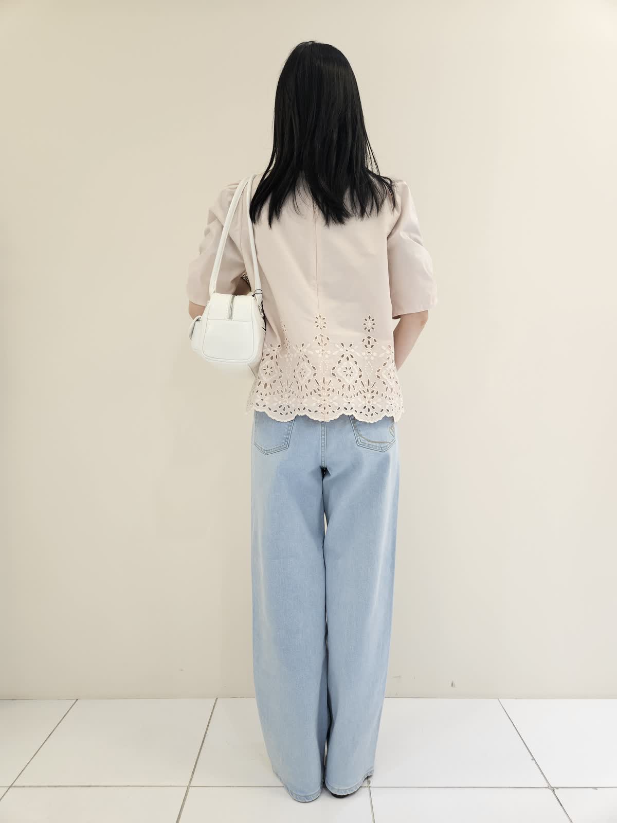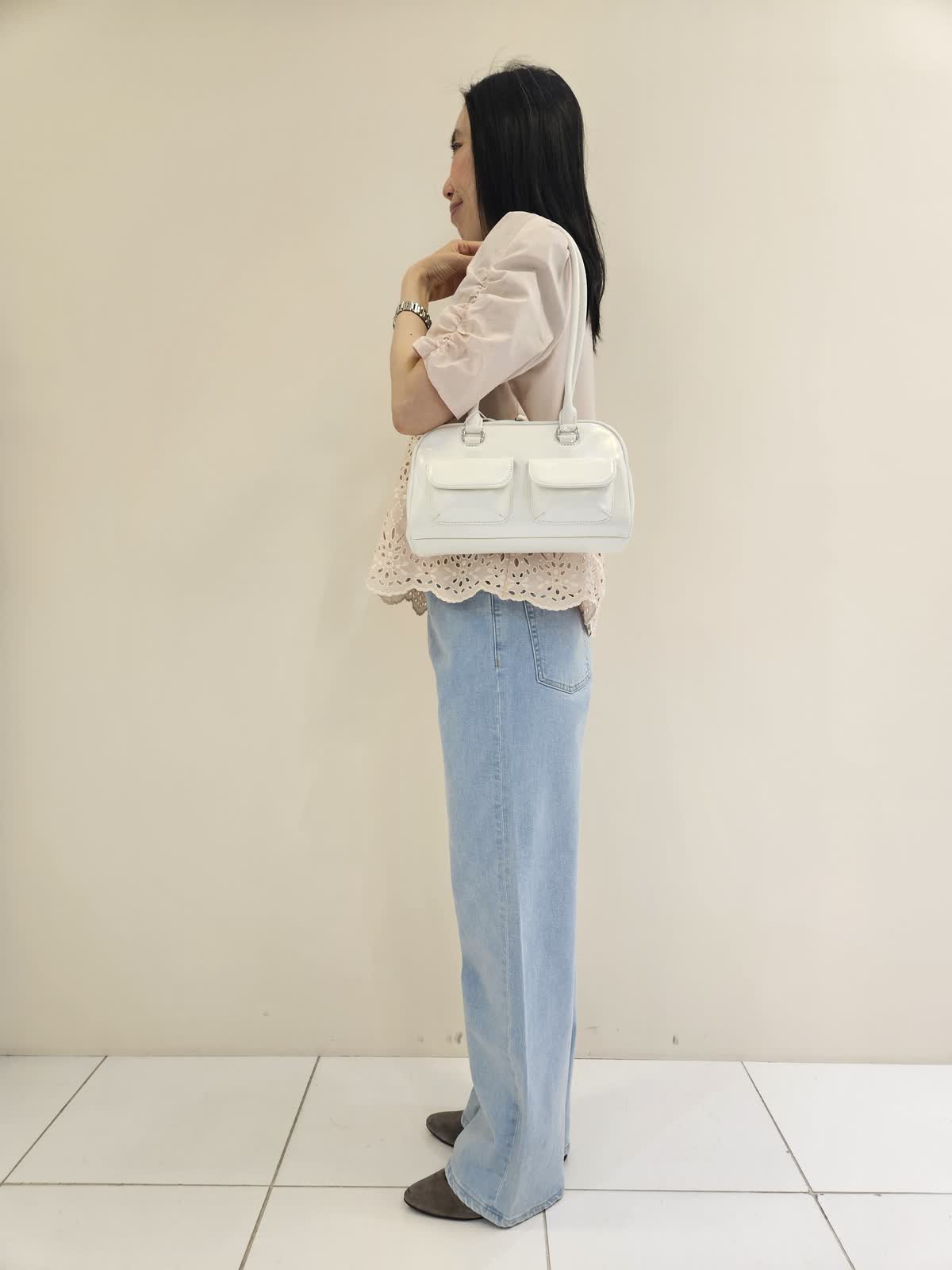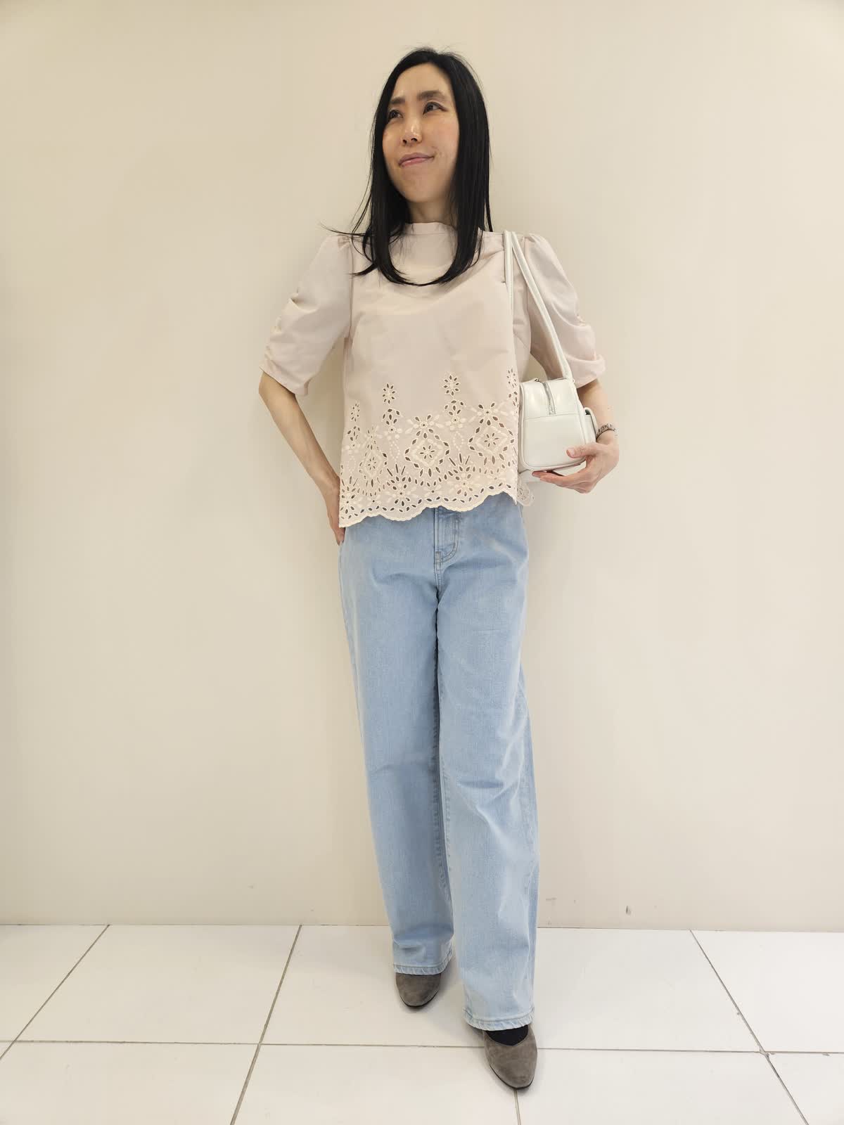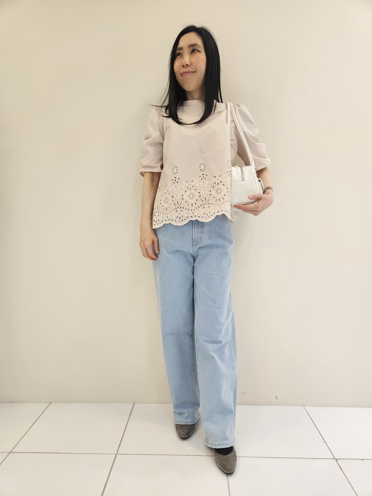 【着用サイズ・カラー】ブラウス:ピンク9号・パンツ:サックス9号 ・バッグ:ホワイト フリー 今からの季節にお勧めの柔らかい色のブラウスはデザインが目を引きカーディガンのインナーにも◎ デニムは後ろのポケットのハートの刺繍がマーリエらしくトップスもカットソー合わせもお勧めです。バッグは肩かけもしやすく軽いです。