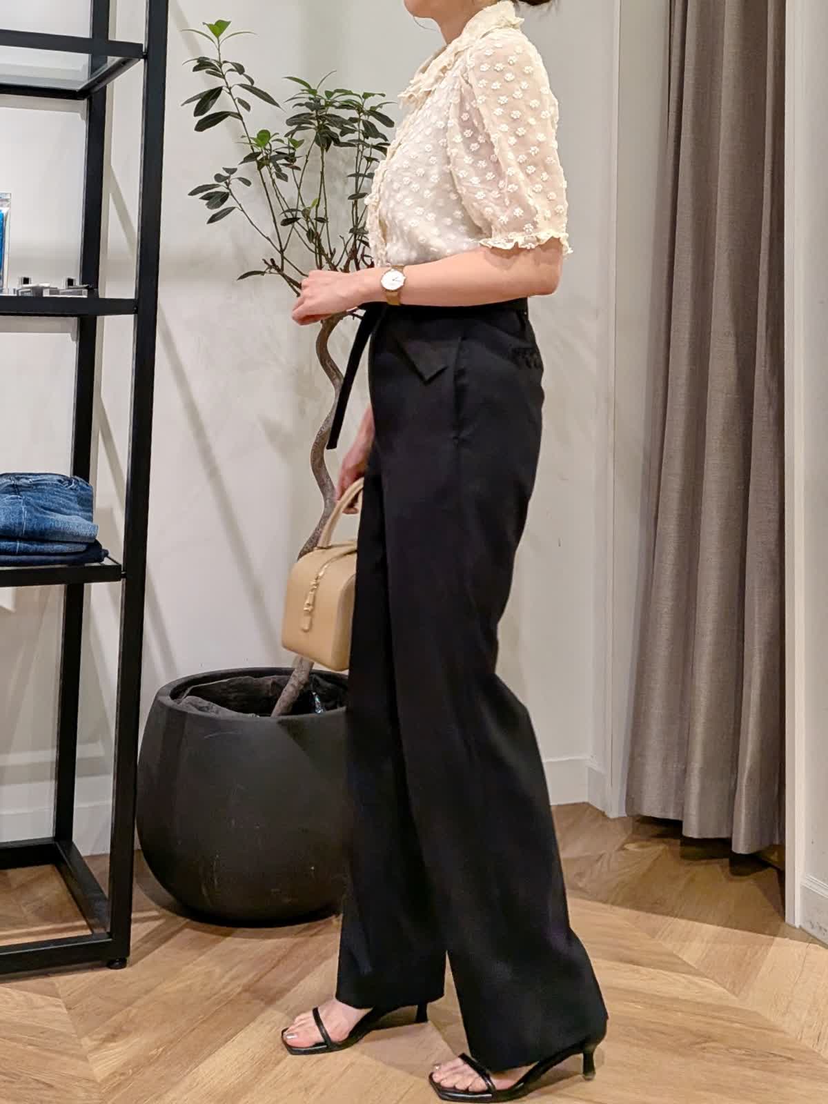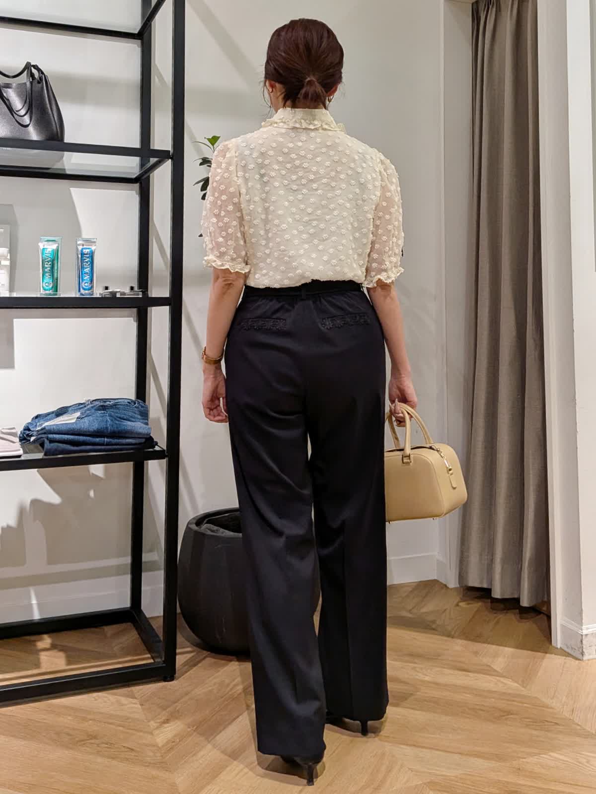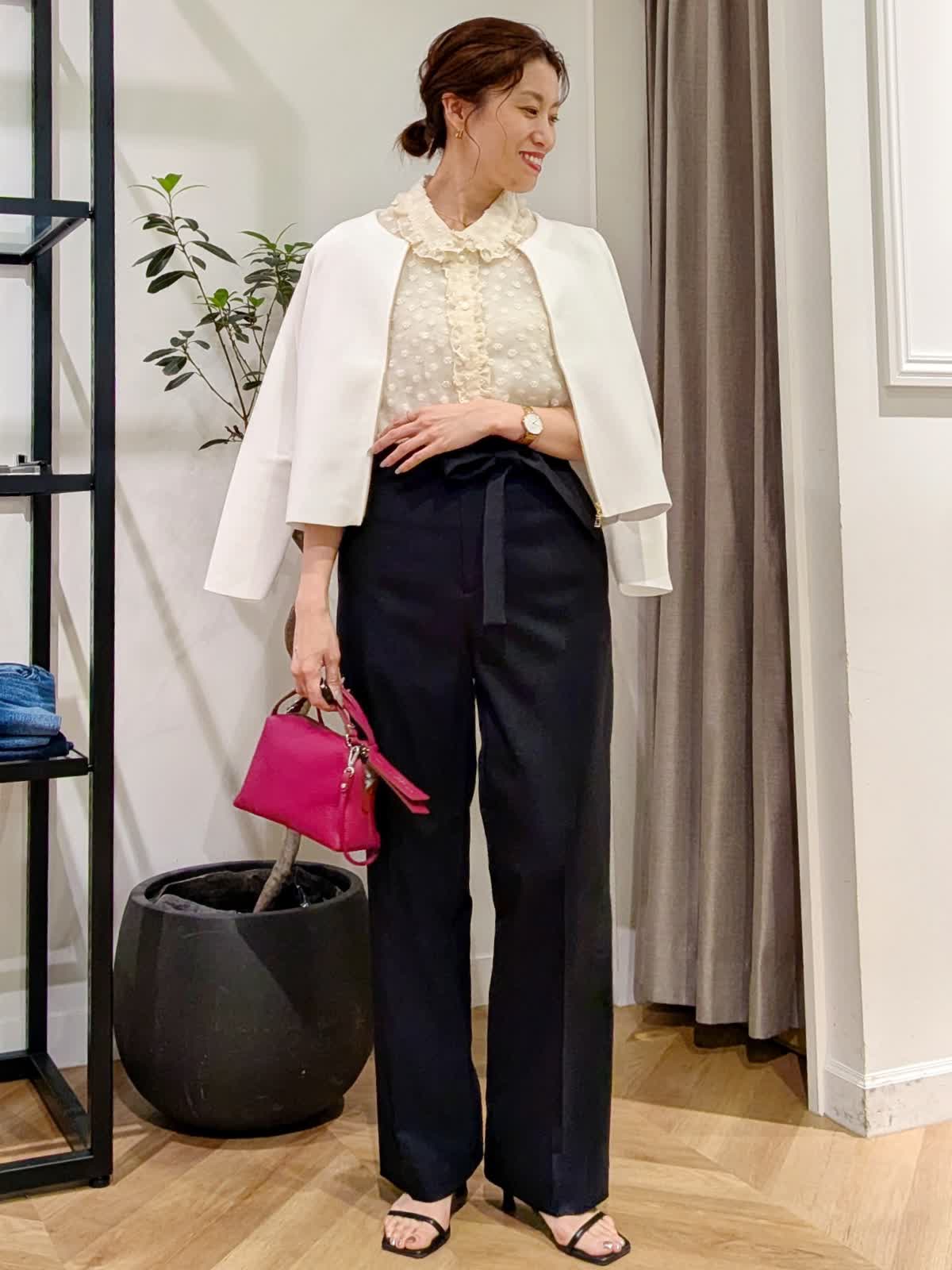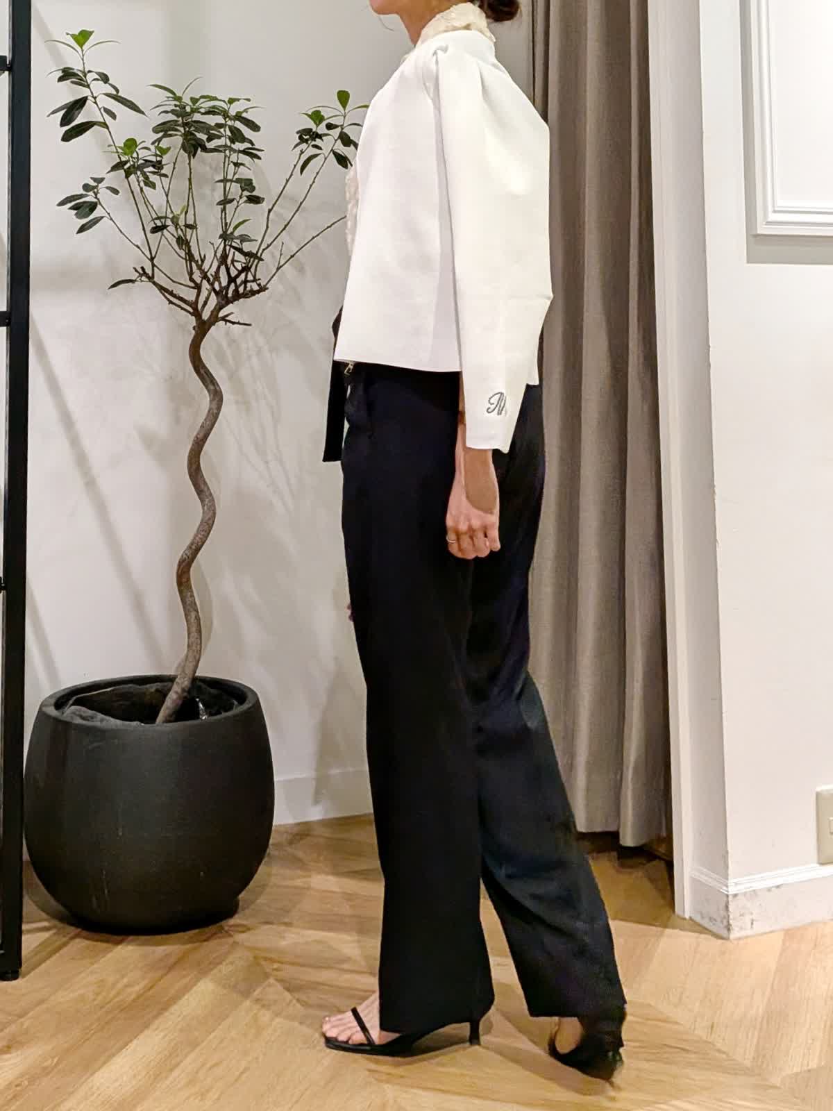 【着用サイズ】ブラウス?オフホワイト?9号 パンツ?ブラック?9号 カーデガン?オフホワイト?9号 冨張愛さんコラボシリーズ。凹凸のあるジャカードブラウス。身頃は裏地ありのほのかな透け感。襟元やボタンまで細かなディテールがさすがです。 パンツはストーレートラインでヒップにはフラワー刺繍。ブラックは同じブラックのフラワー刺繍なのでさり気ないポイントに。リボンベルトは少し細めなデザイン。華奢で上品な印象に。 左側手首に【М】刺繍が入った羽織りはジップタイプでジャケット、コート、カーデガンとして幅広く活躍する一着。ハリ感のあるしっかり素材です。 行事などキチンとした場面でも◎ 華やかかつ上品なコーディネート。