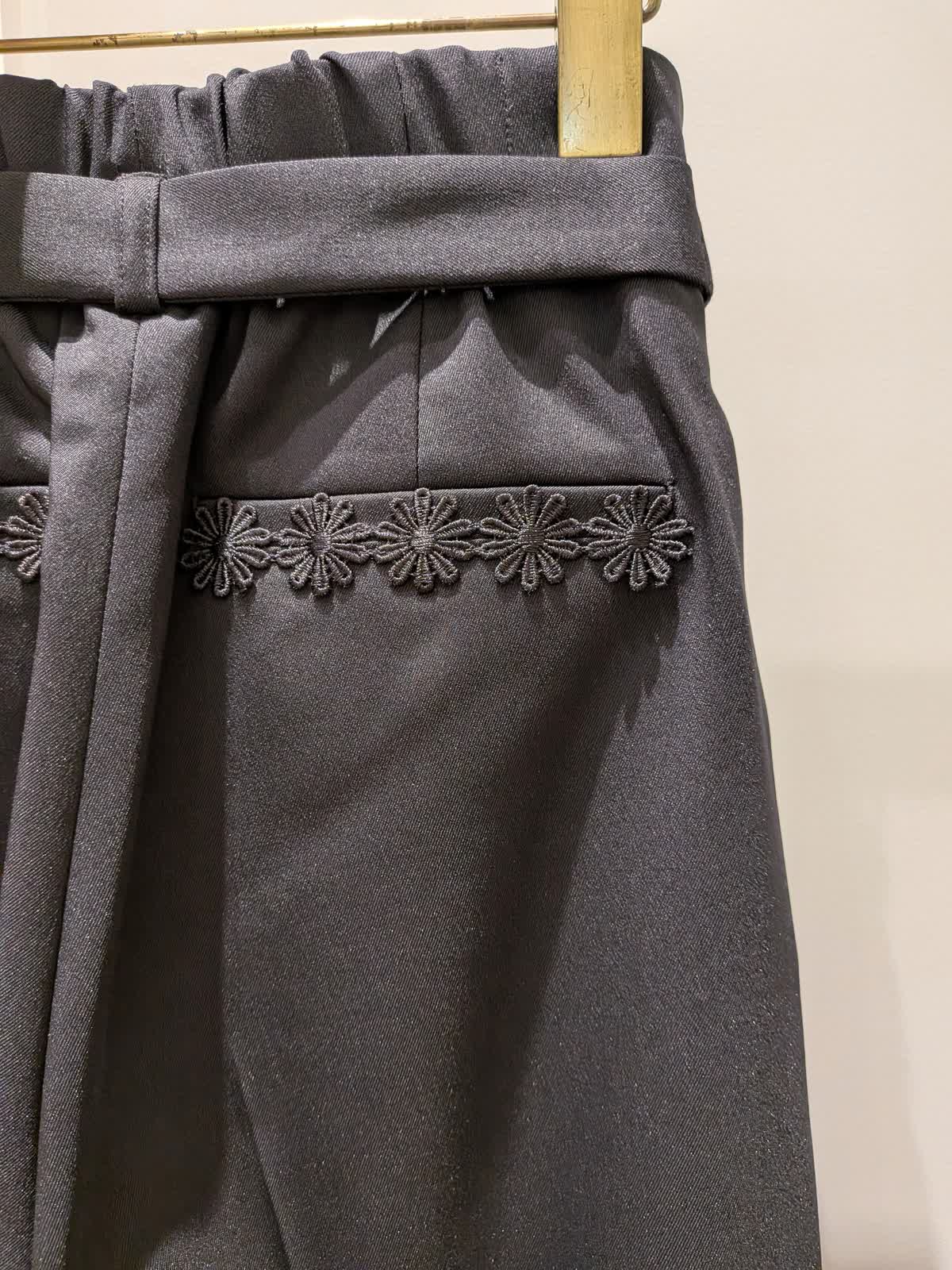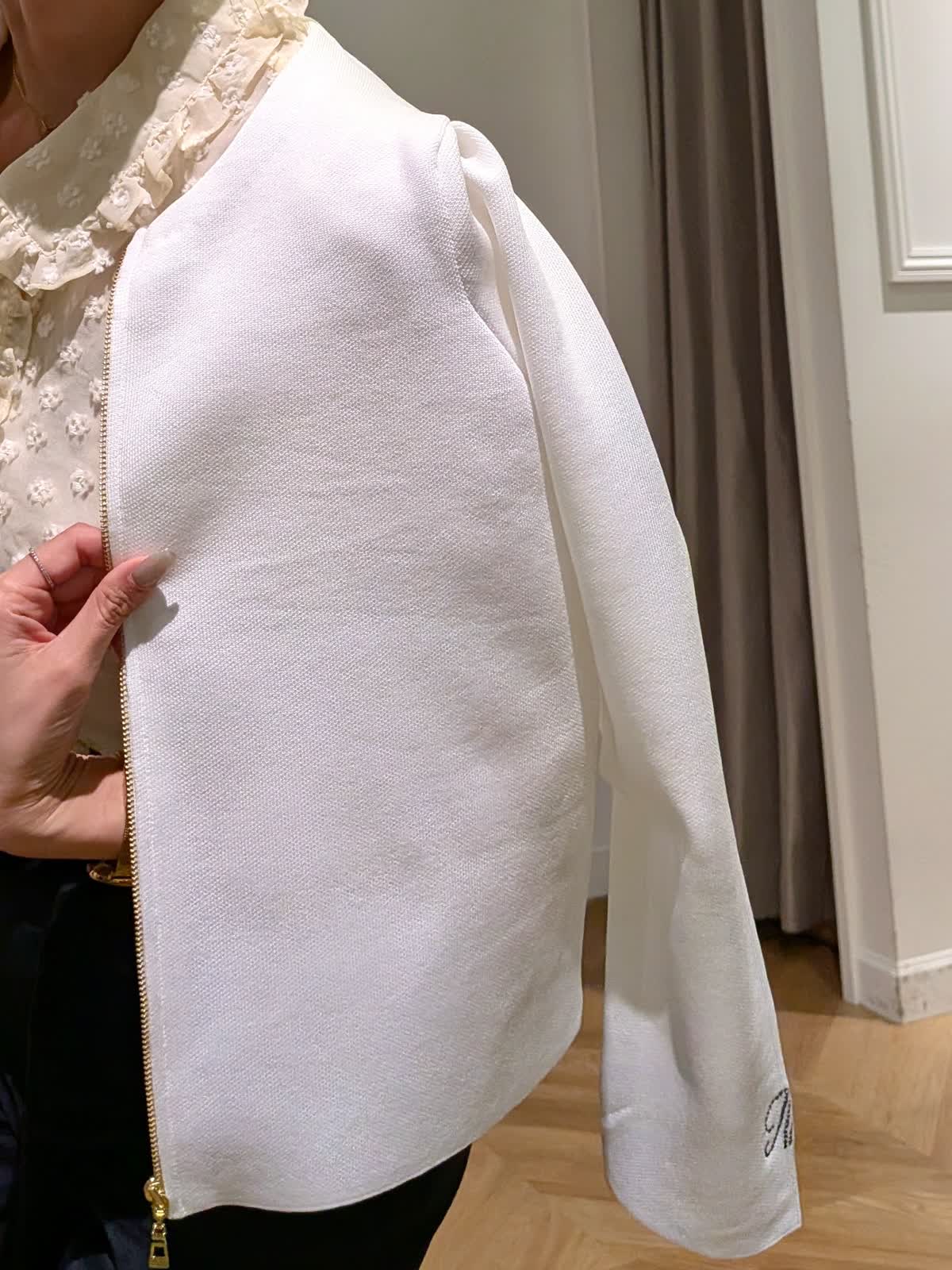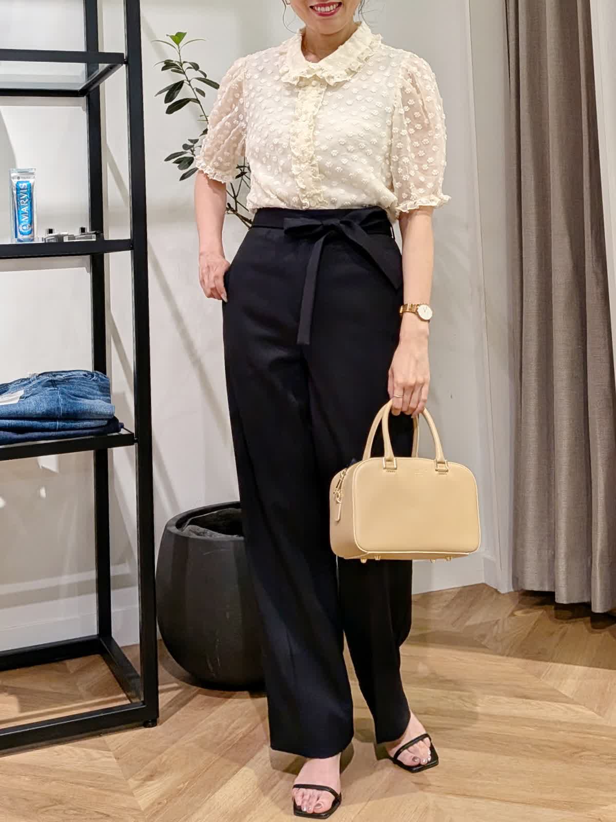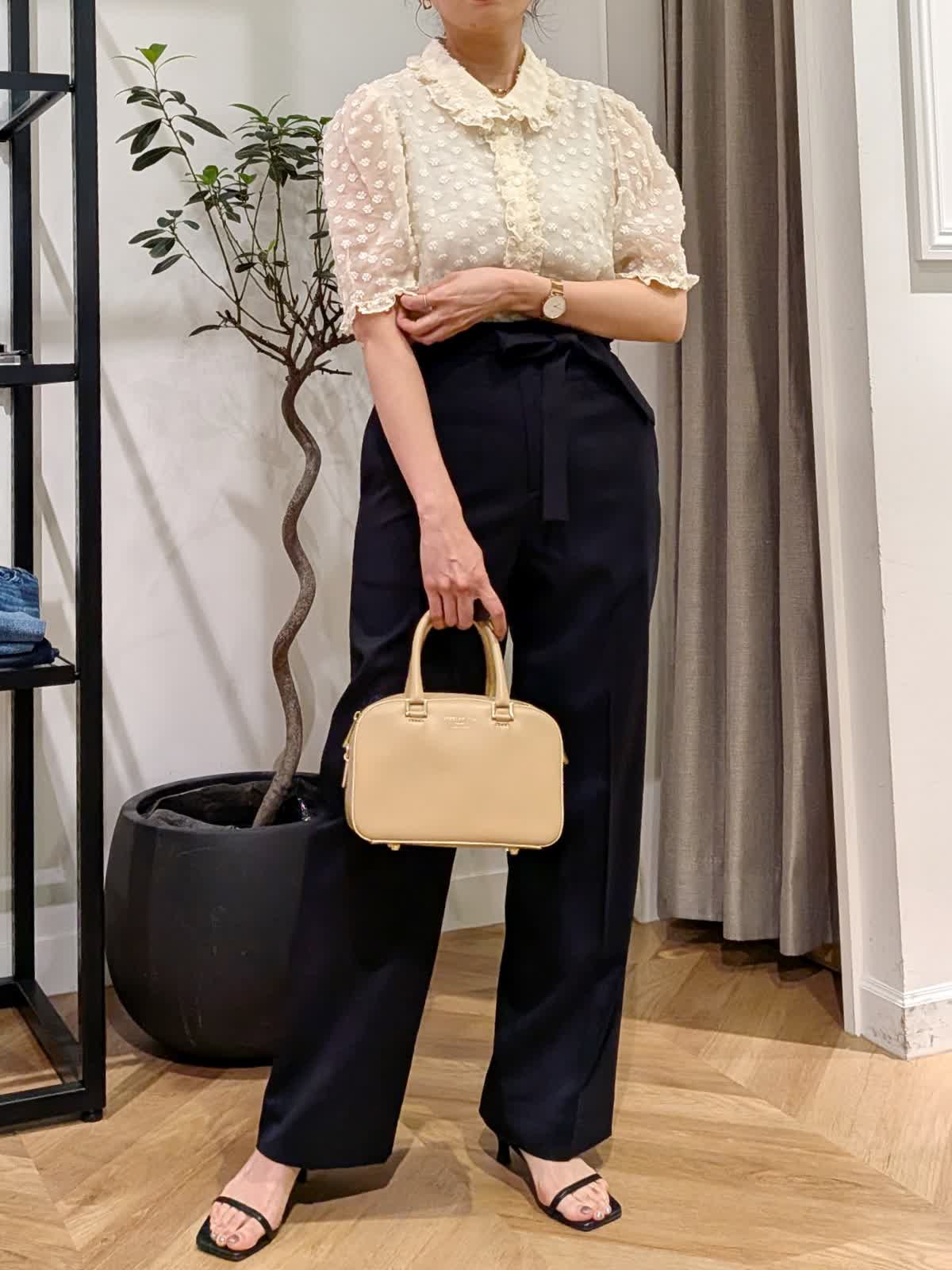 【着用サイズ】ブラウス?オフホワイト?9号 パンツ?ブラック?9号 カーデガン?オフホワイト?9号 冨張愛さんコラボシリーズ。凹凸のあるジャカードブラウス。身頃は裏地ありのほのかな透け感。襟元やボタンまで細かなディテールがさすがです。 パンツはストーレートラインでヒップにはフラワー刺繍。ブラックは同じブラックのフラワー刺繍なのでさり気ないポイントに。リボンベルトは少し細めなデザイン。華奢で上品な印象に。 左側手首に【М】刺繍が入った羽織りはジップタイプでジャケット、コート、カーデガンとして幅広く活躍する一着。ハリ感のあるしっかり素材です。 行事などキチンとした場面でも◎ 華やかかつ上品なコーディネート。