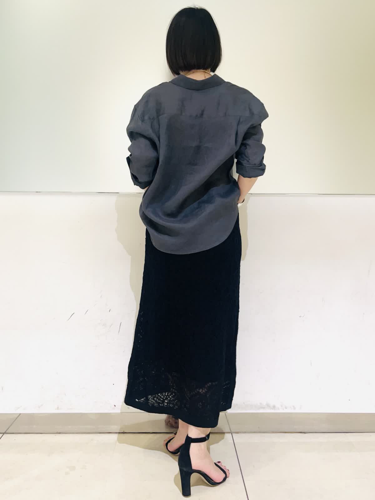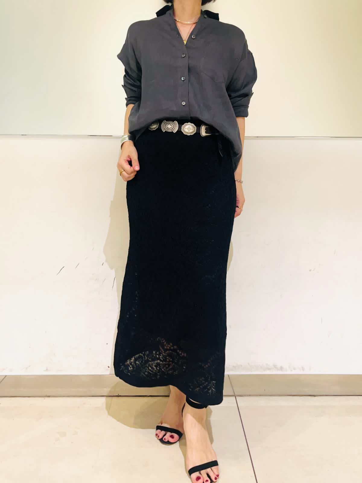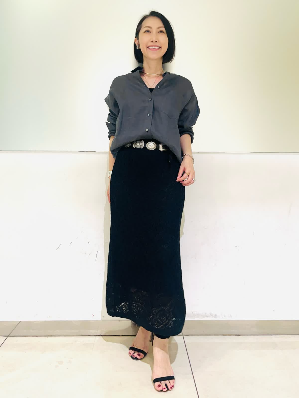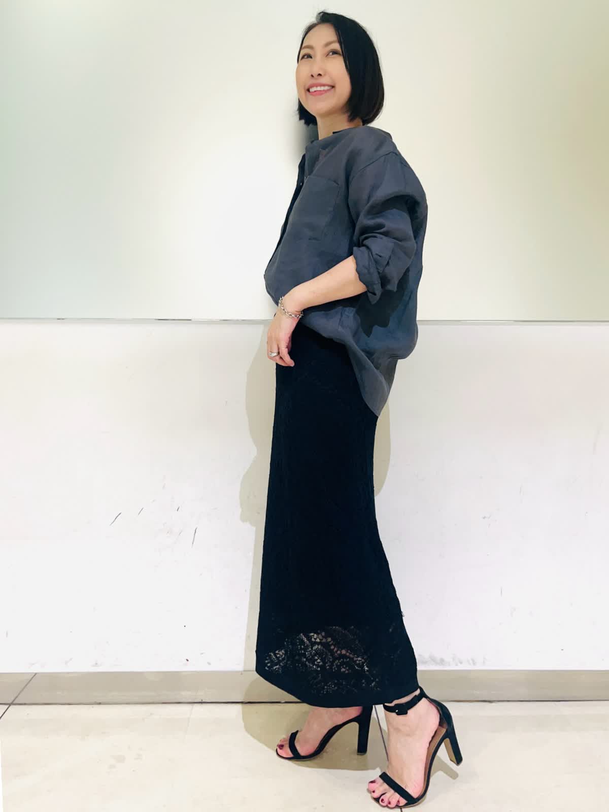 【着用アイテム】すべて9号 【着用カラー】シャツ:チャコールグレー スカート:ブラック 大人のモノトーンコーディネート。夏のブラックコーデのポイントは素材。リネンシャツならダークトーンでも重くてなり過ぎず、涼しげな雰囲気に仕上がります。チャコールグレーのシックなカラーのリネンシャツに、レース編みのニットスカートを合わせたシックな大人の上品スタイリングです。