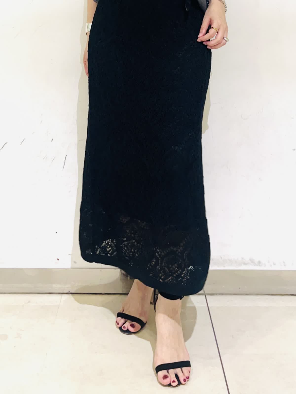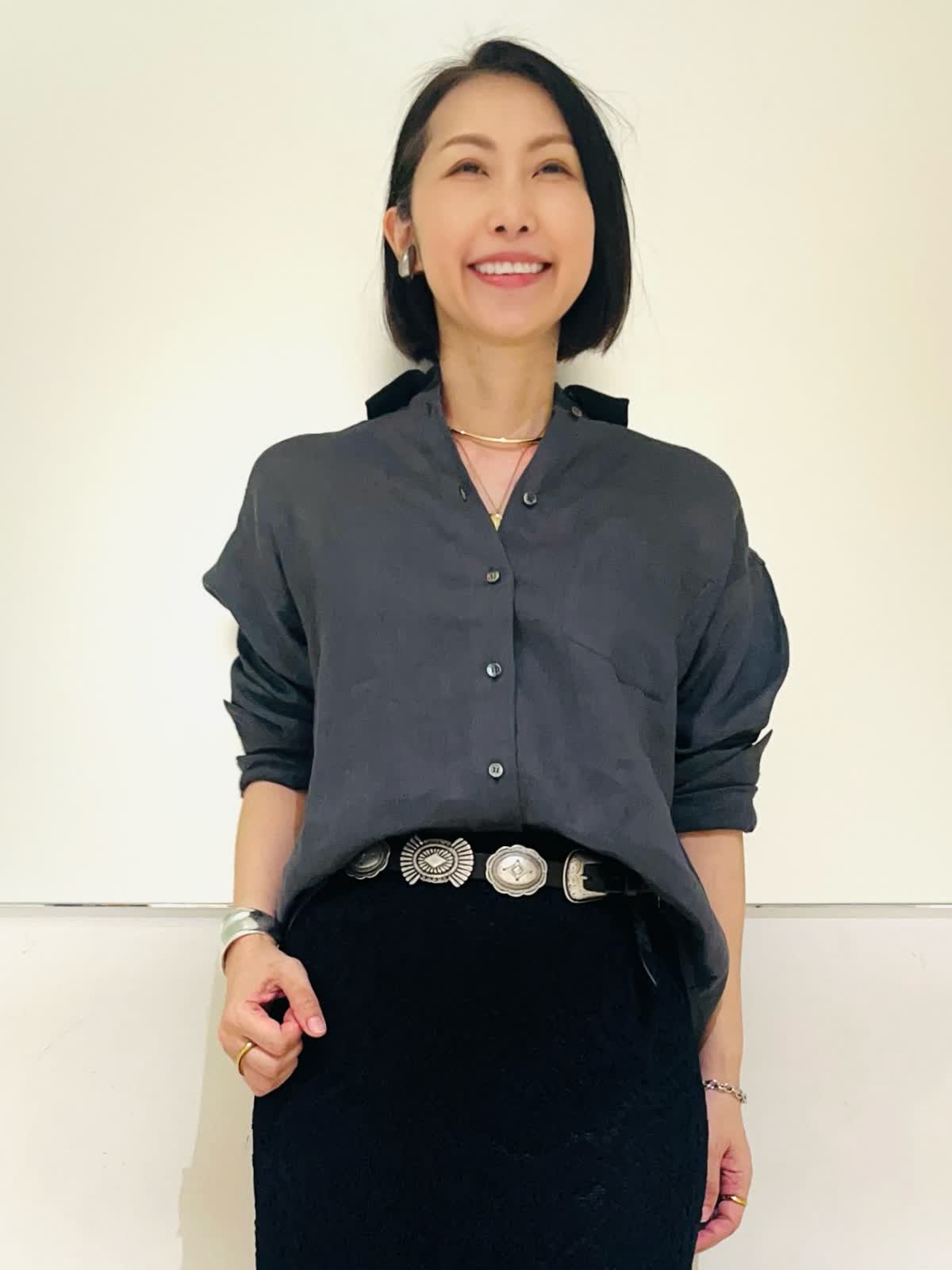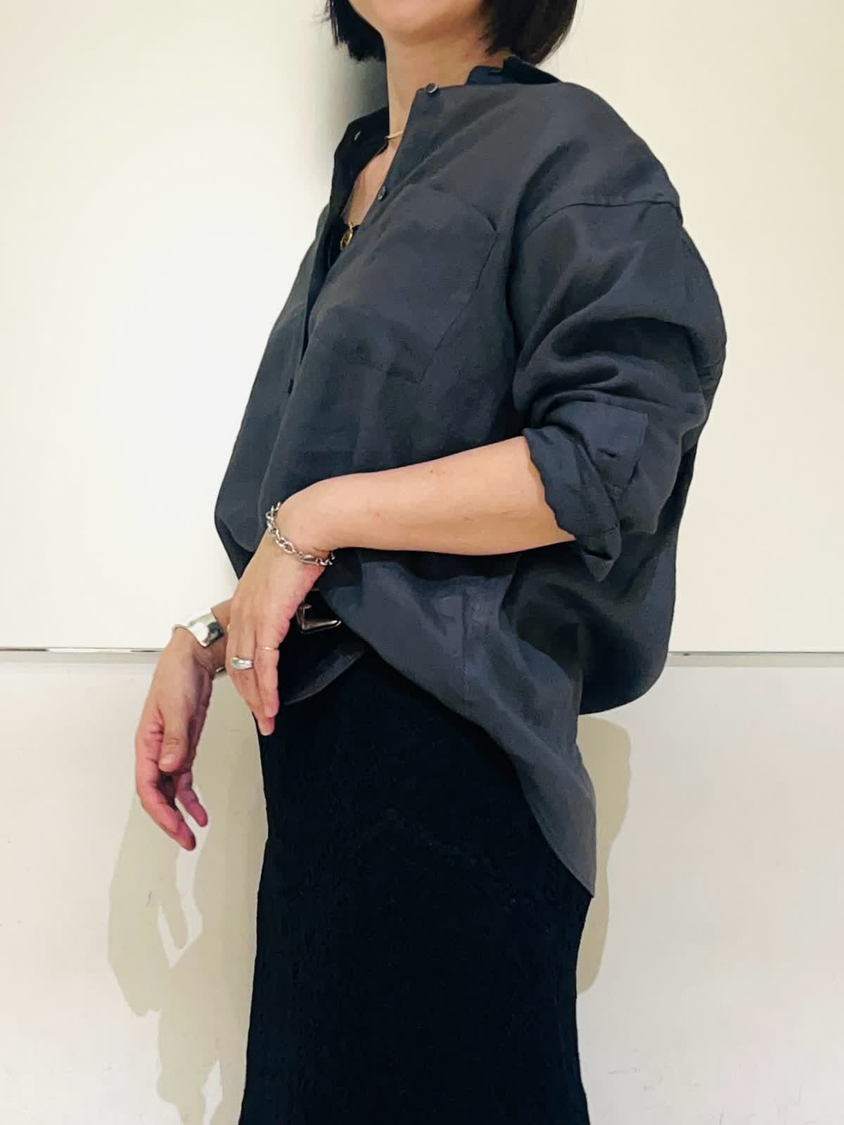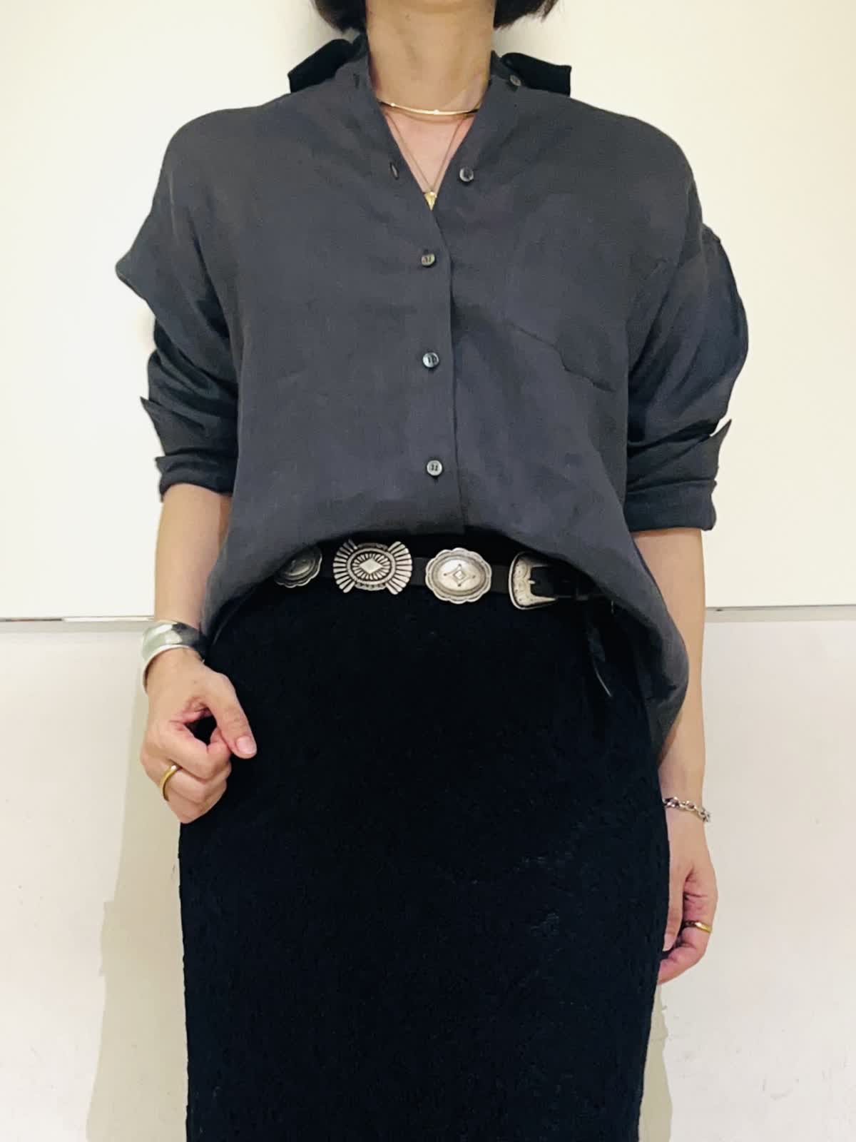 【着用アイテム】すべて9号 【着用カラー】シャツ:チャコールグレー スカート:ブラック 大人のモノトーンコーディネート。夏のブラックコーデのポイントは素材。リネンシャツならダークトーンでも重くてなり過ぎず、涼しげな雰囲気に仕上がります。チャコールグレーのシックなカラーのリネンシャツに、レース編みのニットスカートを合わせたシックな大人の上品スタイリングです。