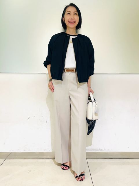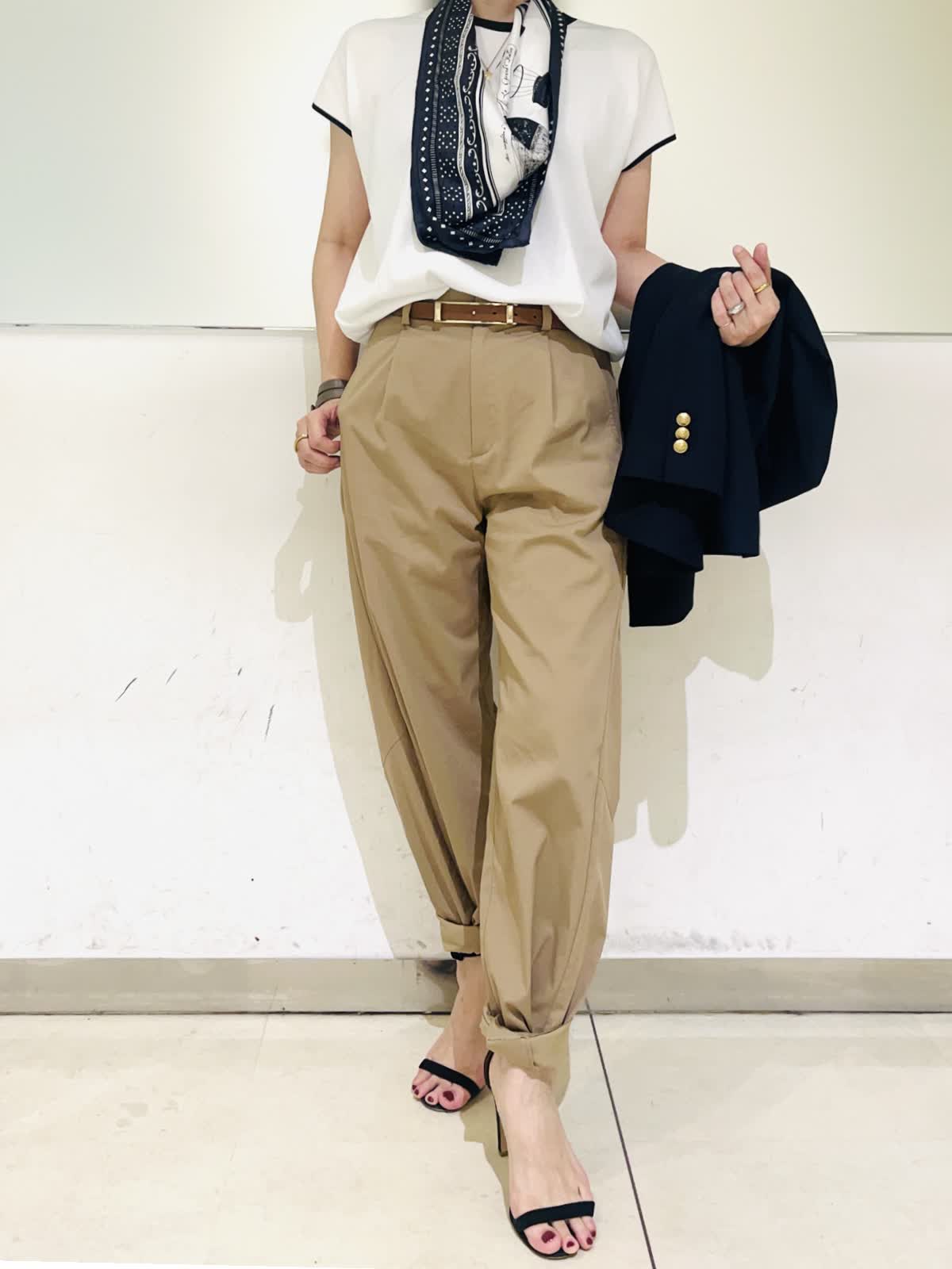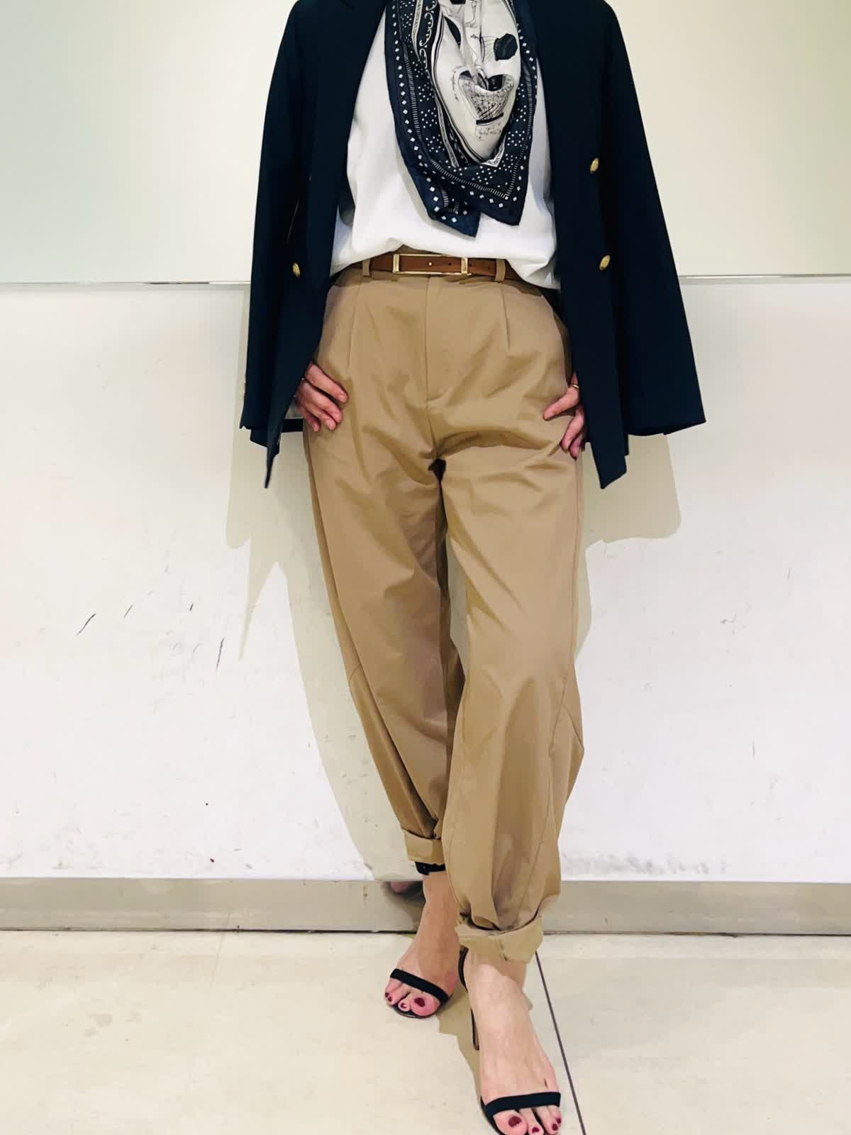 【着用アイテム】すべて9号 【着用カラー】ニット:オフホワイト パンツ:キャメル ジャケット:ネイビー リアルバイして大活躍中のバレルパンツ。裾をくるっと折り曲げて履くといつもと違った雰囲気に。ネイビーの配色がアクセントになるニットと合わせました。1枚で着てもサマになるし、ジャケットインにもしやすくこれからの季節にヘビロテしそうなニットです。