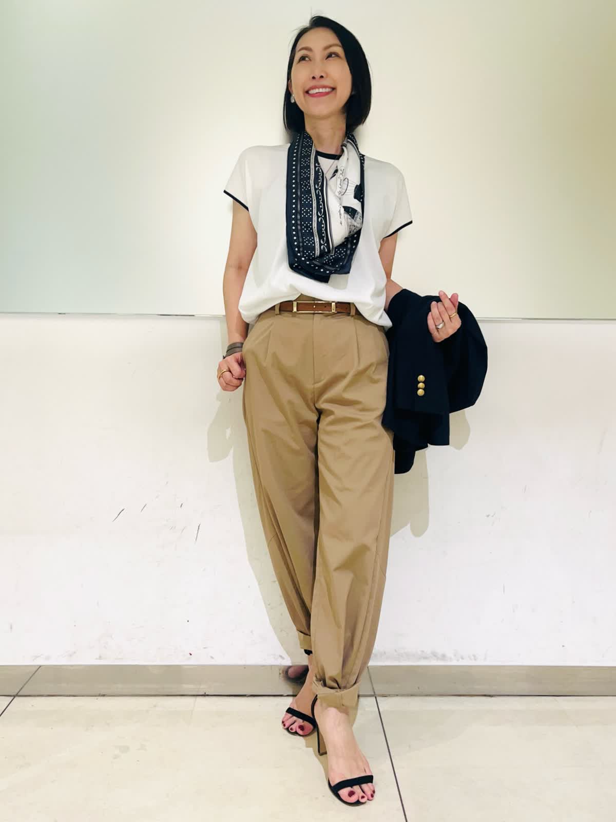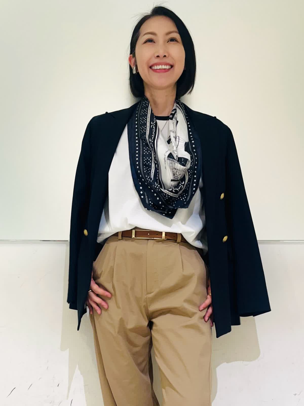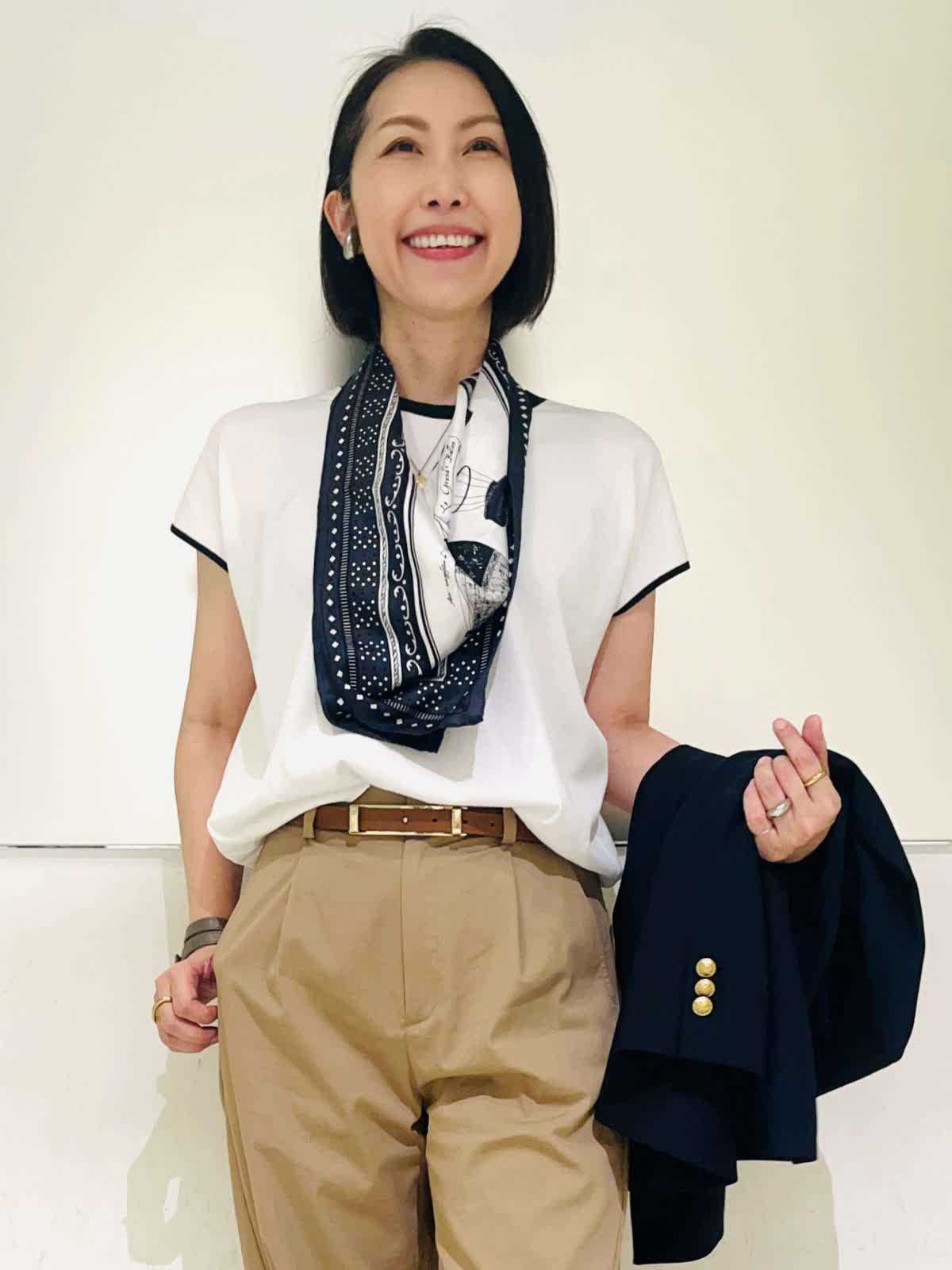 【着用アイテム】すべて9号 【着用カラー】ニット:オフホワイト パンツ:キャメル ジャケット:ネイビー リアルバイして大活躍中のバレルパンツ。裾をくるっと折り曲げて履くといつもと違った雰囲気に。ネイビーの配色がアクセントになるニットと合わせました。1枚で着てもサマになるし、ジャケットインにもしやすくこれからの季節にヘビロテしそうなニットです。