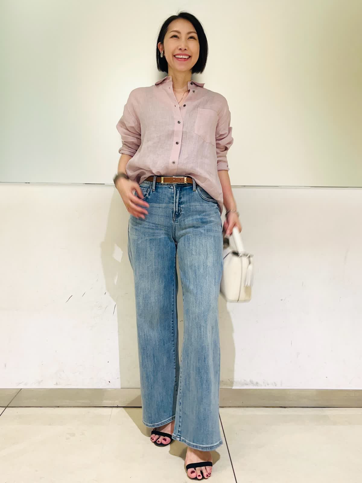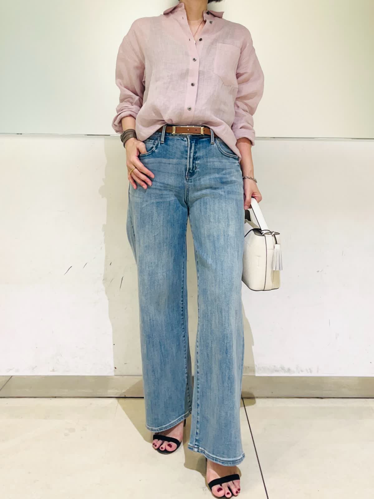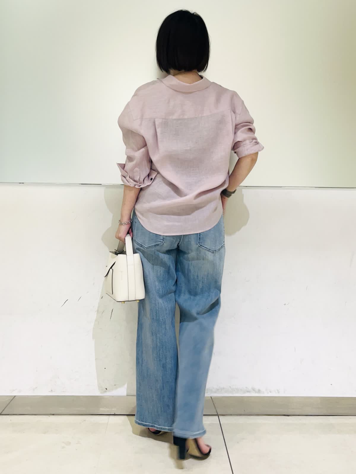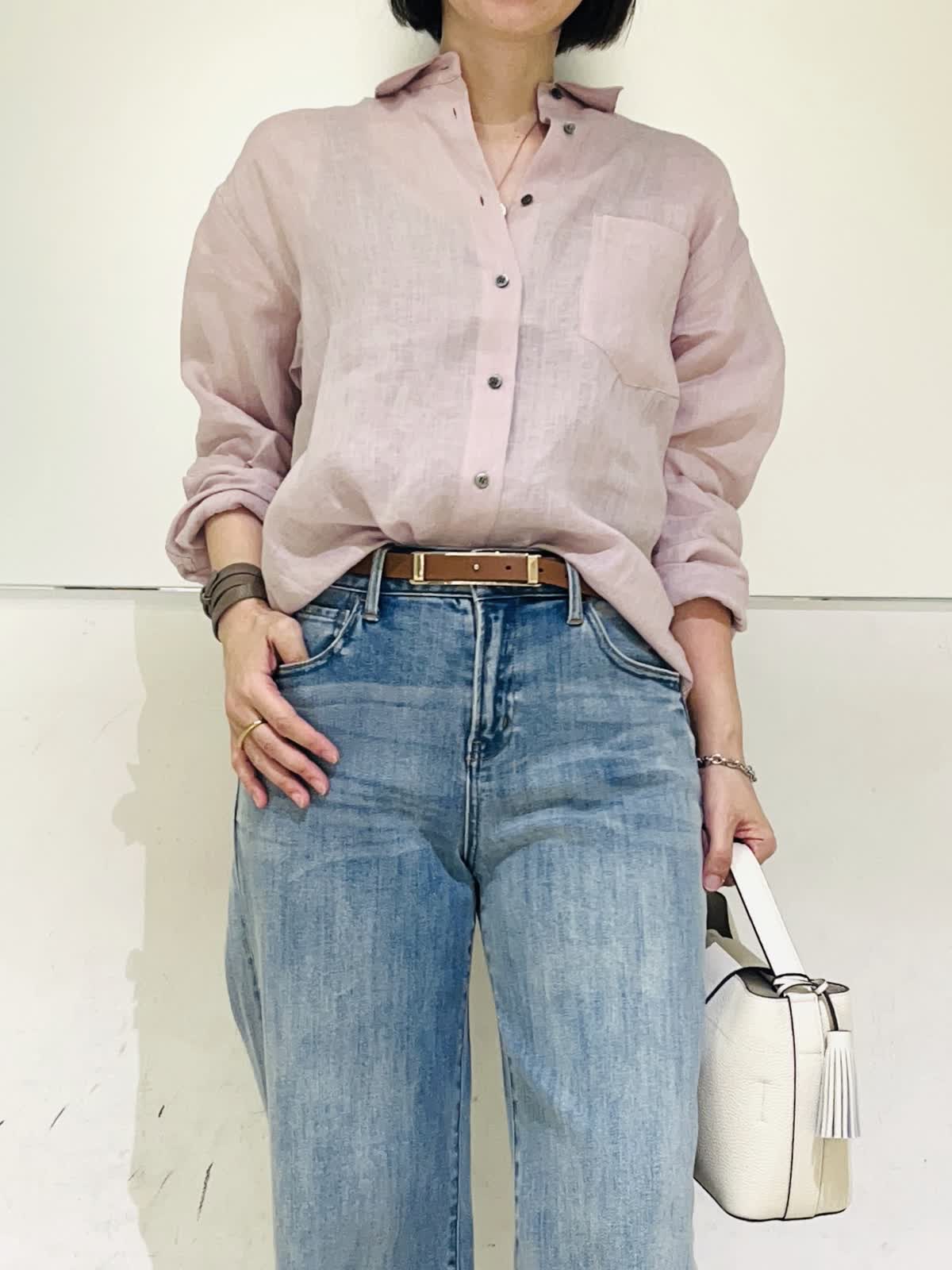 【着用アイテム】すべて9号 【着用カラー】シャツ:ピンク パンツ:サックス 初夏のカジュアルお出かけコーディネート。グレイッシュなピンクは大人女子にも取り入れやすいカラー。リネンシャツならシャープな雰囲気でよりチャレンジしやすいです。洗いのかかった薄いカラーのデニムを合わせた大人可愛いカジュアルスタイリングです。