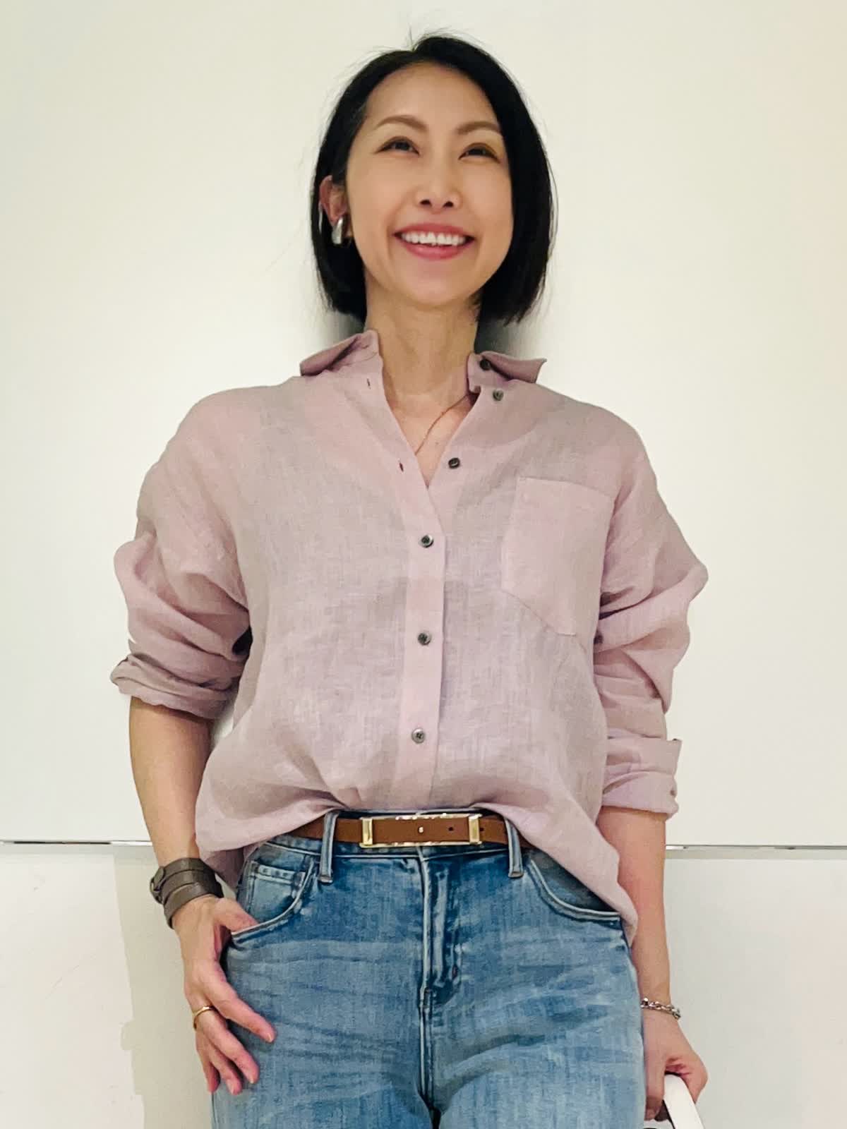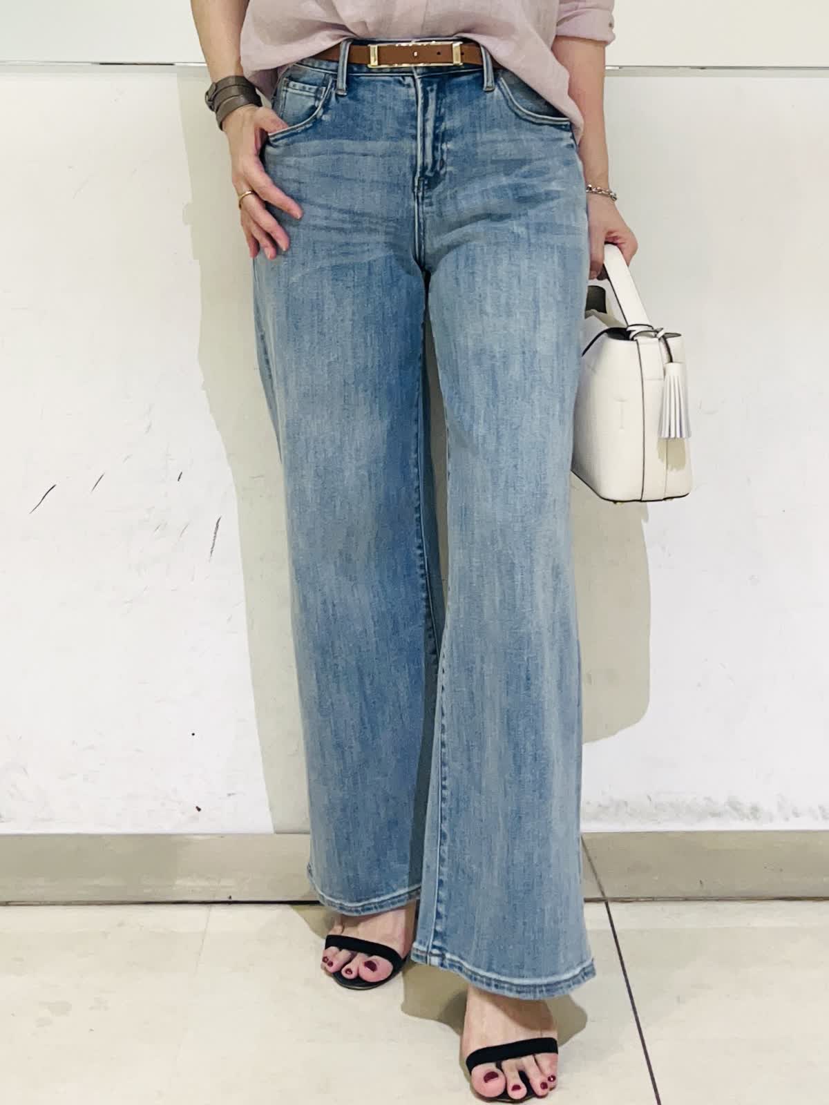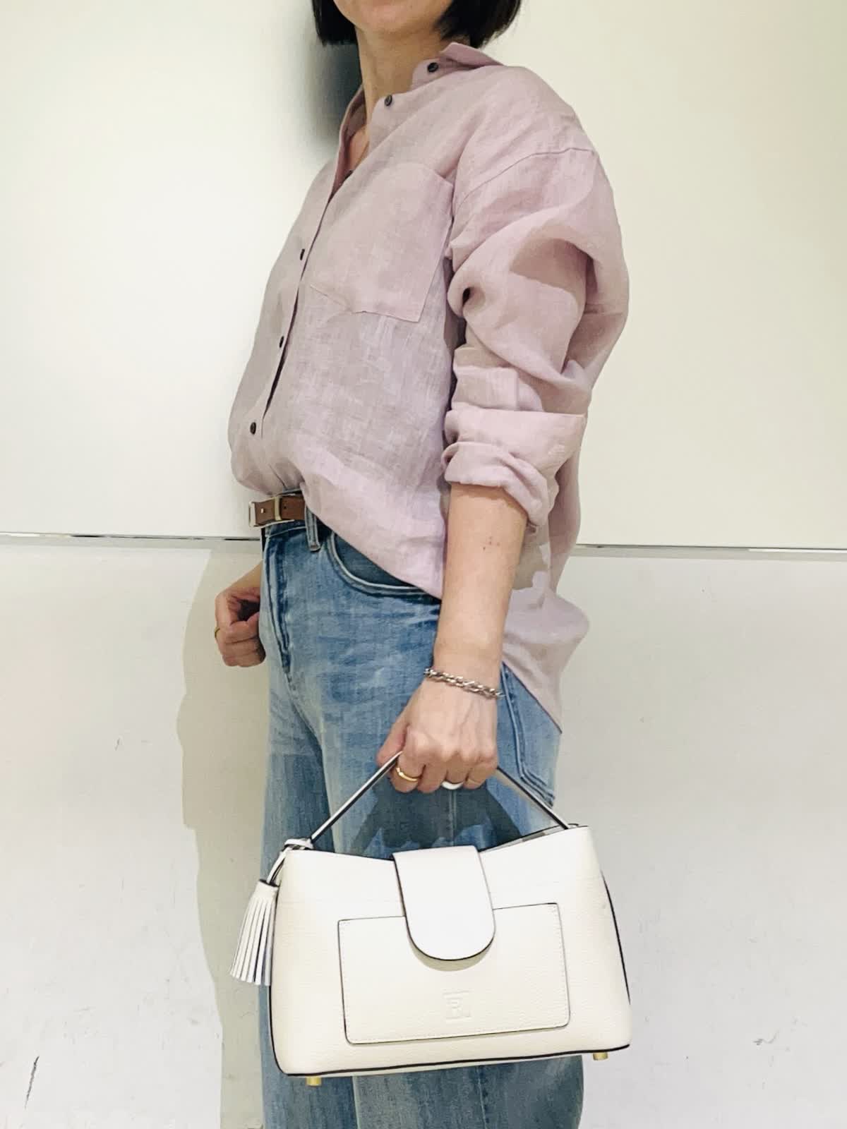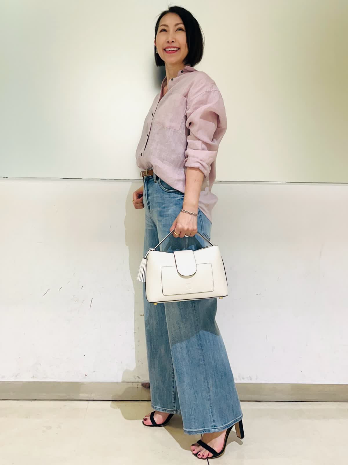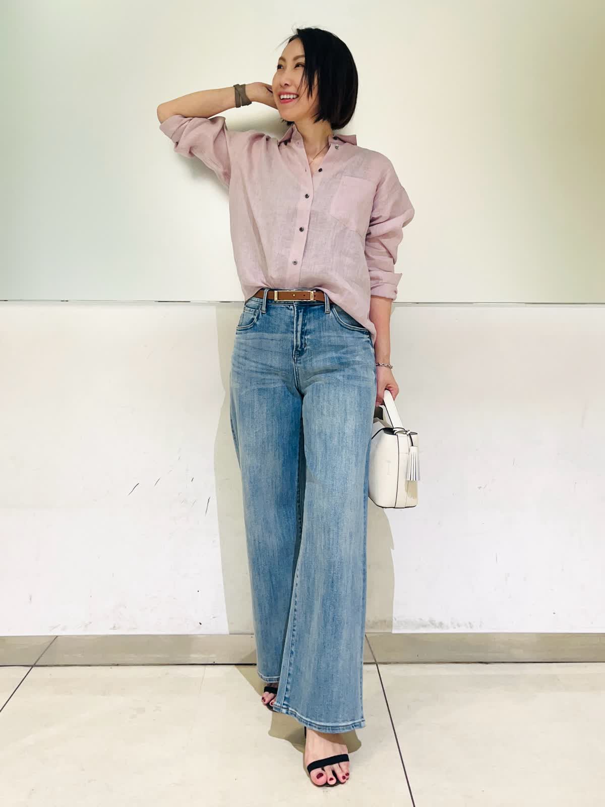 【着用アイテム】すべて9号 【着用カラー】シャツ:ピンク パンツ:サックス 初夏のカジュアルお出かけコーディネート。グレイッシュなピンクは大人女子にも取り入れやすいカラー。リネンシャツならシャープな雰囲気でよりチャレンジしやすいです。洗いのかかった薄いカラーのデニムを合わせた大人可愛いカジュアルスタイリングです。