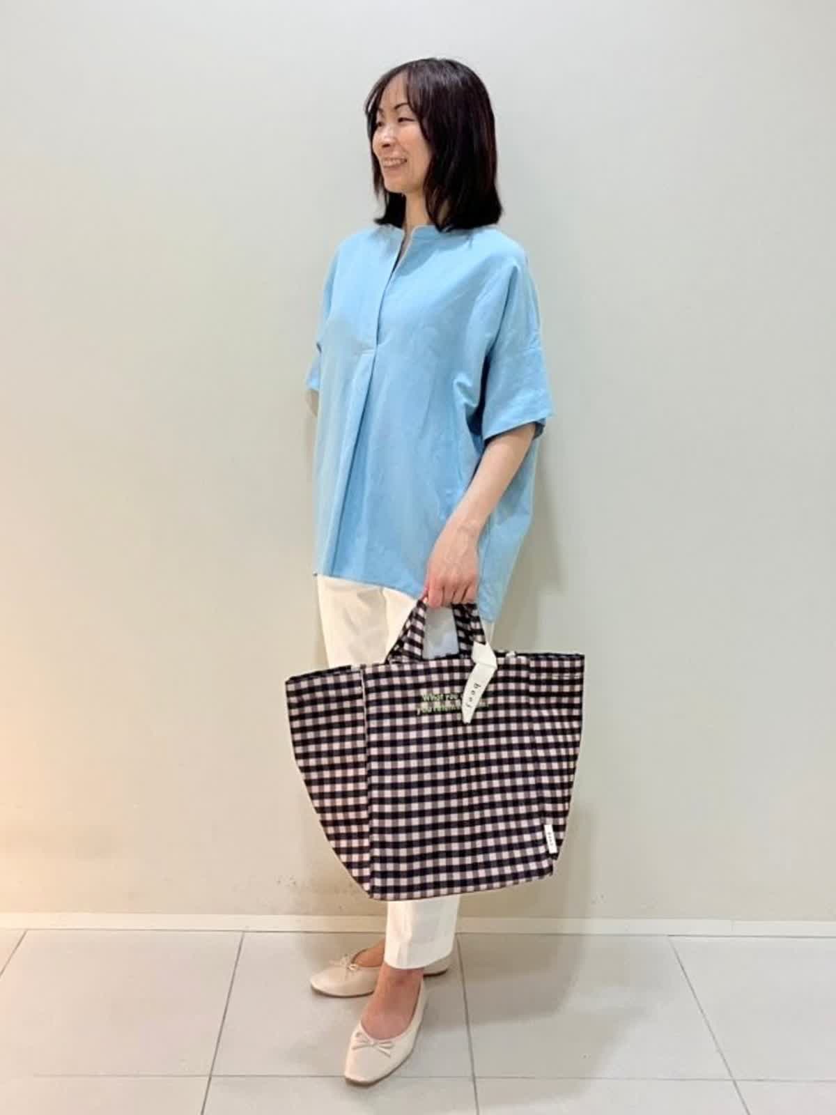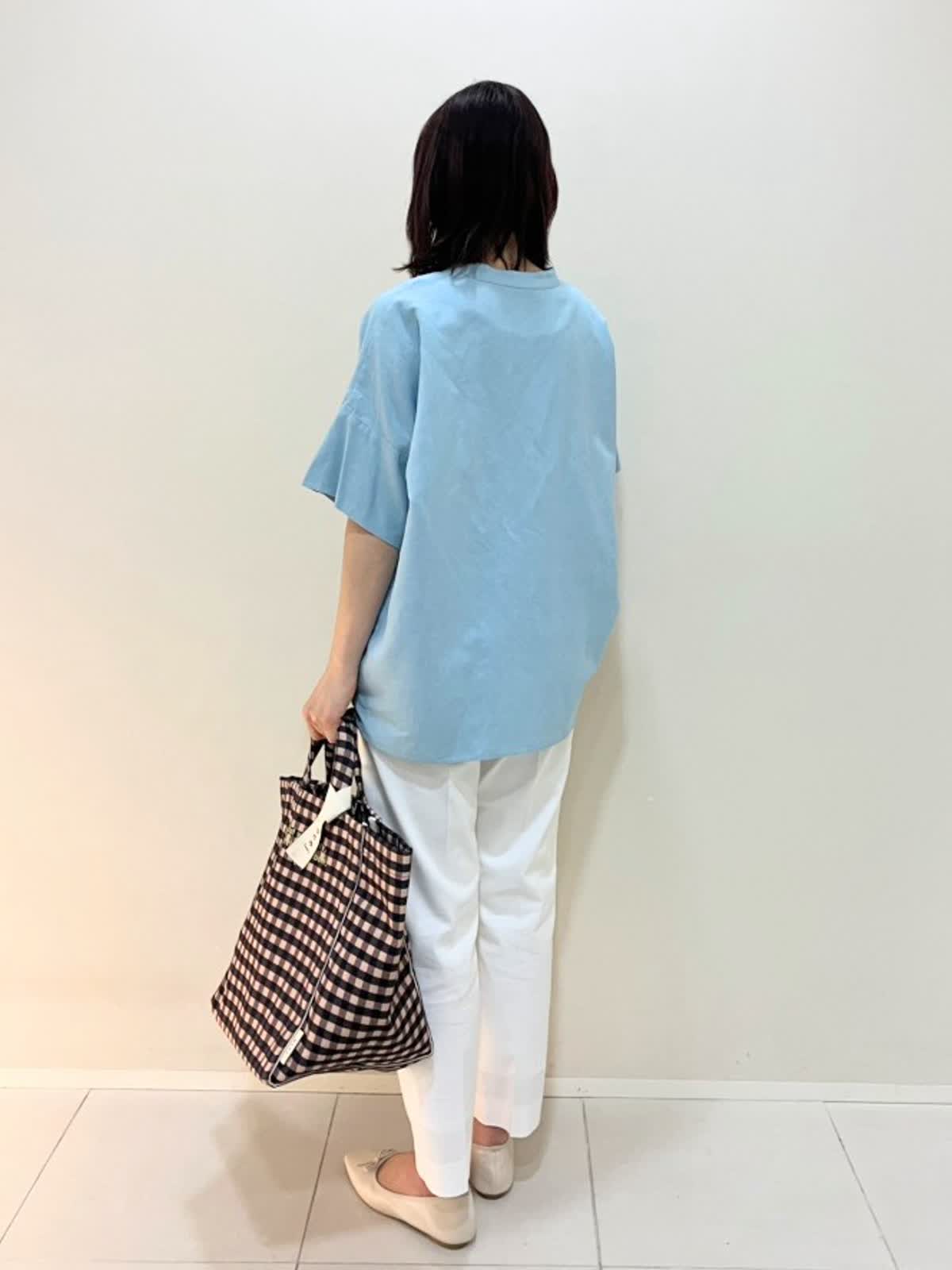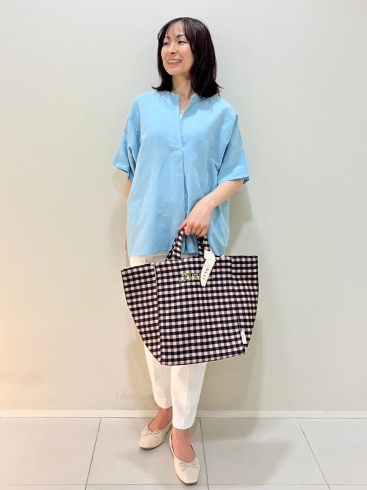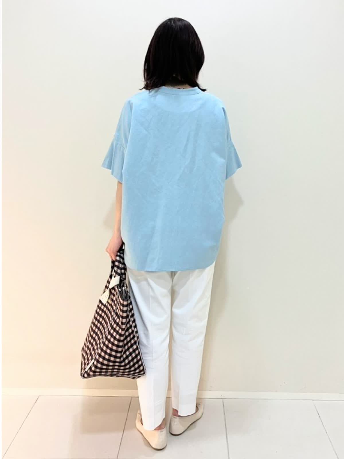【着用サイズ】シャツ:フリー パンツ:7号【着用カラー】シャツ:サックス パンツ:ホワイト 爽やかパンツスタイル ゆったりデザインのスキッパーシャツは、麻が入っていて涼しく、サラッとした気持ちの良い肌触り。袖も丈も長めの安心デザイン。スッキリ見えるテーパードパンツと合わせるのがお勧めです。