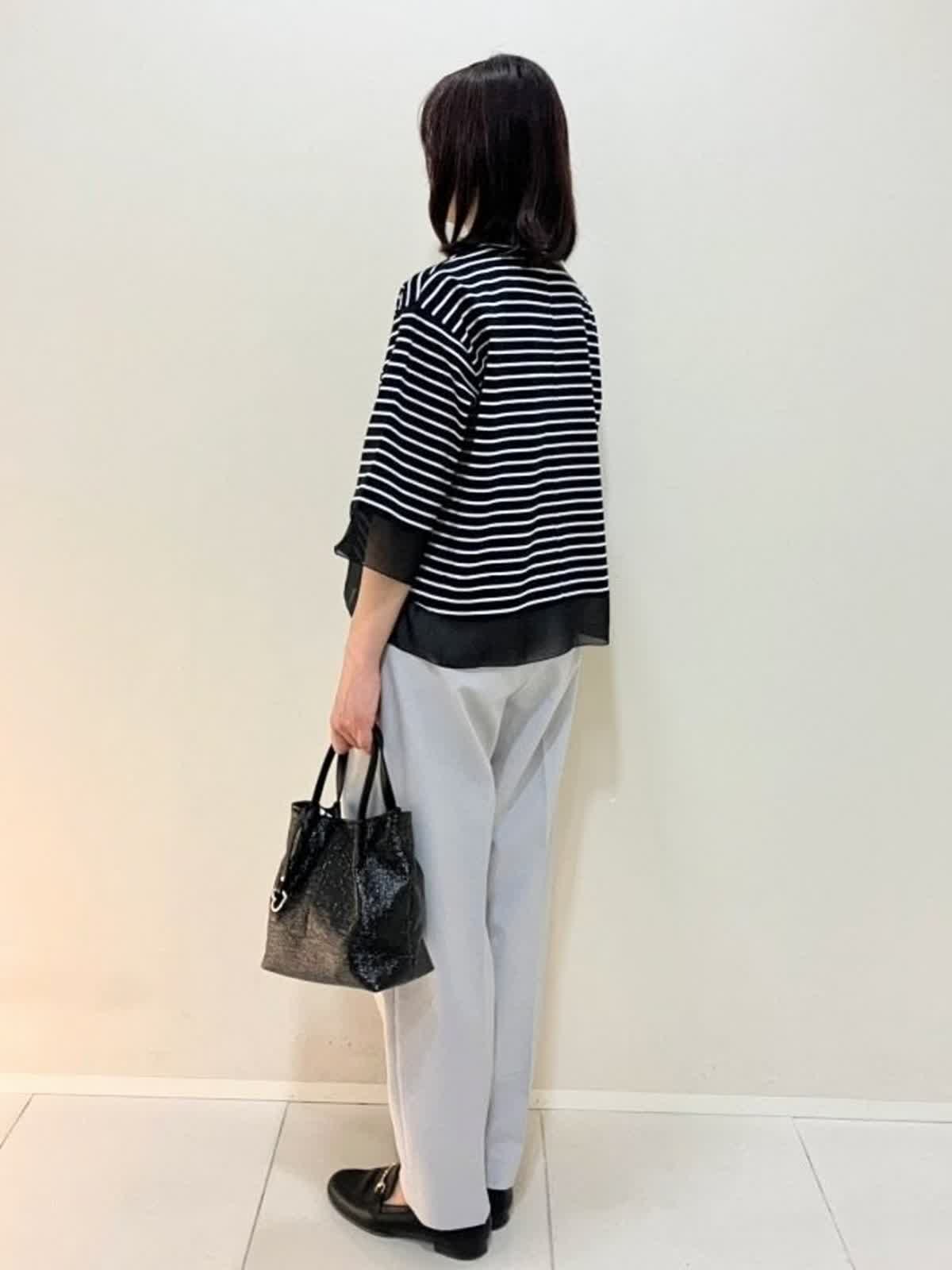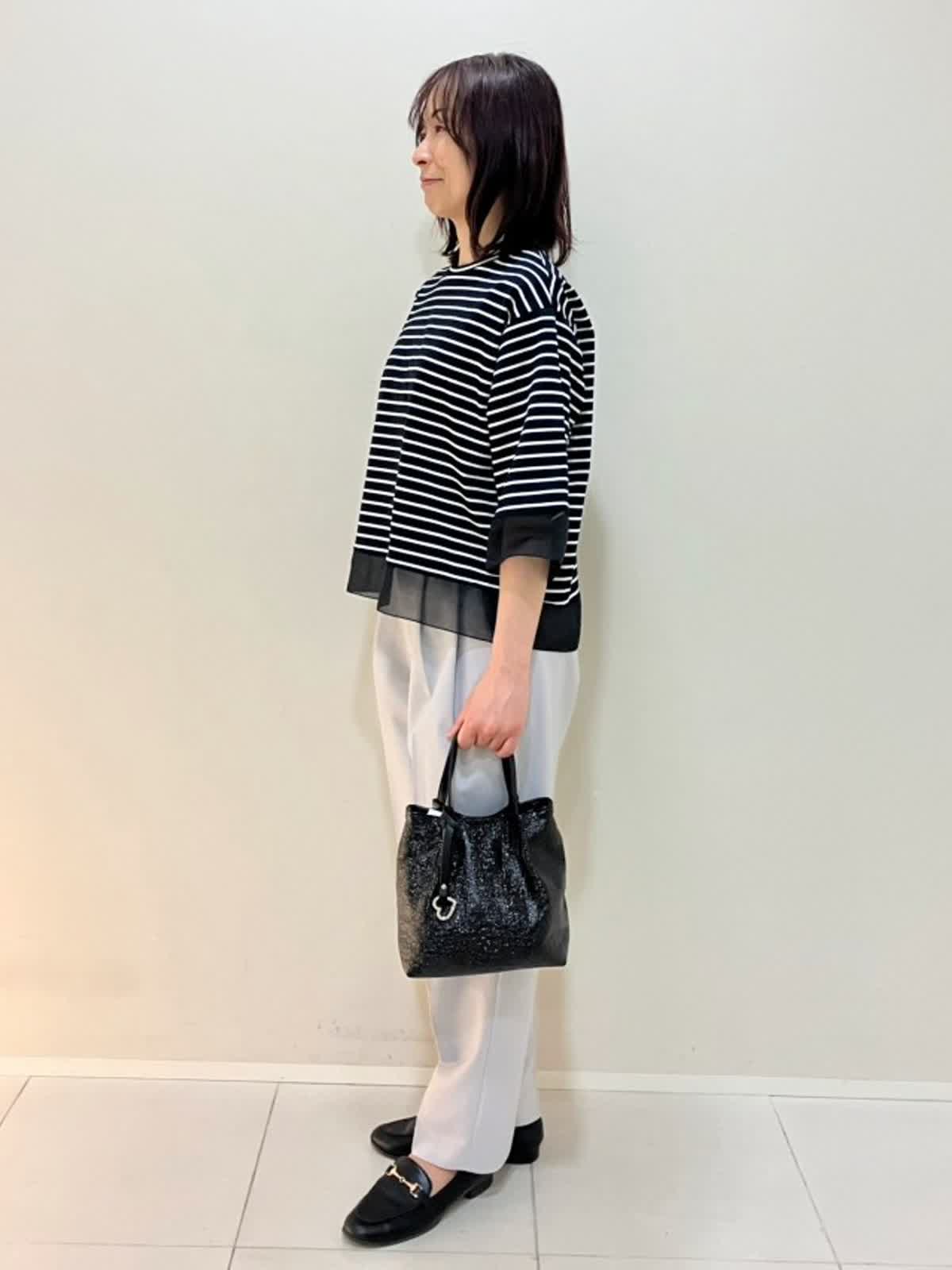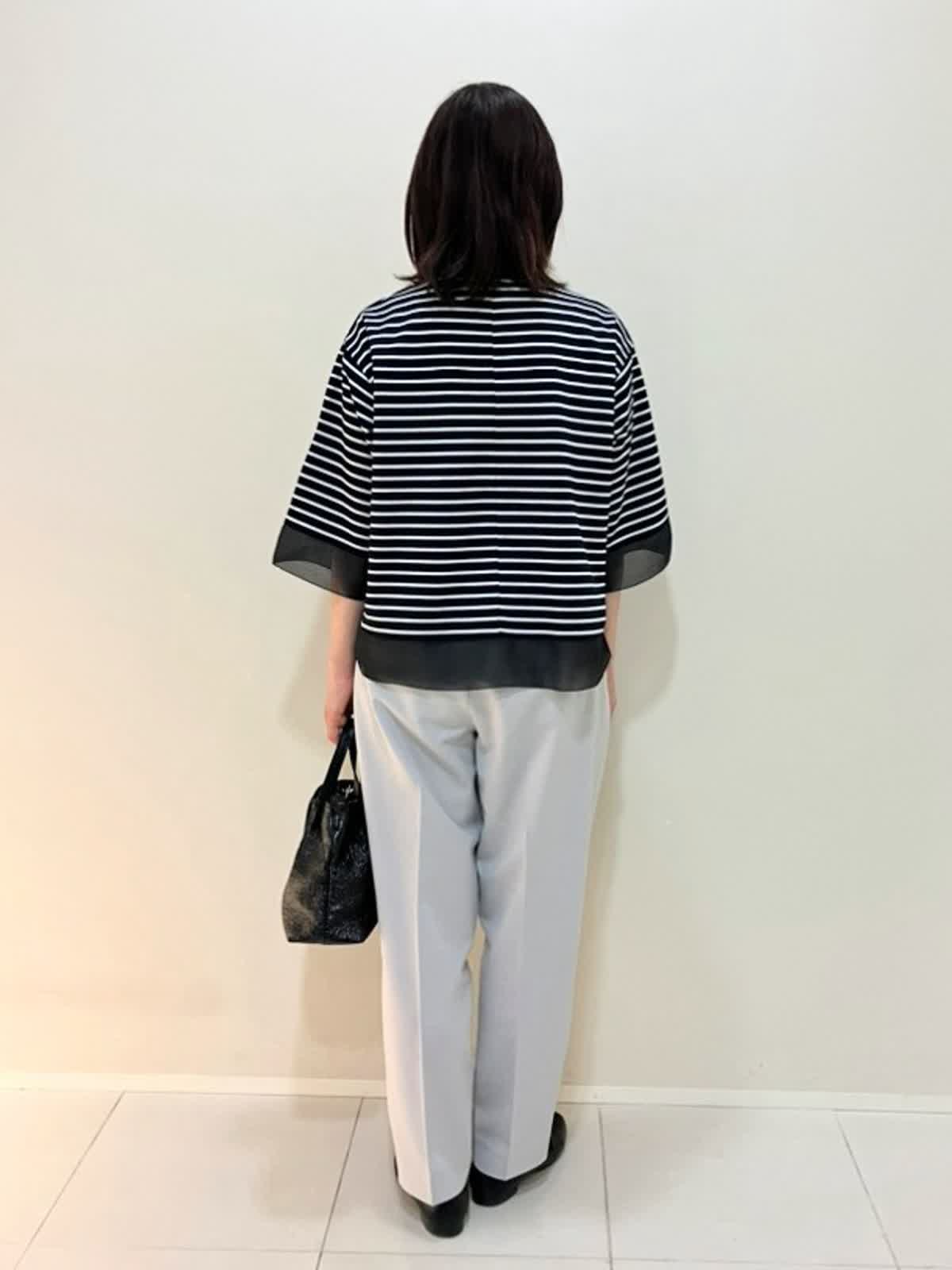 【着用サイズ】カットソー:フリー パンツ:7号【着用カラー】 カットソー:ブラック パンツ:グレー 春のおでかけスタイル ボーダーカットソーは、裾と袖口のシアー部分が涼しく見え、綿素材なので着心地抜群です。ゆったりデザインなので、気になる部分をカバーしてくれます。タックパンツは、ポリエステル素材でシワになりにくく、ウエストがゴム仕様で楽な履き心地です。