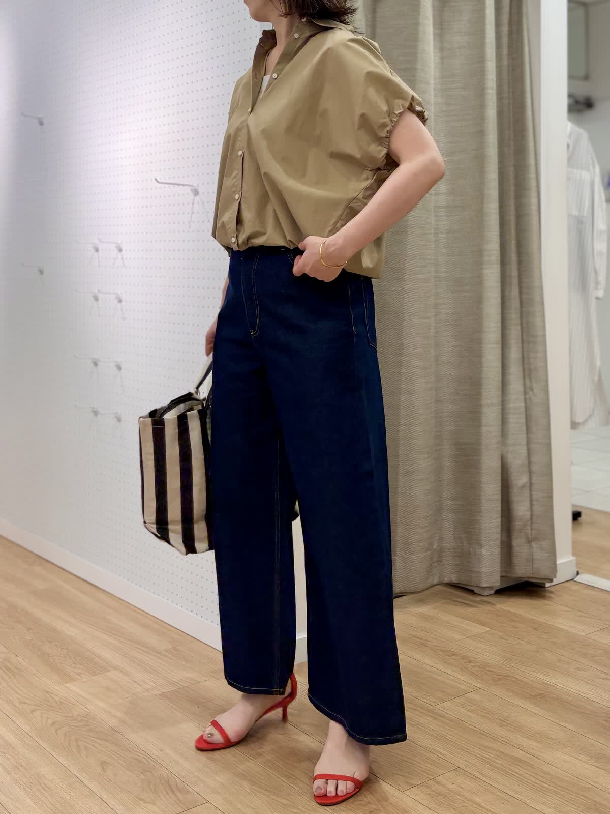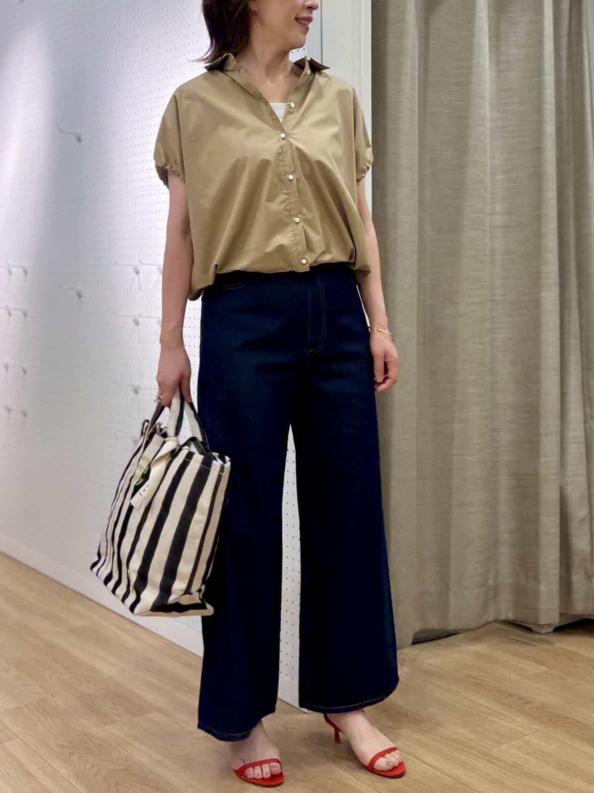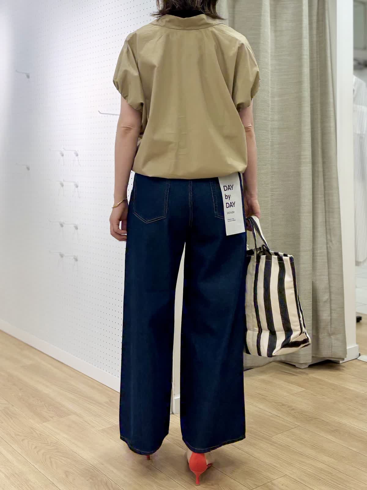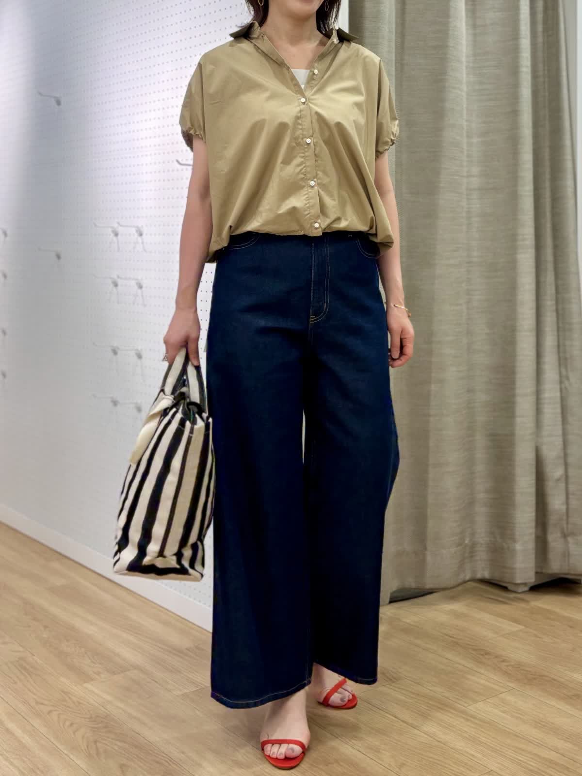 【着用カラー/サイズ】 ブラウス:ベージュ/フリー パンツ:インディゴ/11号 同僚とランチのカジュアルコーデ。コラボのブラウスは裾の絞りでウエスト周りを調整出来るのでボトムを選ばず着こなしを楽しめます。襟があるのでキチンと感のある印象に。ハリのあるコットン100%は初夏にかけてサラッと気持ち良い着心地とラインを拾わずスッキリ見えるのも◎