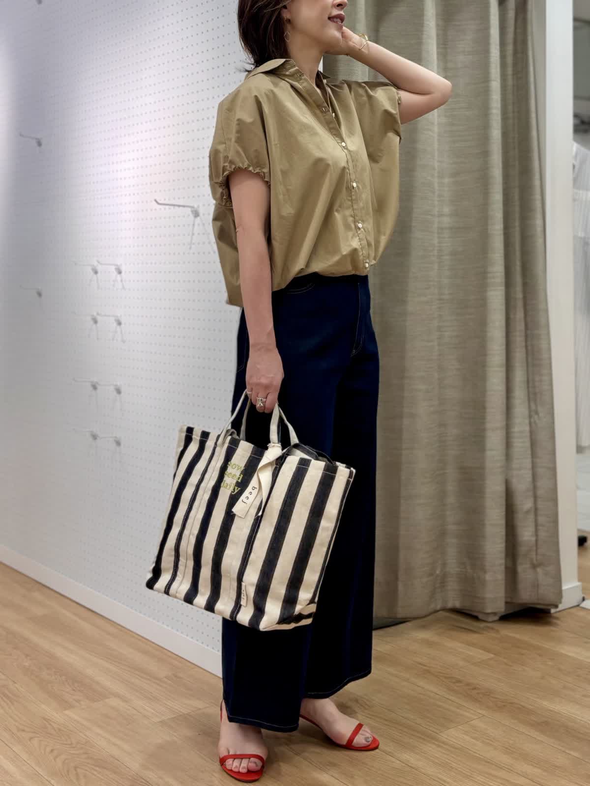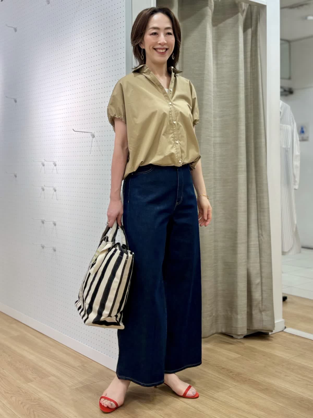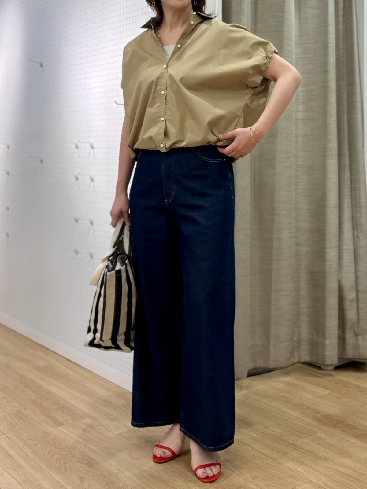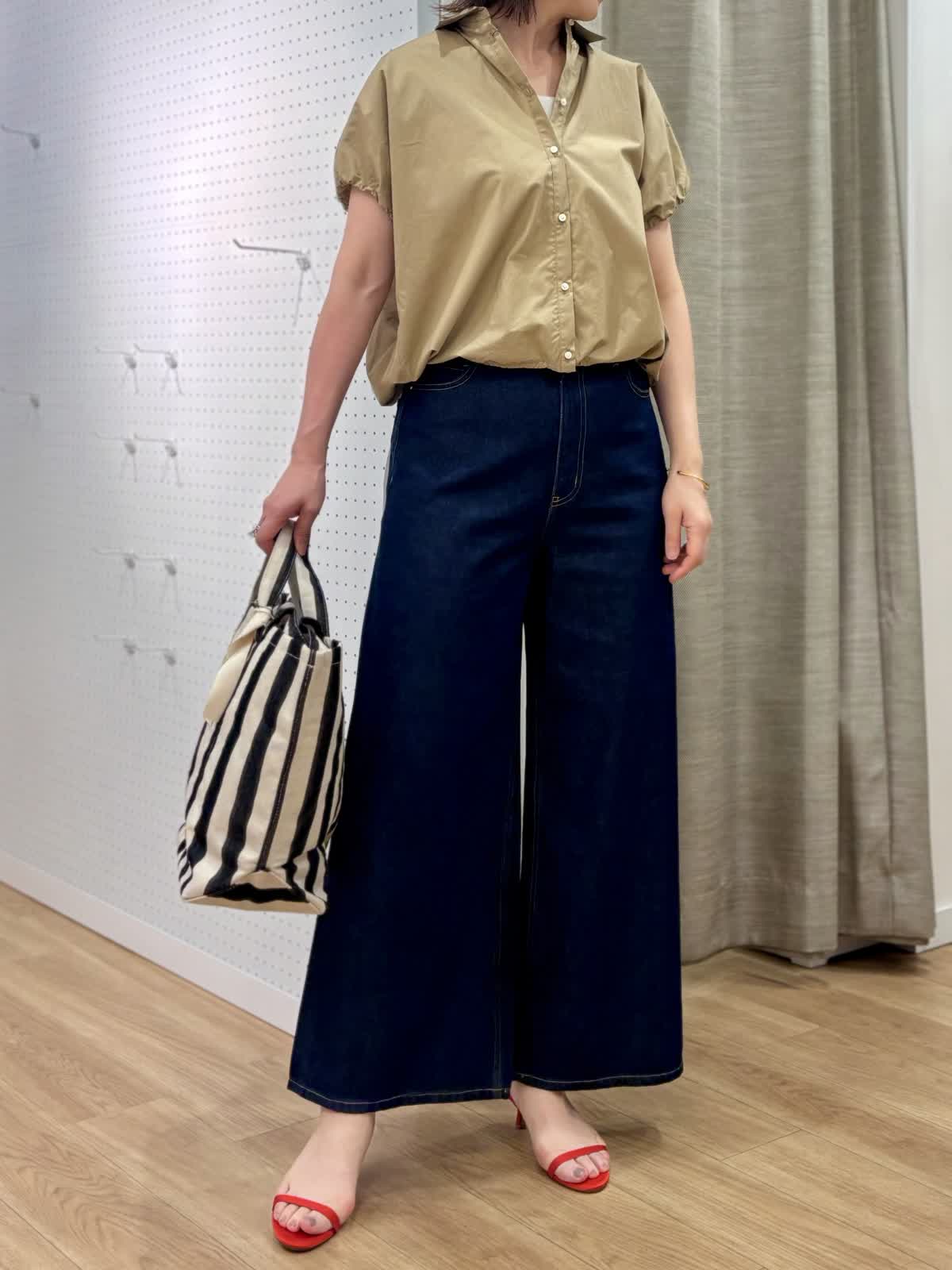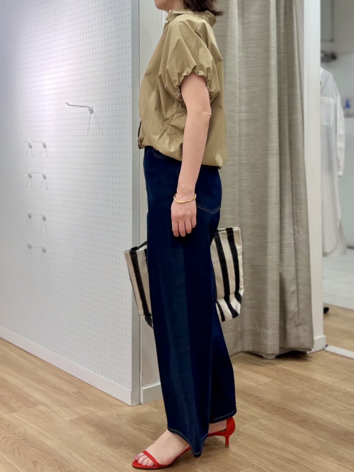 【着用カラー/サイズ】 ブラウス:ベージュ/フリー パンツ:インディゴ/11号 同僚とランチのカジュアルコーデ。コラボのブラウスは裾の絞りでウエスト周りを調整出来るのでボトムを選ばず着こなしを楽しめます。襟があるのでキチンと感のある印象に。ハリのあるコットン100%は初夏にかけてサラッと気持ち良い着心地とラインを拾わずスッキリ見えるのも◎