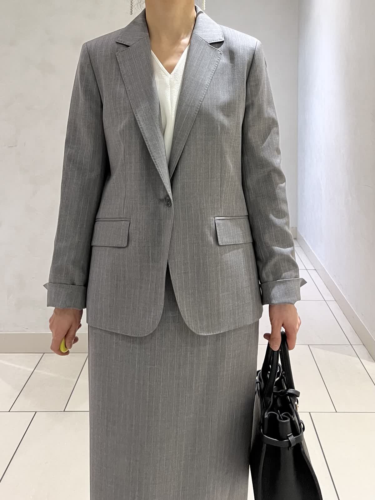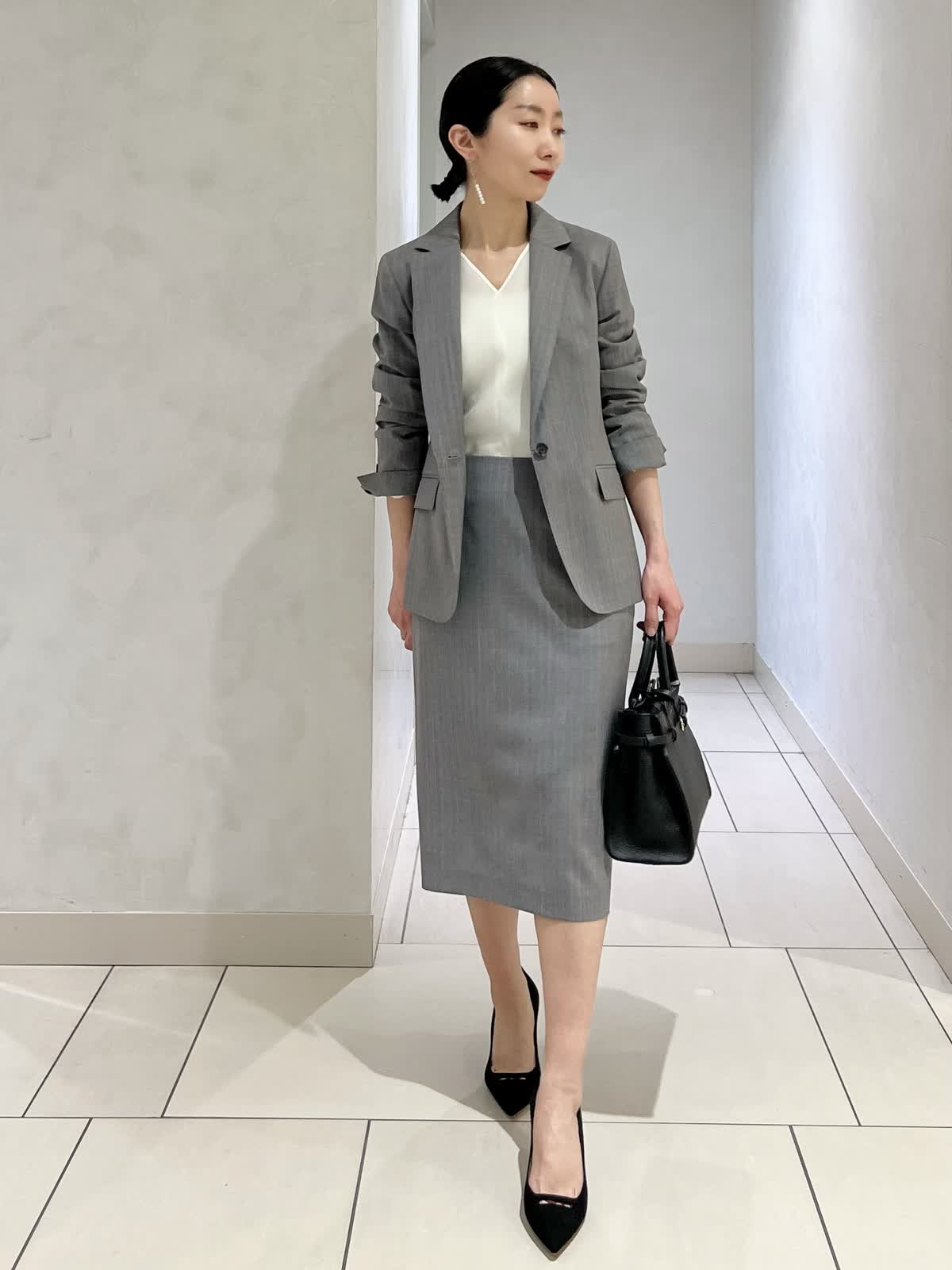 【カラー・サイズ】ジャケット:モクグレー・7号 ブラウス:オフホワイト・9号 スカート:モクグレー・7号 きちんと感のあるグレーのセットアップ。すっきりとしたシルエットで、オフィスからセレモニーまで幅広く活躍。白のインナーを合わせることで、清潔感のある上品な印象に仕上がります。