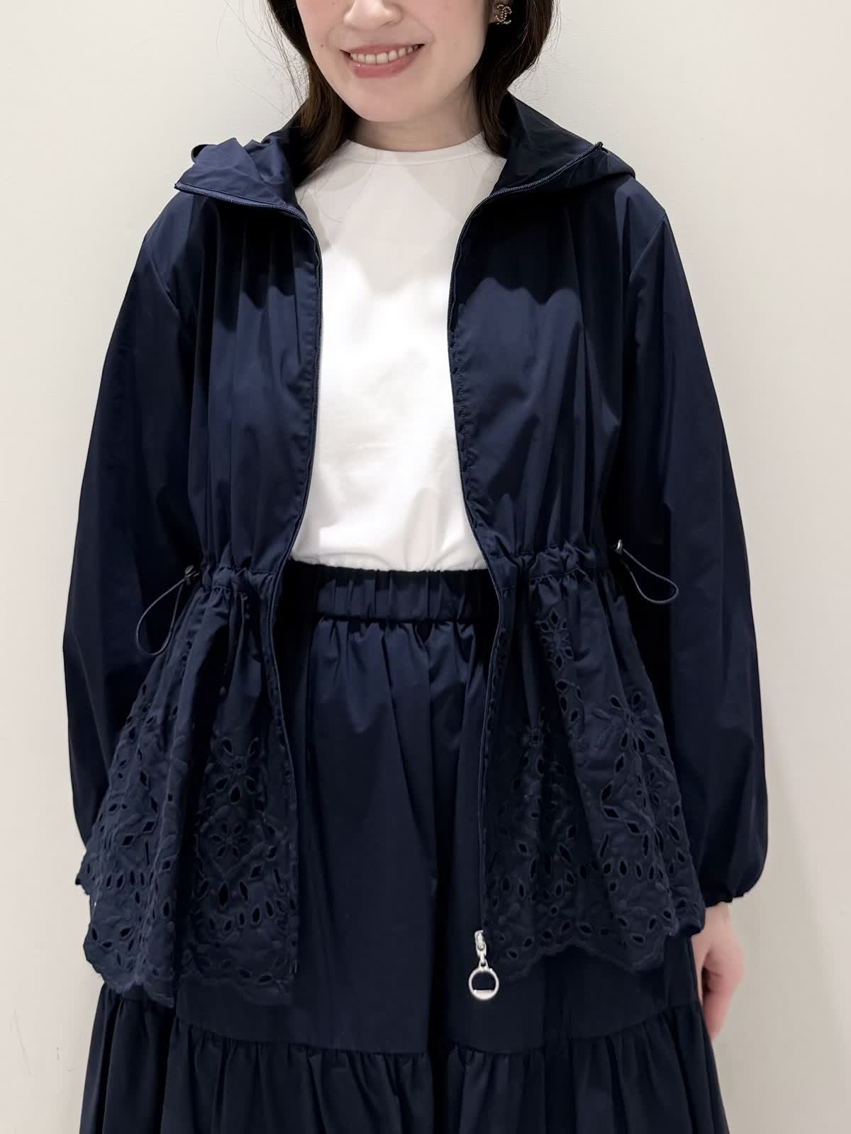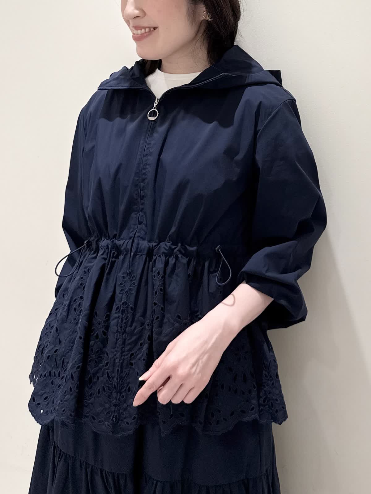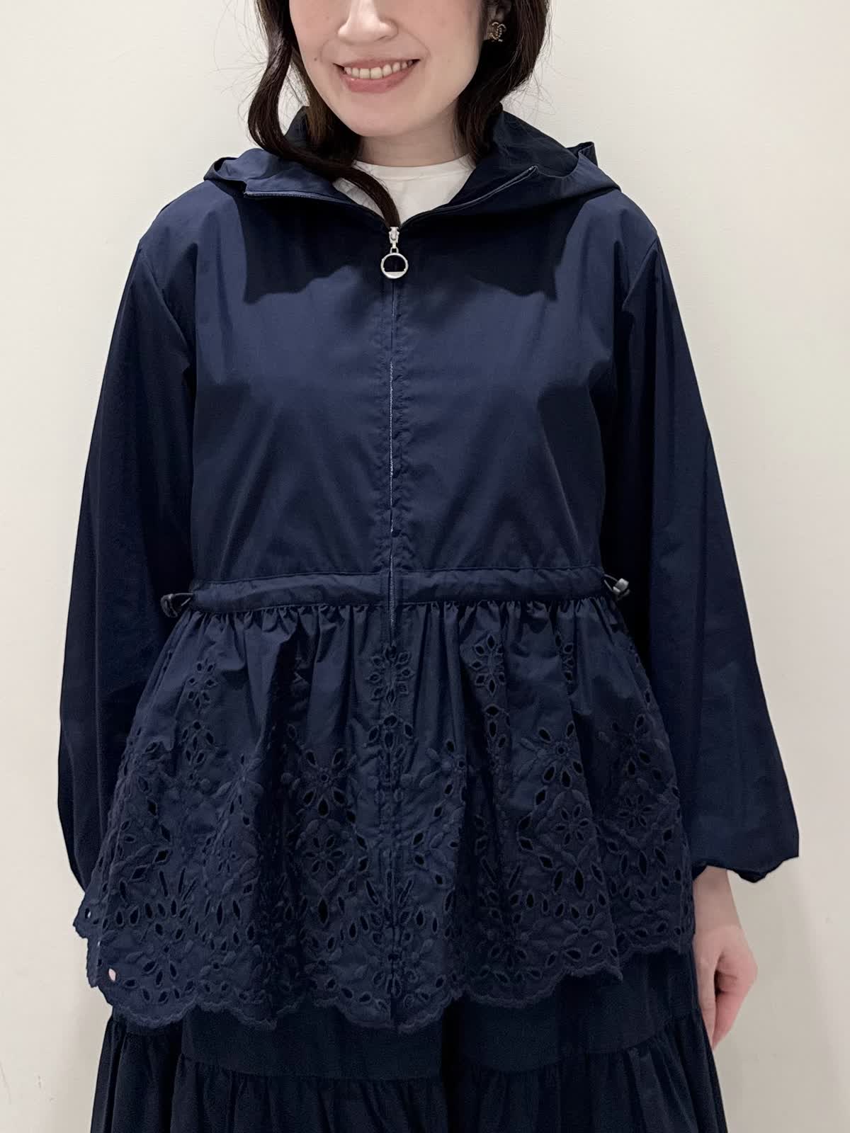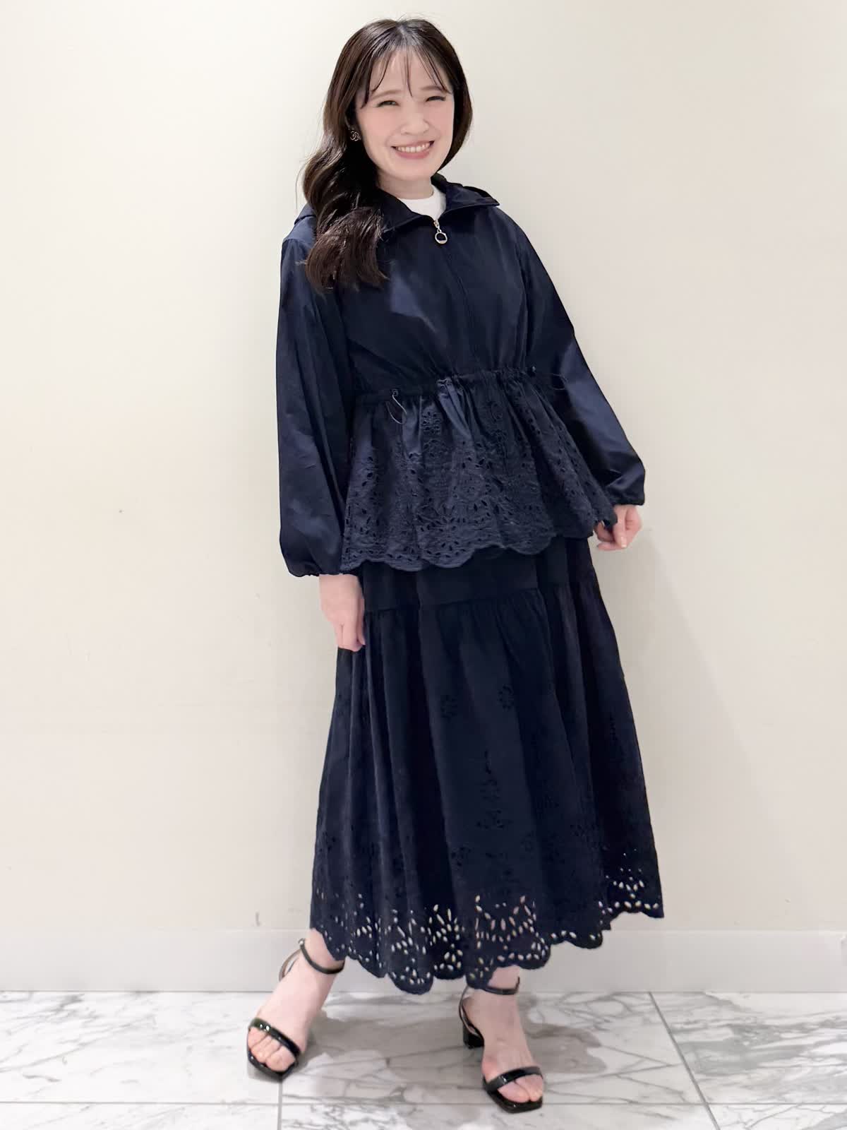 【着用サイズ/カラー】ブルゾン:7号/ネイビー カットソー:9号/オフホワイト スカート:7号/ネイビー レースが目を惹くセットアップコーディネート♪ブラウス感覚でサラッと軽く着られるブルゾン。ウエスト部分で絞りが可能なので、キュッと絞るとフィット&フレアのシルエットになるのでスカート合わせも◯UVカット、撥水加工を施した機能性抜群なのに贅沢なレース使いでイージーケアできる優れものです。インナーはロゴ刺繍がポイントのカットソー。オフホワイトでも透けにくいので着やすいです。合わせのスカートも同生地素材。柔らかい総ゴムウエストはとても楽に履ける1着です。裏地は裾レースにかかるくらいの長さなので透け感の心配はなく着られ、ネイビーでも抜け感があり、歩く度に揺れるのが綺麗です。いつものサイズで大丈夫です。