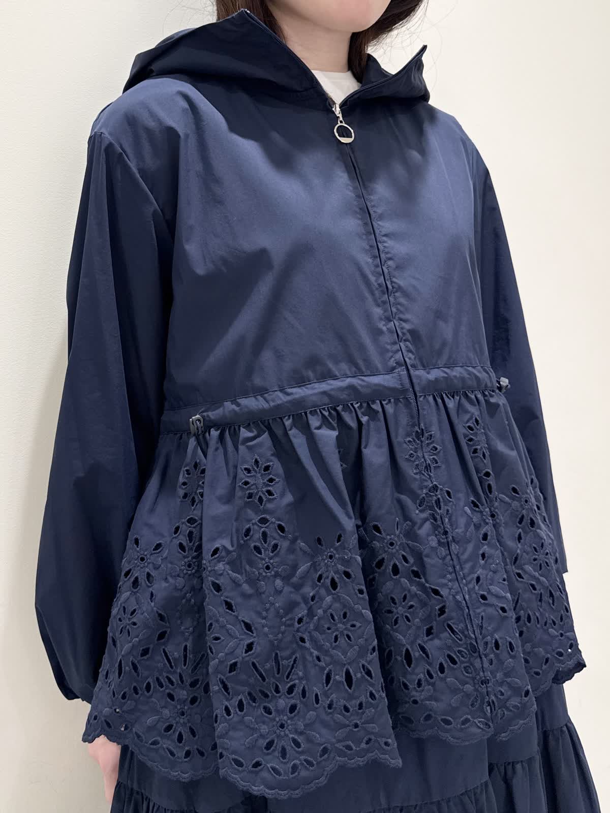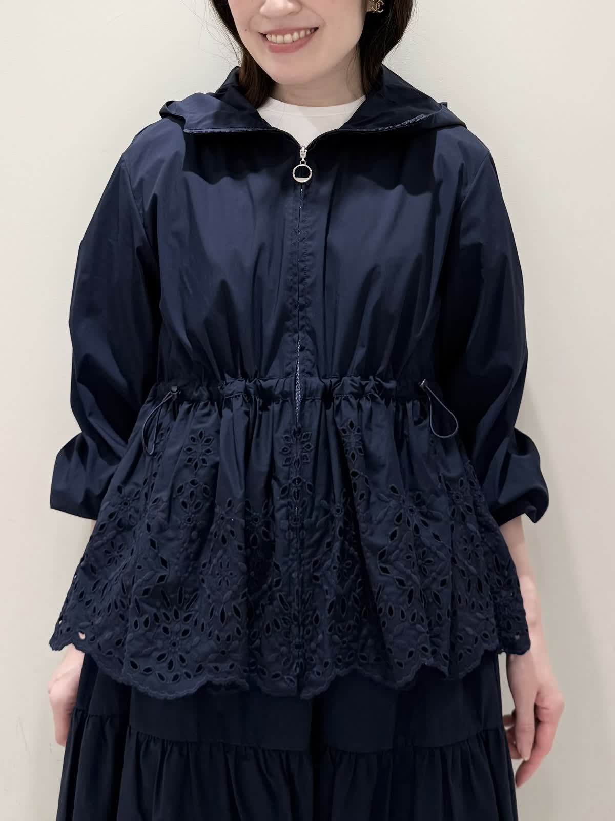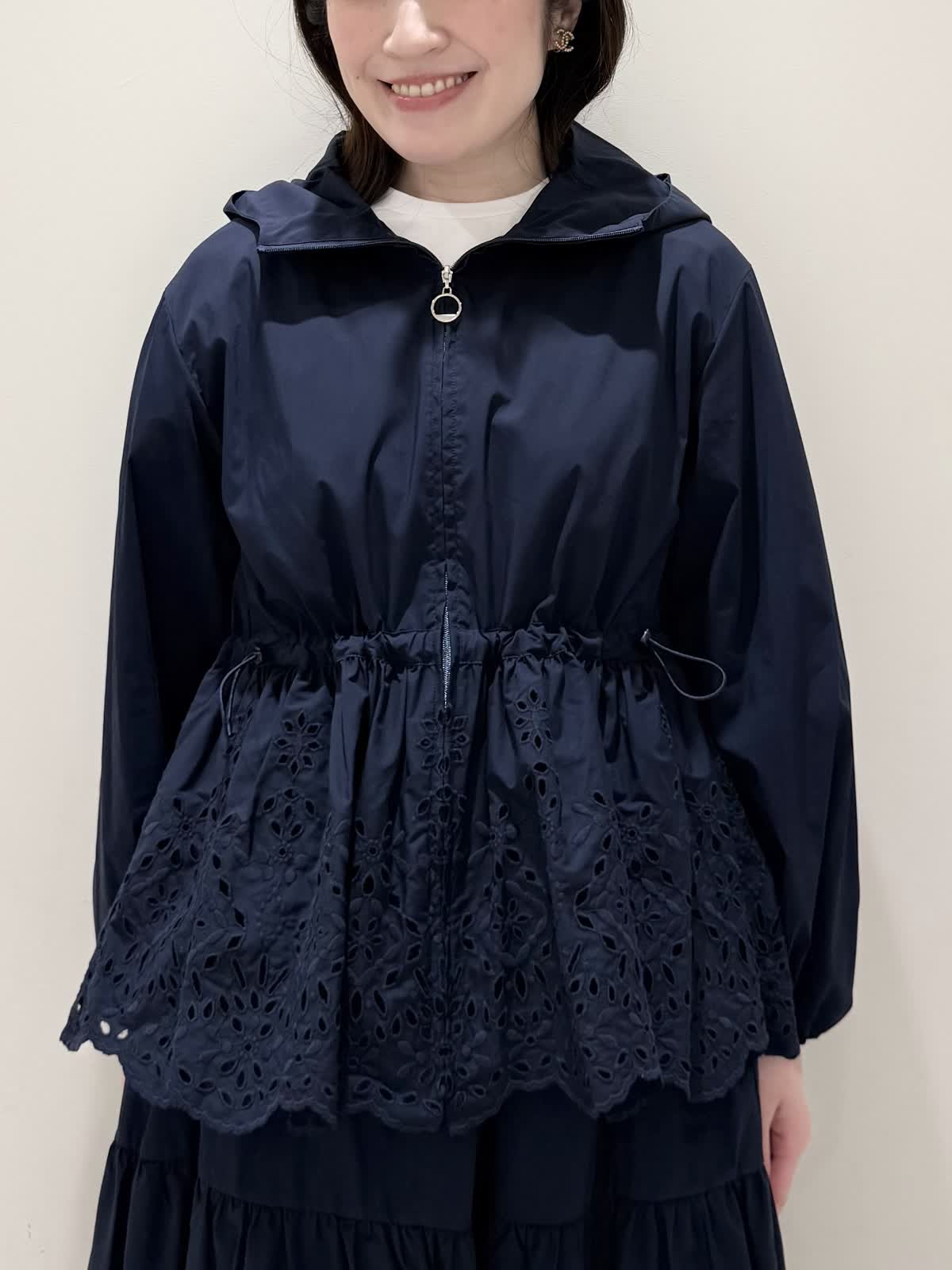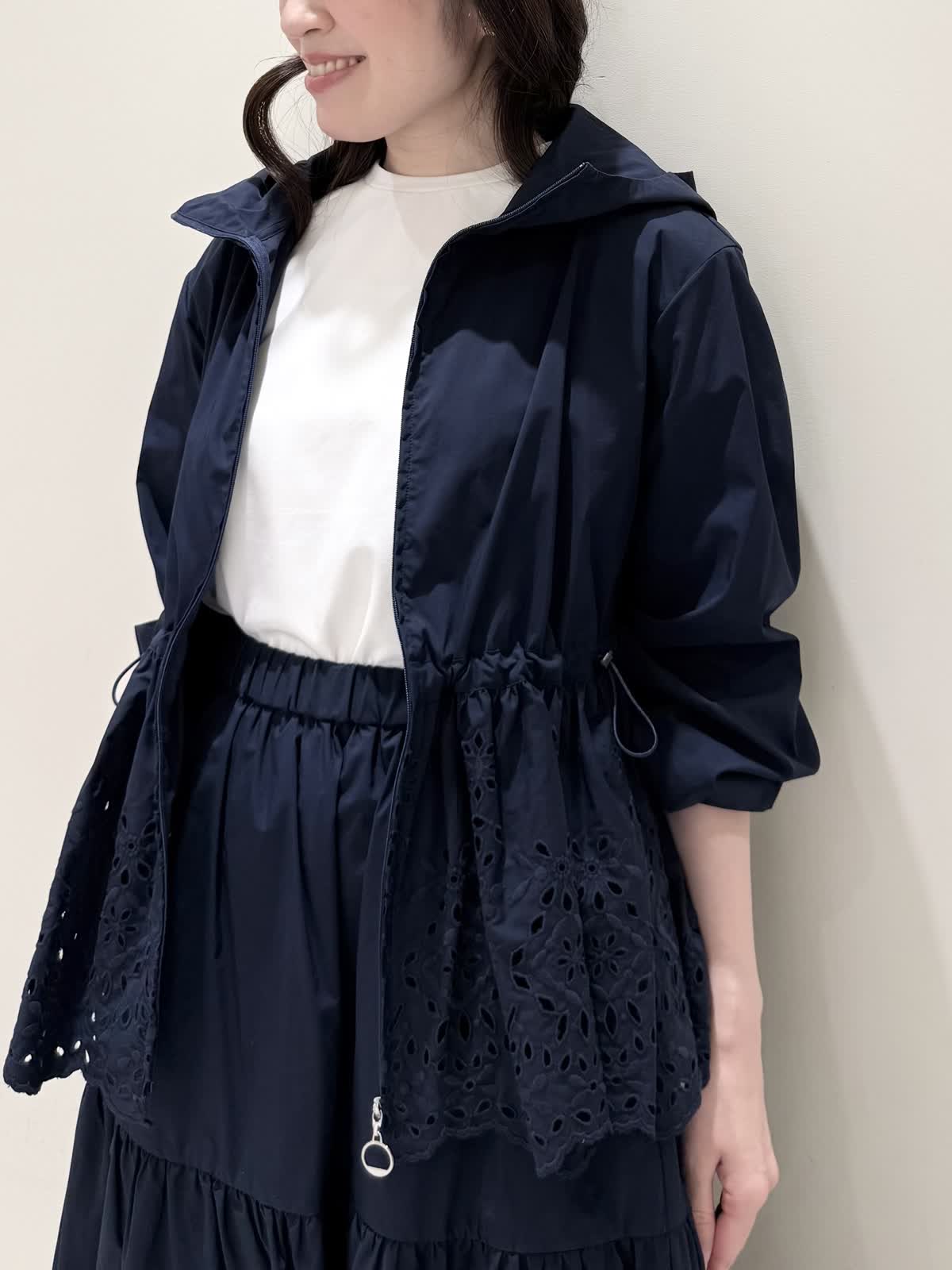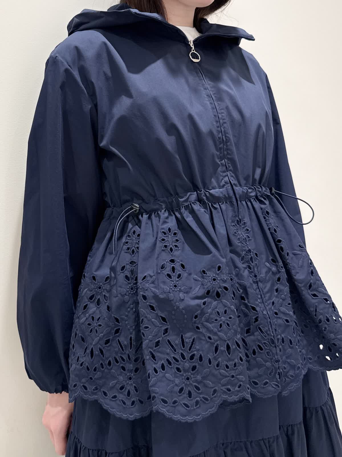 【着用サイズ/カラー】ブルゾン:7号/ネイビー カットソー:9号/オフホワイト スカート:7号/ネイビー レースが目を惹くセットアップコーディネート♪ブラウス感覚でサラッと軽く着られるブルゾン。ウエスト部分で絞りが可能なので、キュッと絞るとフィット&フレアのシルエットになるのでスカート合わせも◯UVカット、撥水加工を施した機能性抜群なのに贅沢なレース使いでイージーケアできる優れものです。インナーはロゴ刺繍がポイントのカットソー。オフホワイトでも透けにくいので着やすいです。合わせのスカートも同生地素材。柔らかい総ゴムウエストはとても楽に履ける1着です。裏地は裾レースにかかるくらいの長さなので透け感の心配はなく着られ、ネイビーでも抜け感があり、歩く度に揺れるのが綺麗です。いつものサイズで大丈夫です。