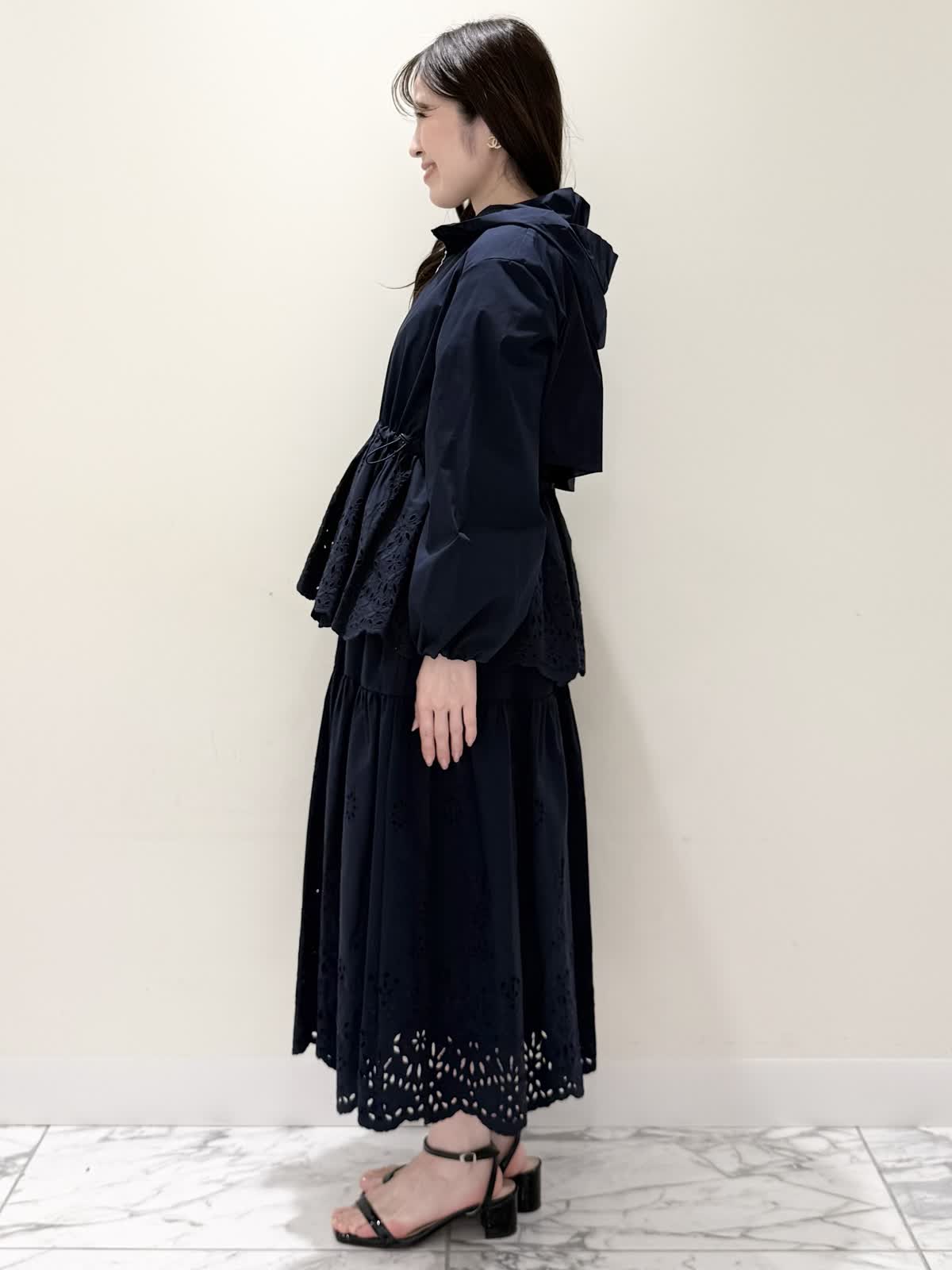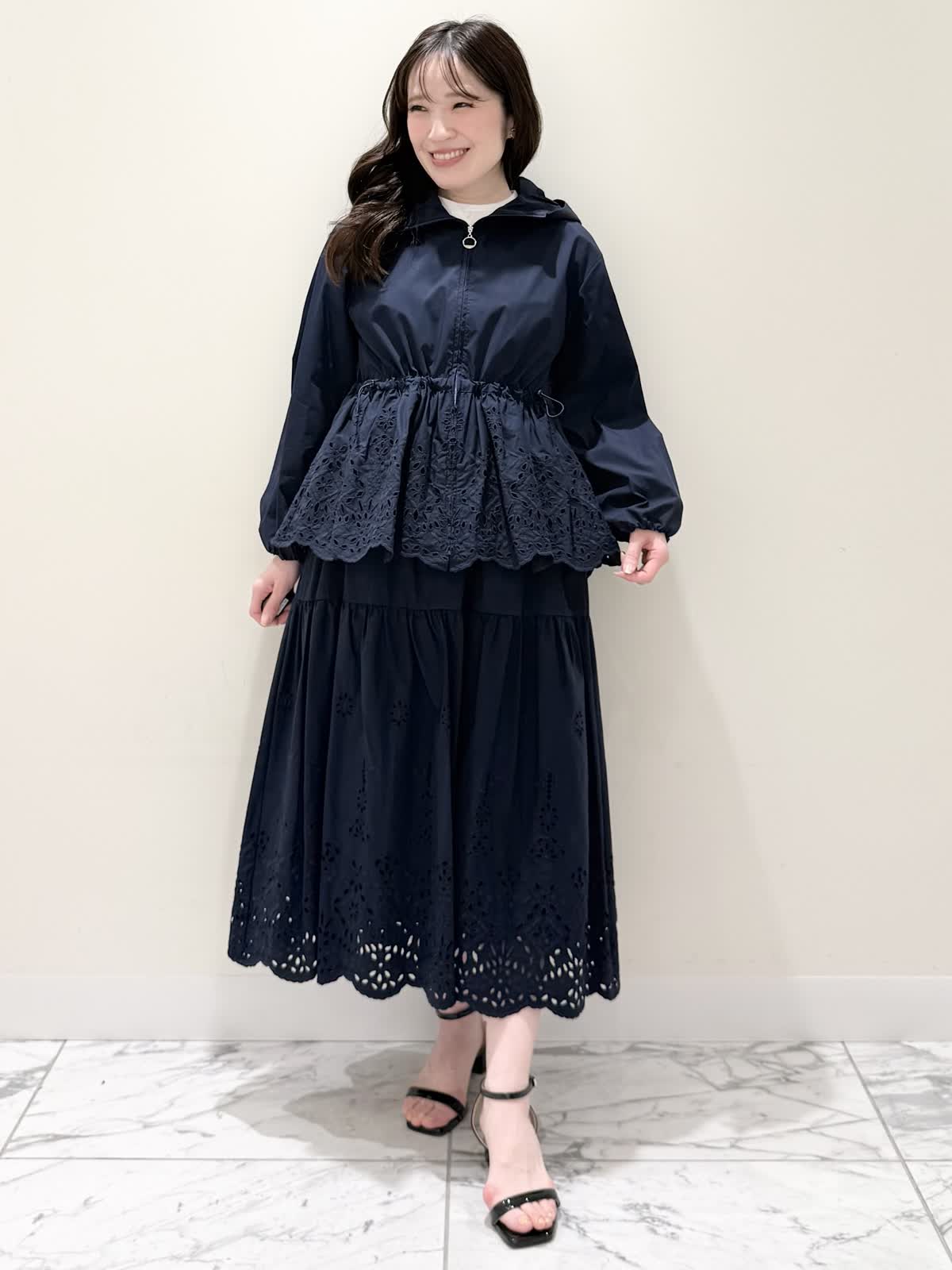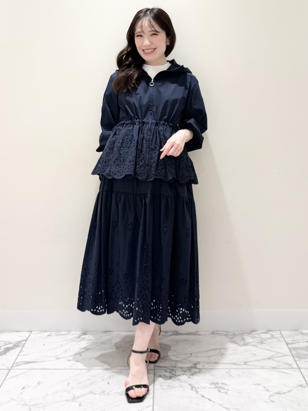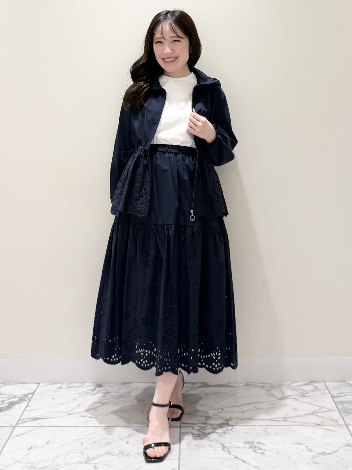 【着用サイズ/カラー】ブルゾン:7号/ネイビー カットソー:9号/オフホワイト スカート:7号/ネイビー レースが目を惹くセットアップコーディネート♪ブラウス感覚でサラッと軽く着られるブルゾン。ウエスト部分で絞りが可能なので、キュッと絞るとフィット&フレアのシルエットになるのでスカート合わせも◯UVカット、撥水加工を施した機能性抜群なのに贅沢なレース使いでイージーケアできる優れものです。インナーはロゴ刺繍がポイントのカットソー。オフホワイトでも透けにくいので着やすいです。合わせのスカートも同生地素材。柔らかい総ゴムウエストはとても楽に履ける1着です。裏地は裾レースにかかるくらいの長さなので透け感の心配はなく着られ、ネイビーでも抜け感があり、歩く度に揺れるのが綺麗です。いつものサイズで大丈夫です。