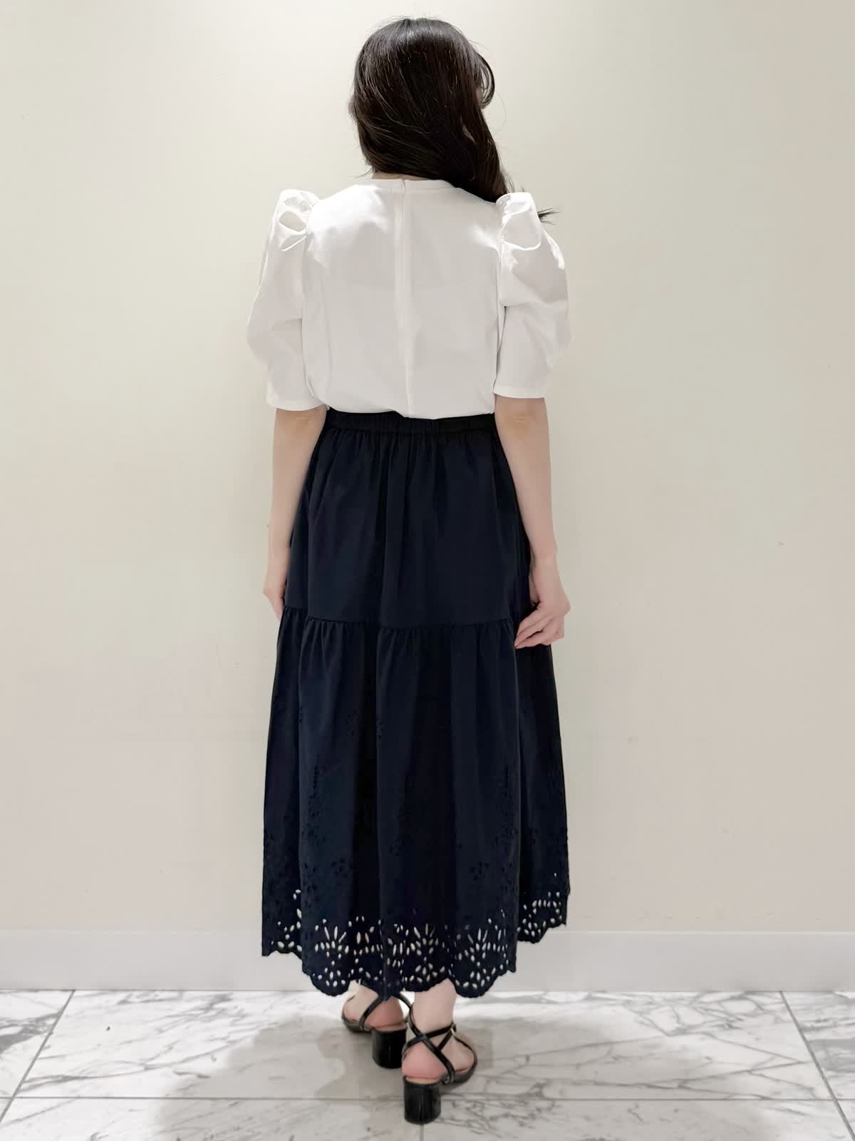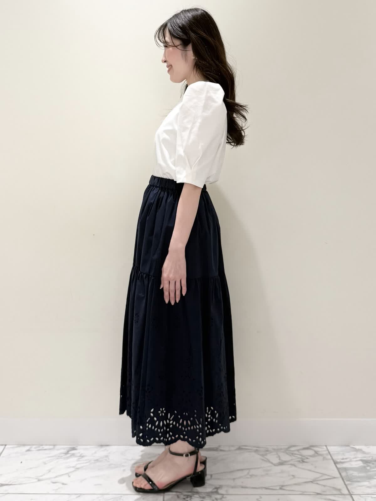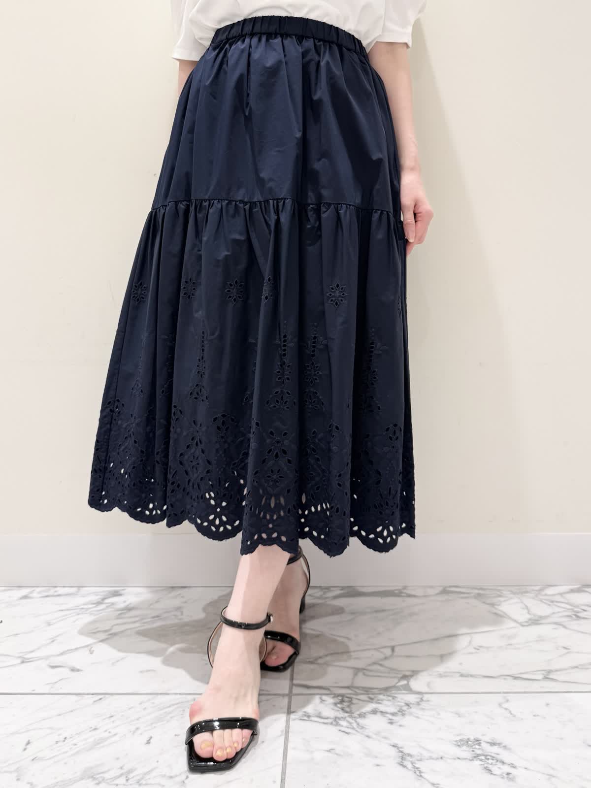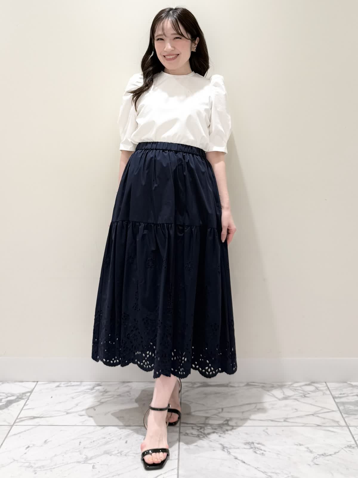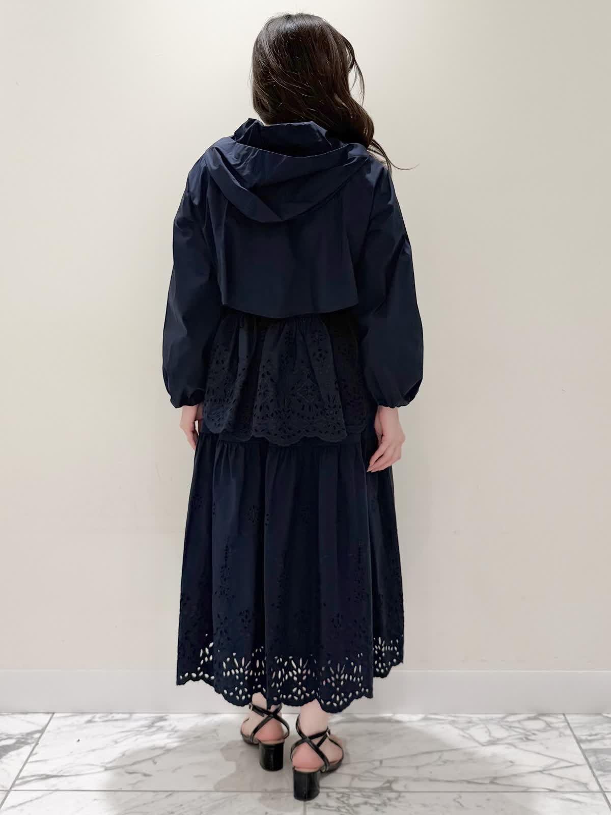 【着用サイズ/カラー】ブルゾン:7号/ネイビー カットソー:9号/オフホワイト スカート:7号/ネイビー レースが目を惹くセットアップコーディネート♪ブラウス感覚でサラッと軽く着られるブルゾン。ウエスト部分で絞りが可能なので、キュッと絞るとフィット&フレアのシルエットになるのでスカート合わせも◯UVカット、撥水加工を施した機能性抜群なのに贅沢なレース使いでイージーケアできる優れものです。インナーはロゴ刺繍がポイントのカットソー。オフホワイトでも透けにくいので着やすいです。合わせのスカートも同生地素材。柔らかい総ゴムウエストはとても楽に履ける1着です。裏地は裾レースにかかるくらいの長さなので透け感の心配はなく着られ、ネイビーでも抜け感があり、歩く度に揺れるのが綺麗です。いつものサイズで大丈夫です。