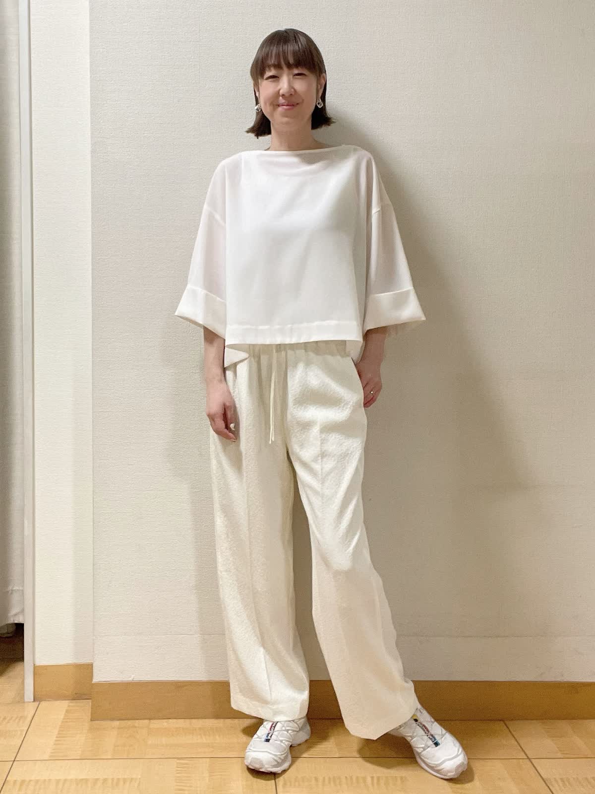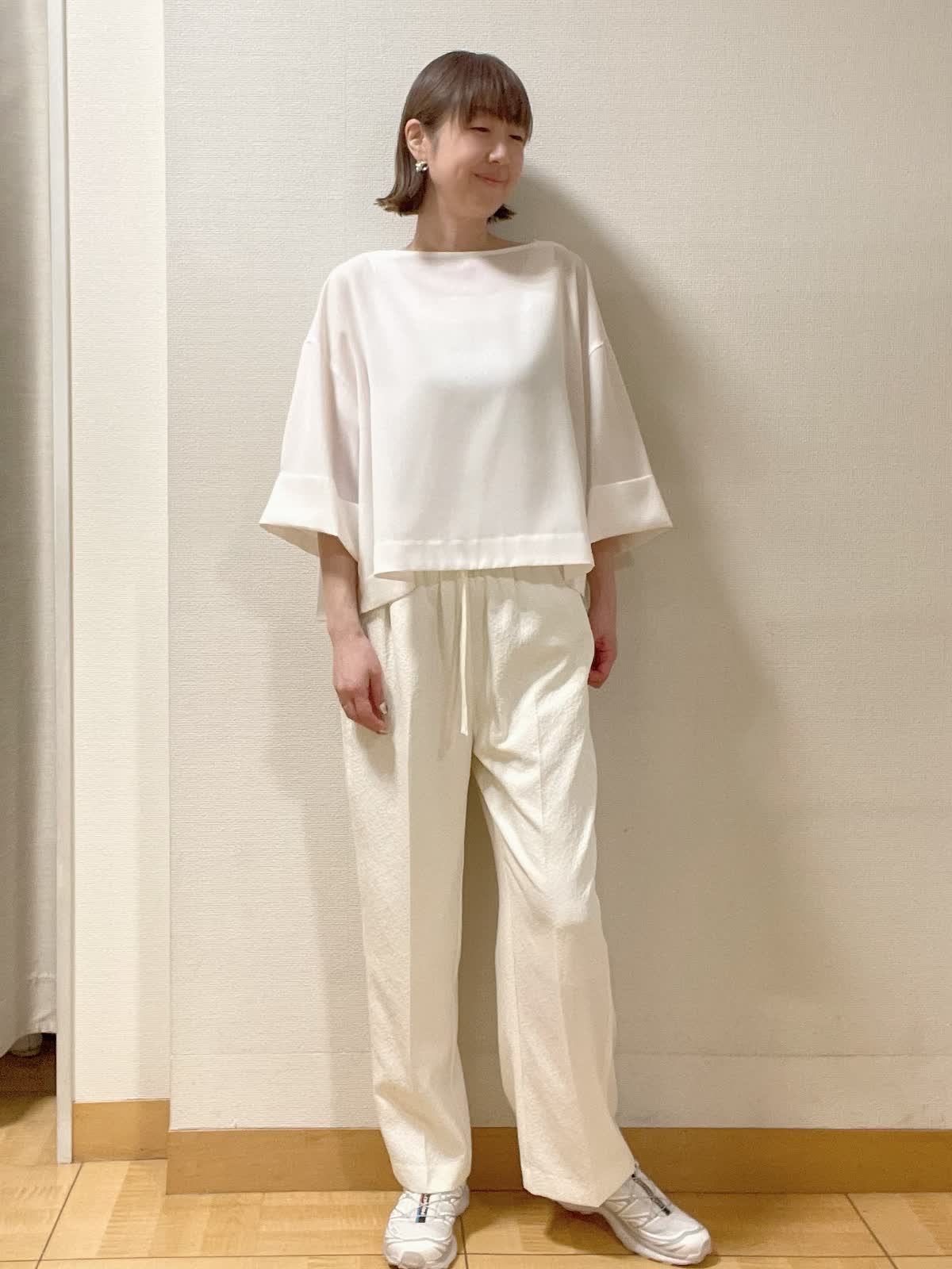 【着用サイズ】ブラウス:フリー インナーカットソー、パンツ共に9号 【着用カラー】ブラウス:オフホワイト インナーカットソー:ホワイト パンツ:アイボリー 着丈が程よくバランスよく、サラッとした着心地のブラウス。ウエストゴム使用のストレートワイドパンツ合わせでラフスタイルに。