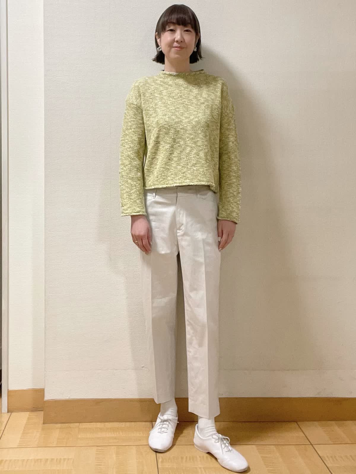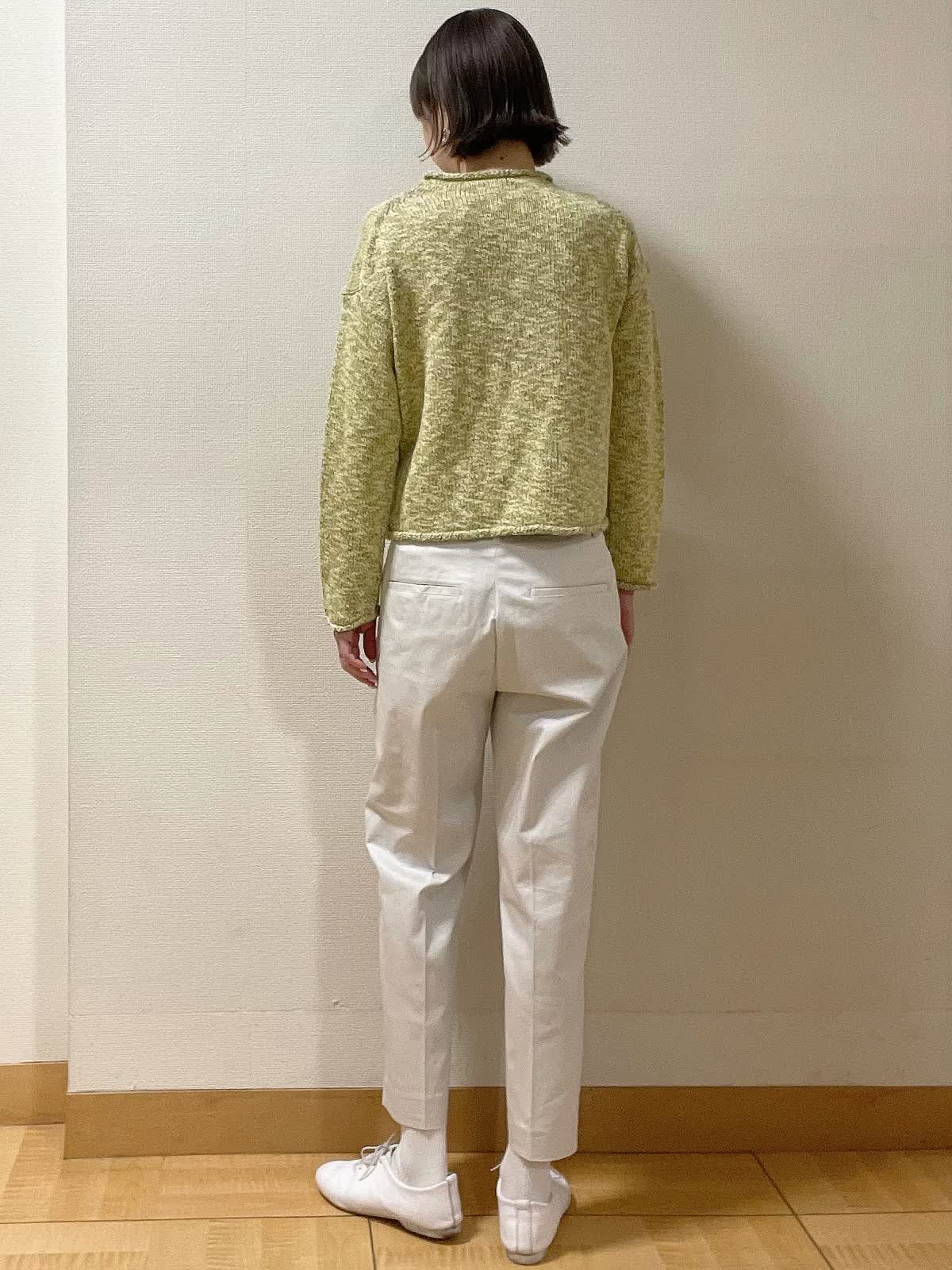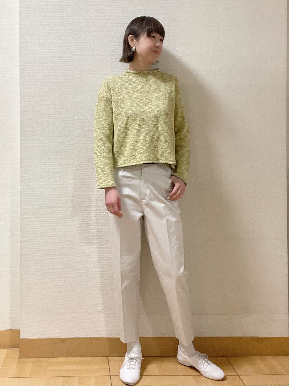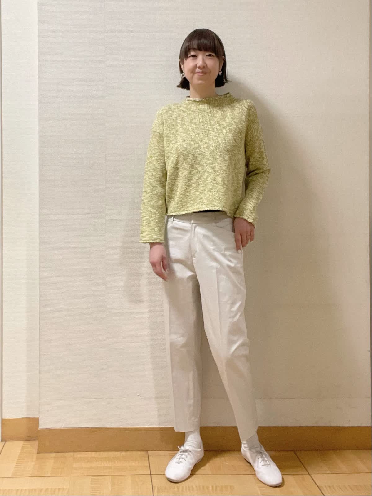 【着用サイズ】共に9号【着用カラー】ニット:イエロー ネイビー パンツ:ミディアムグレー この季節に1枚で着られて便利なロールネックニット。着丈が短めなので脚長効果にも!テーパードパンツとバランスも良く重宝します。