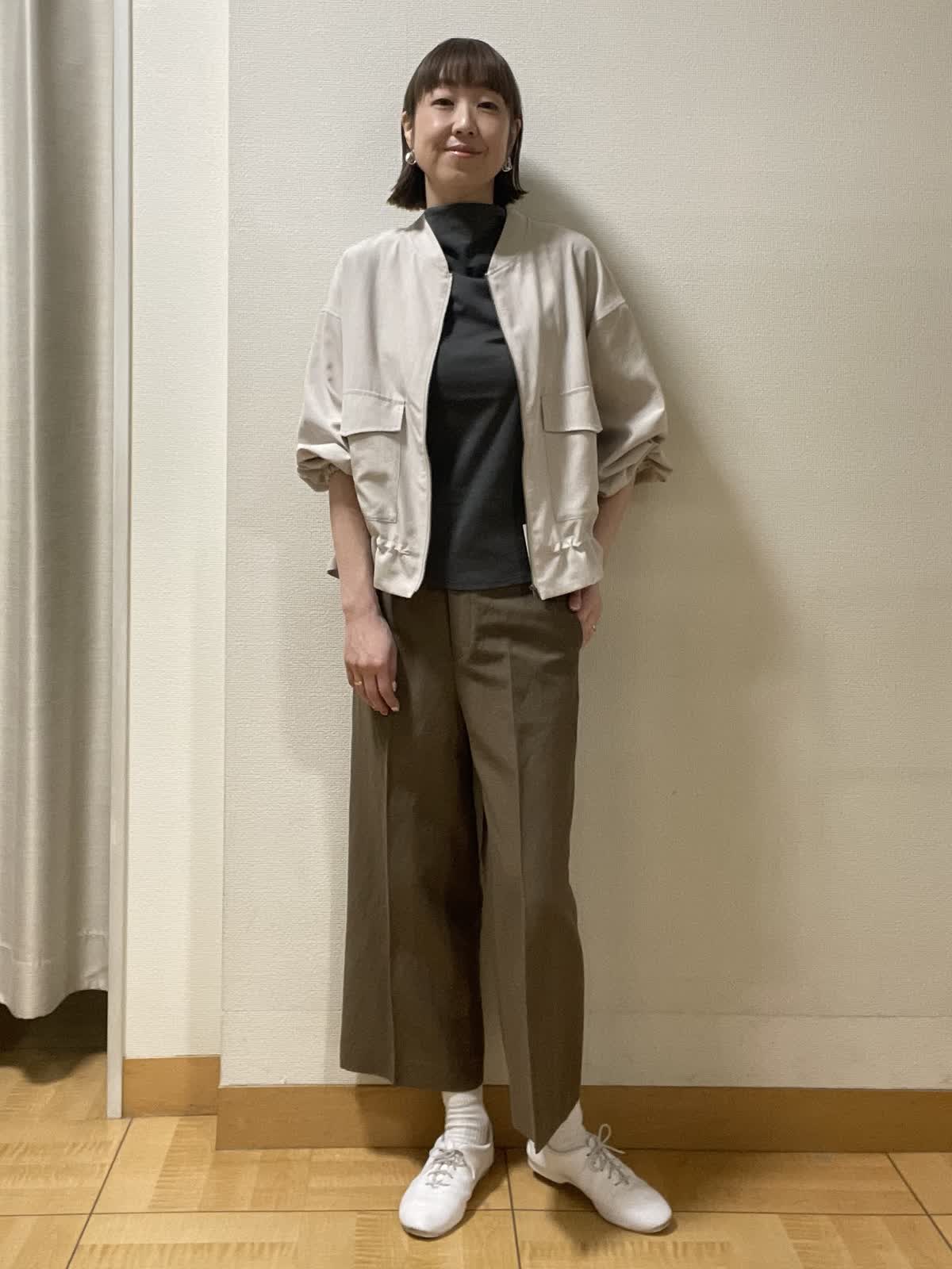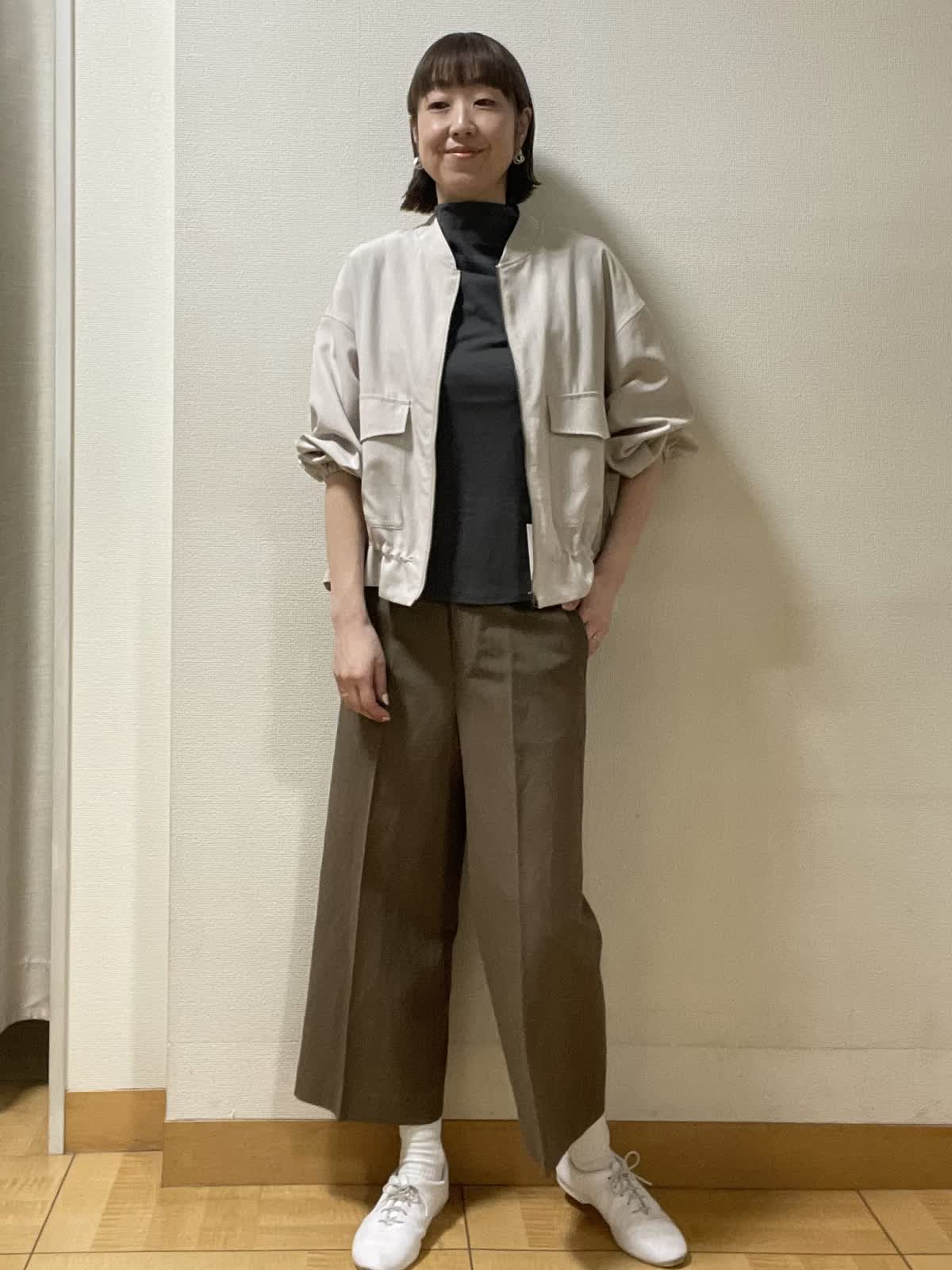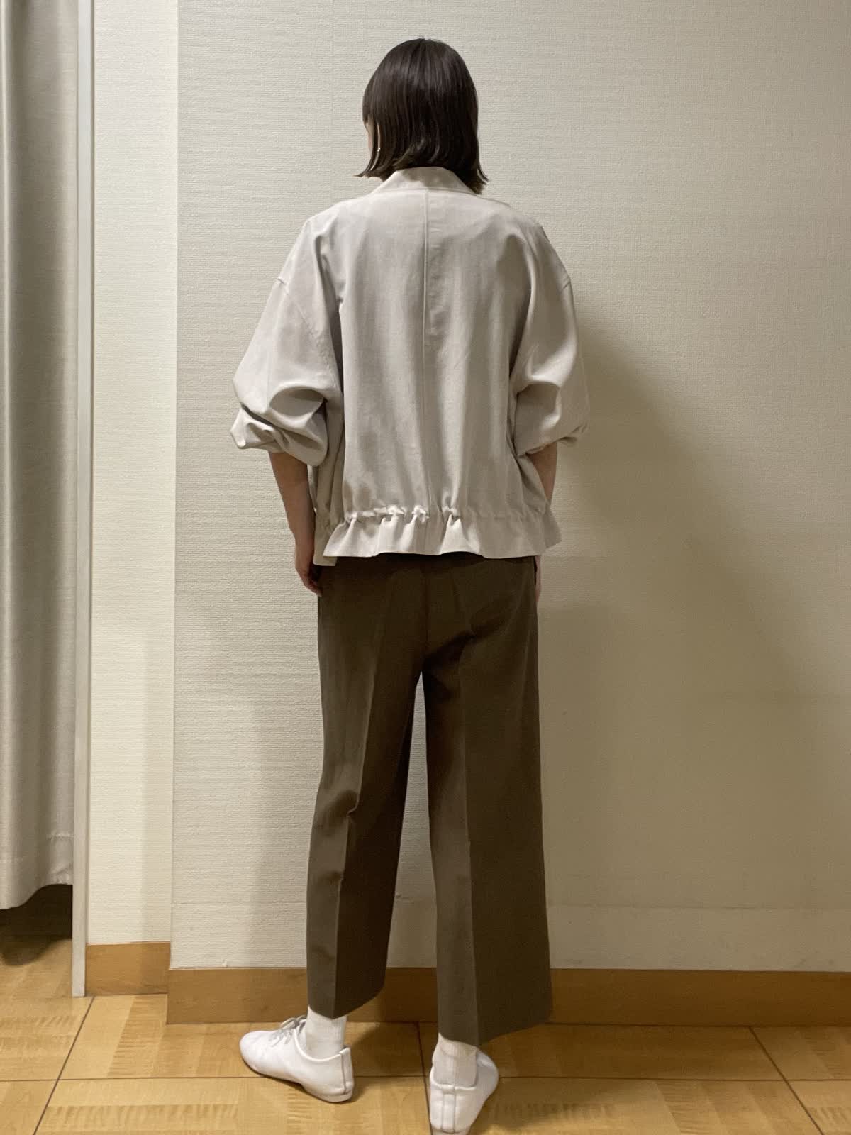 【着用サイズ】ブルゾン、カットソー共にフリー パンツ:9号【着用カラー】ブルゾン:ベージュ カットソー:チャコールグレー パンツ:カーキ サラサラした素材で軽く羽織れるショートブルゾン。裾をアジャスターで可愛らしく絞れるのがポイント!これからのGWのお出かけに大活躍するおすすめブルゾンです。