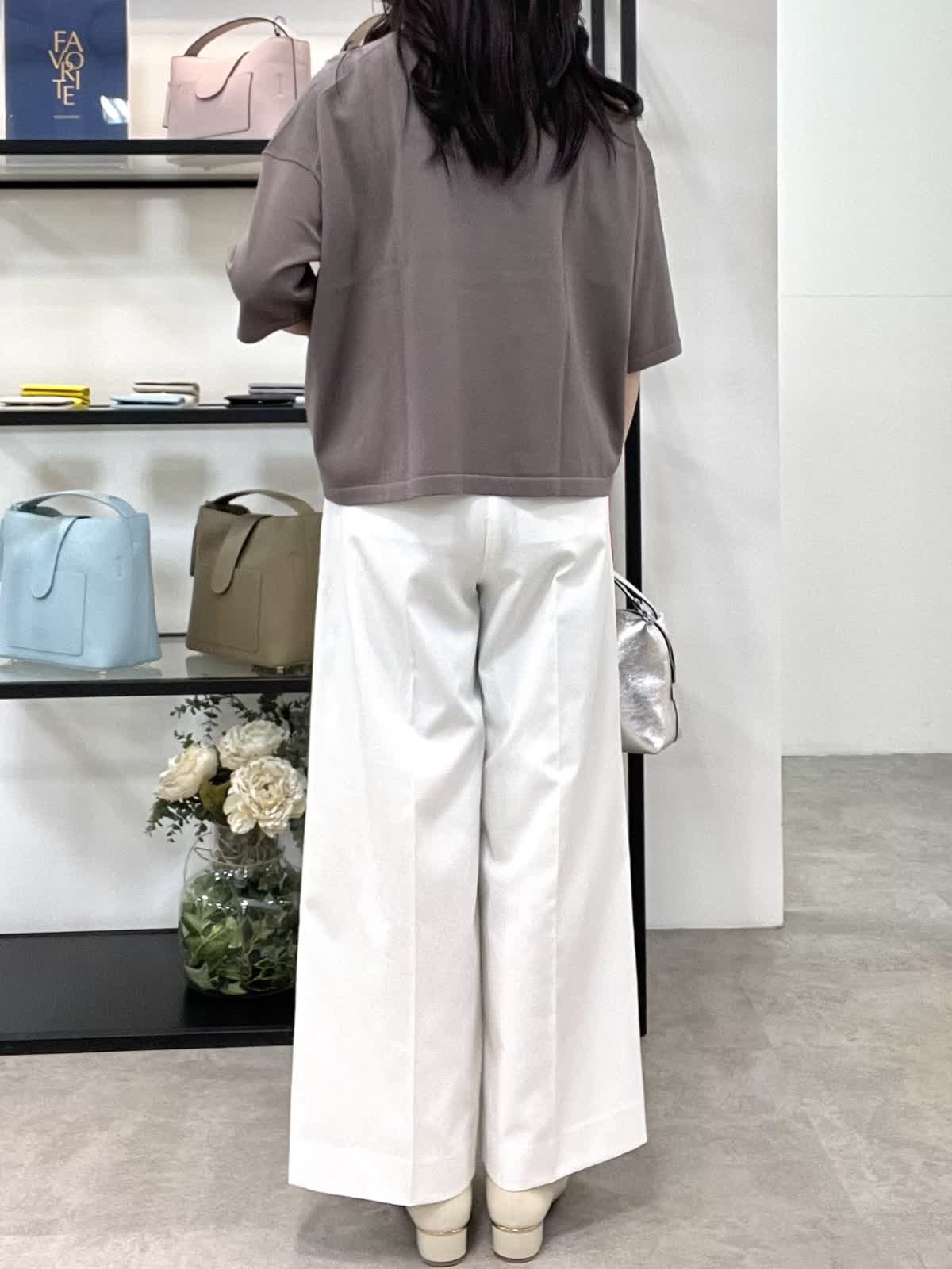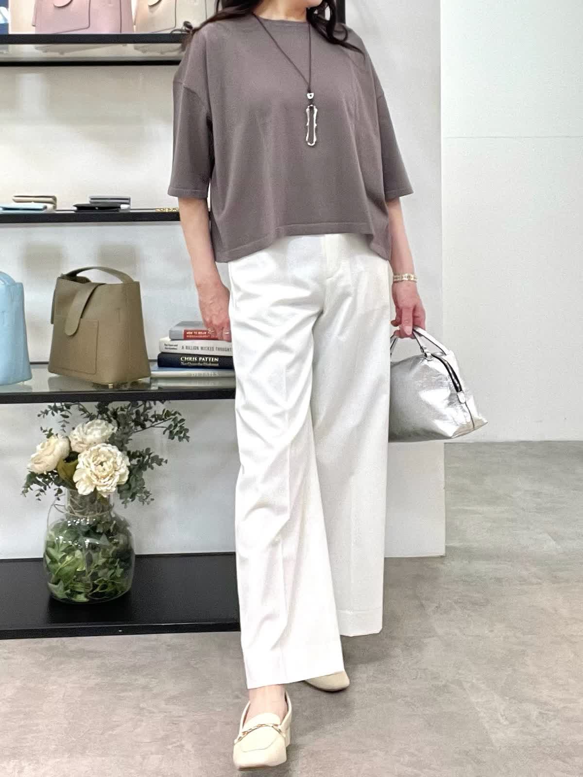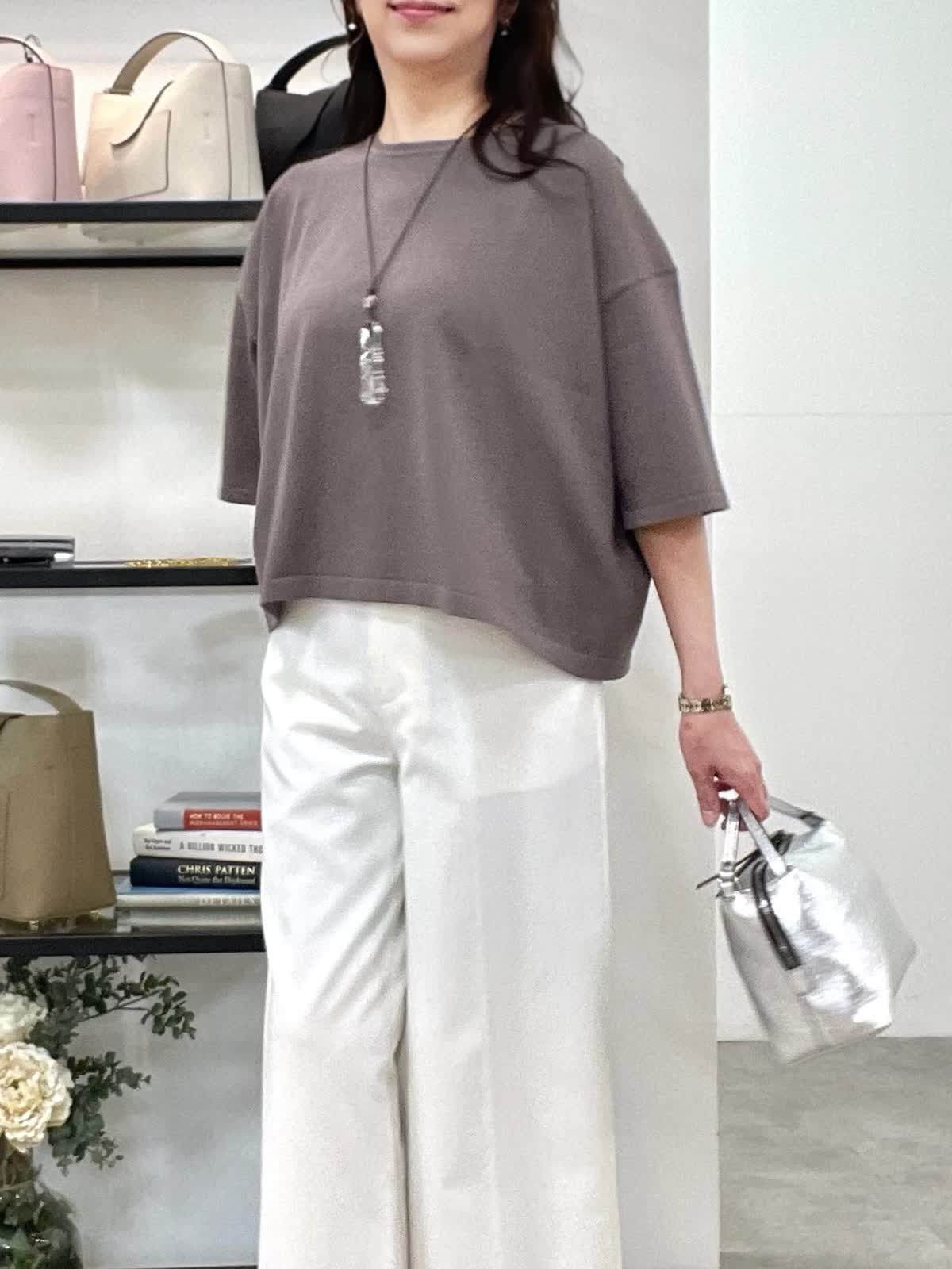 【着用サイズ】全て9号 【着用カラー】ニット:モカチャ パンツ:オフホワイト 休日お出かけコーデ。ゆったりとしたオーバーサイズのプルオーバーニット。通気性が良くさらっとした着心地で、Tシャツ感覚で着用いただけます。やや短めの着丈でバランスが取りやすく、肘が隠れる5分袖も使いやすいです。大人っぽくオフホワイトのパンツを合わせました。