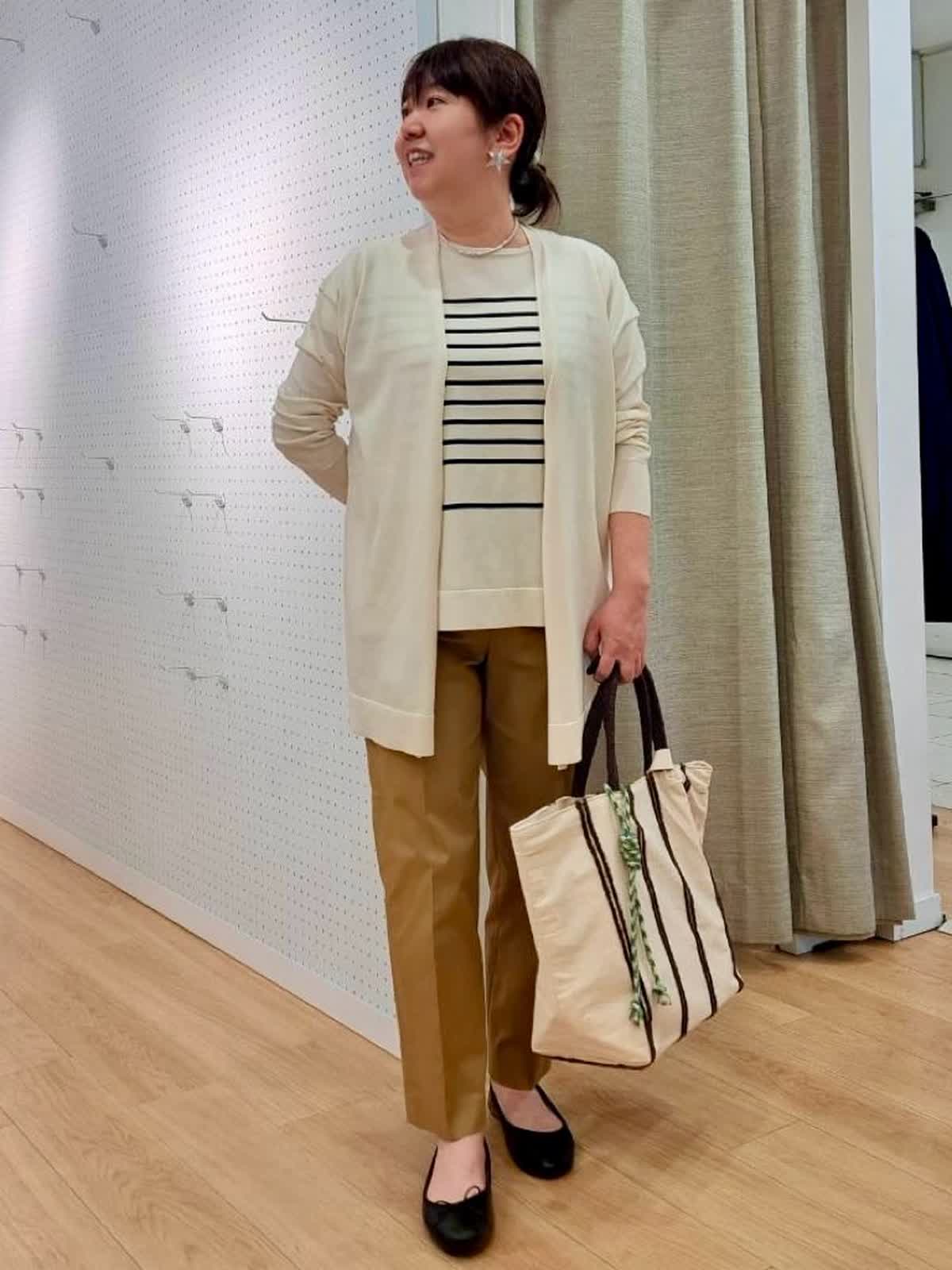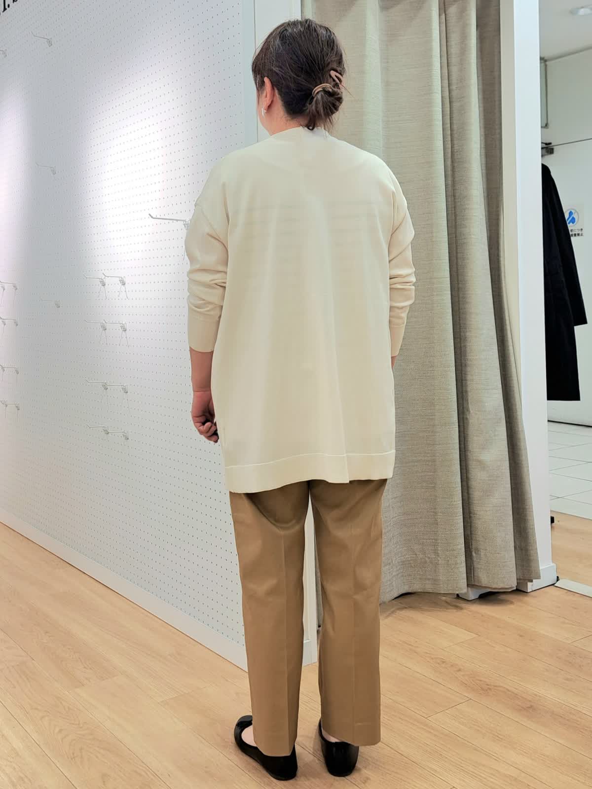 【着用カラー/着用サイズ】アンサンブル:グレーベージュ:9号/パンツ:キャメル:9号 春のお出かけスタイリング アンサンブルで着られるので忙しい朝などはお洋服にも悩まずコーディネートができます。スッキリと見えるラインが綺麗なパンツとも良く合います。
