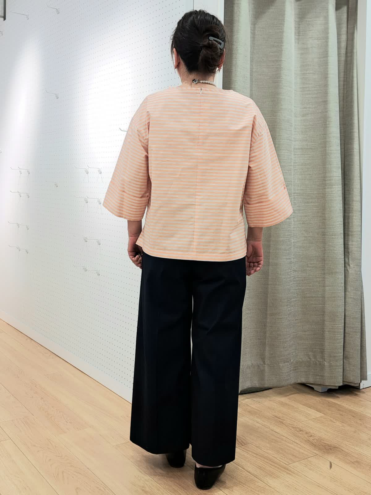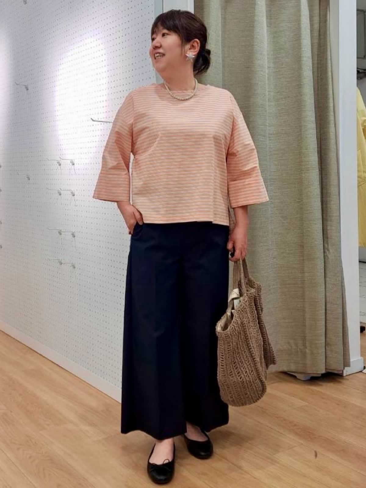 【着用カラー/着用サイズ】ブラウス:オレンジ:フリー/パンツ:ネイビー:9号 春のお出かけスタイリング 気になるところもカバーしてくれるブラウスはボーダー柄でカジュアルな印象になりがちですがパールのネックレスなどをプラスすると大人カジュアルになります