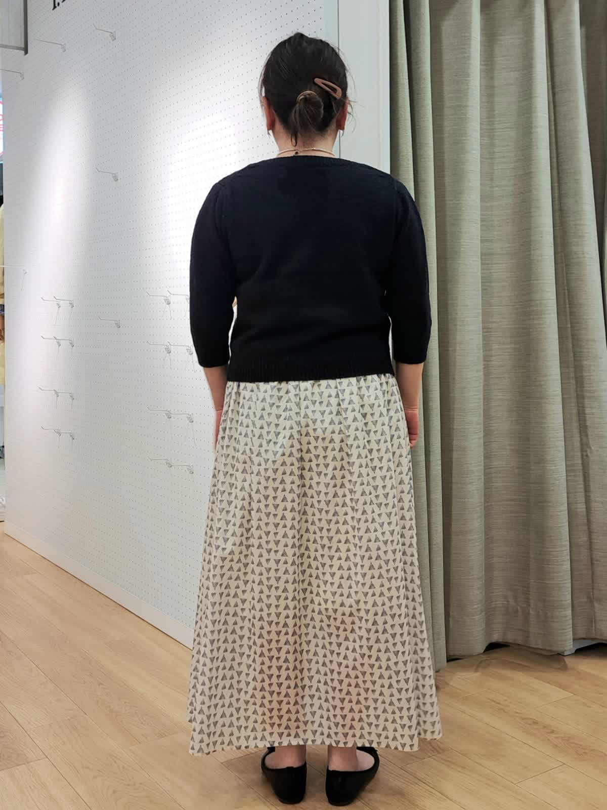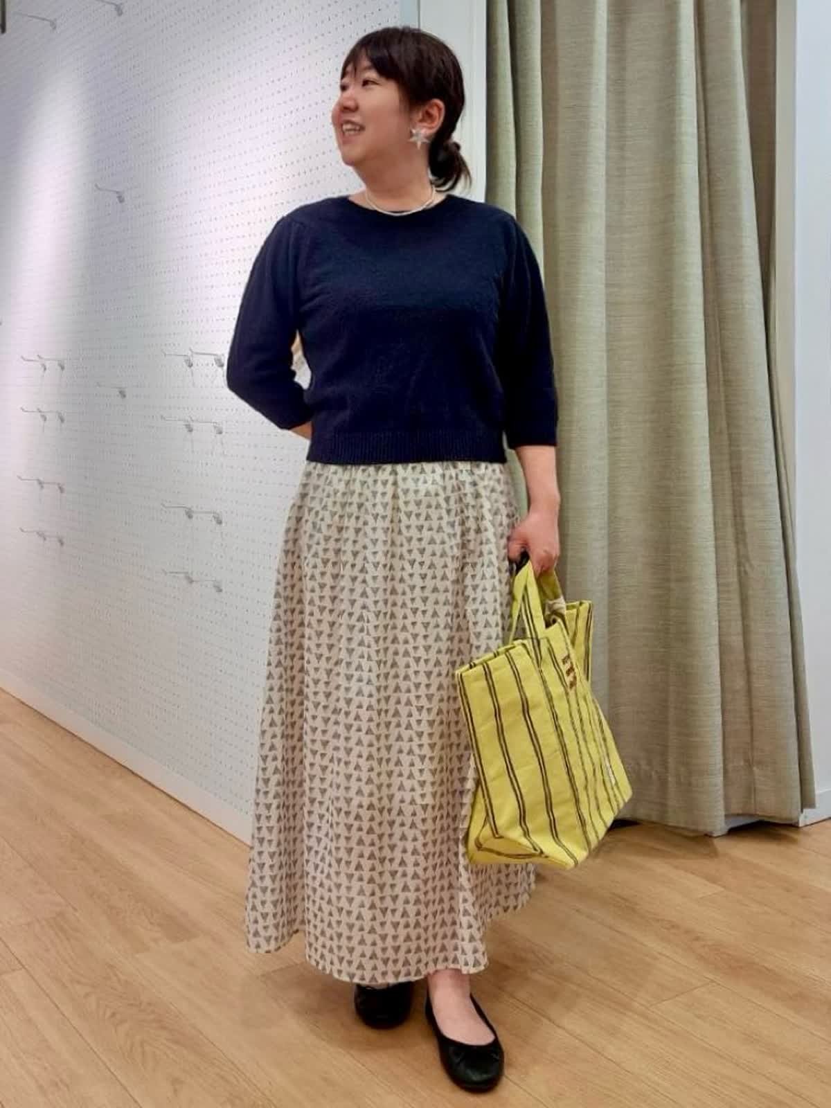 【着用カラー/着用サイズ】ニット:ネイビー:フリー/スカート:アイボリー:フリー 友達とランチに行くときのスタイリング トップスにはコンパクトで着丈も短めなニットを合わしてスカートを合わせるとスッキリな印象に なります