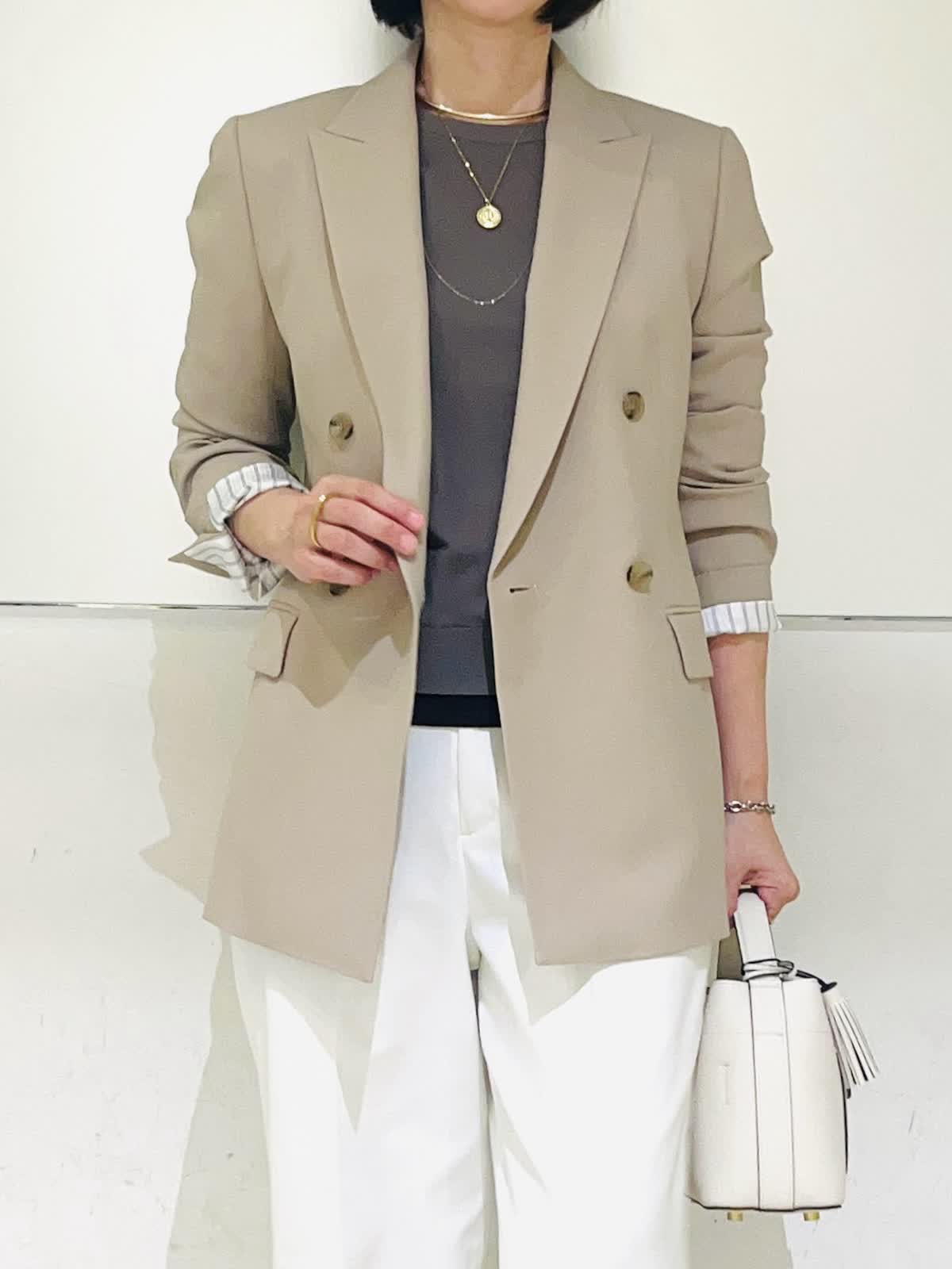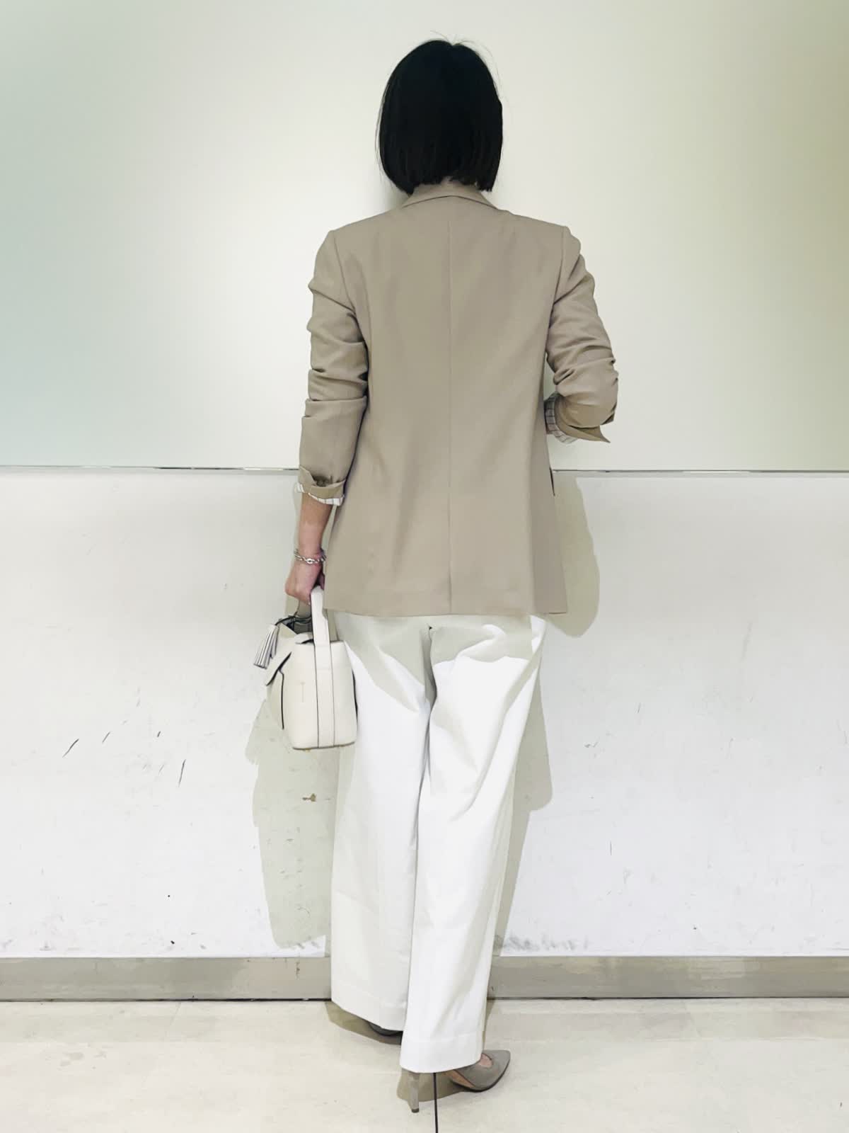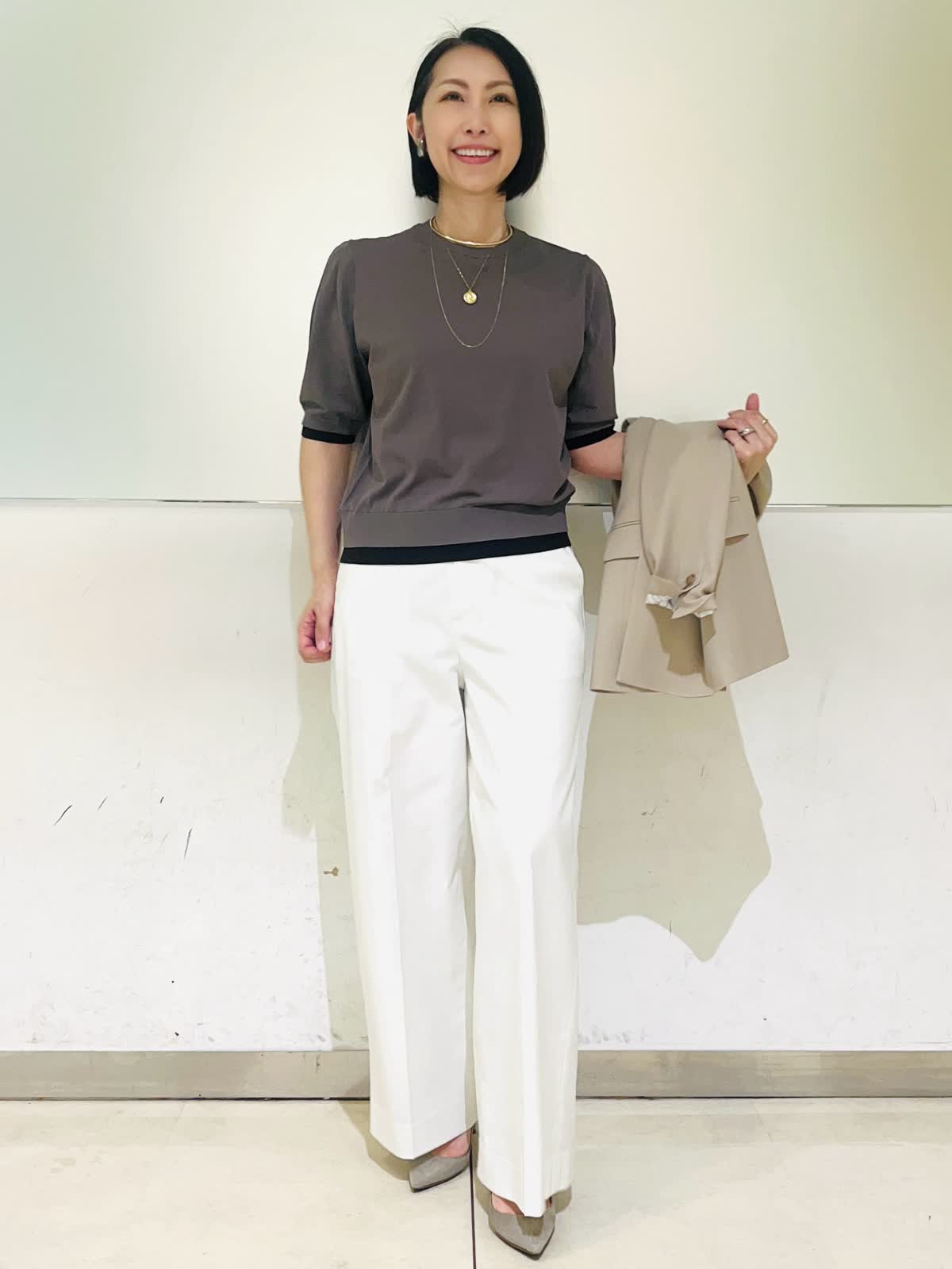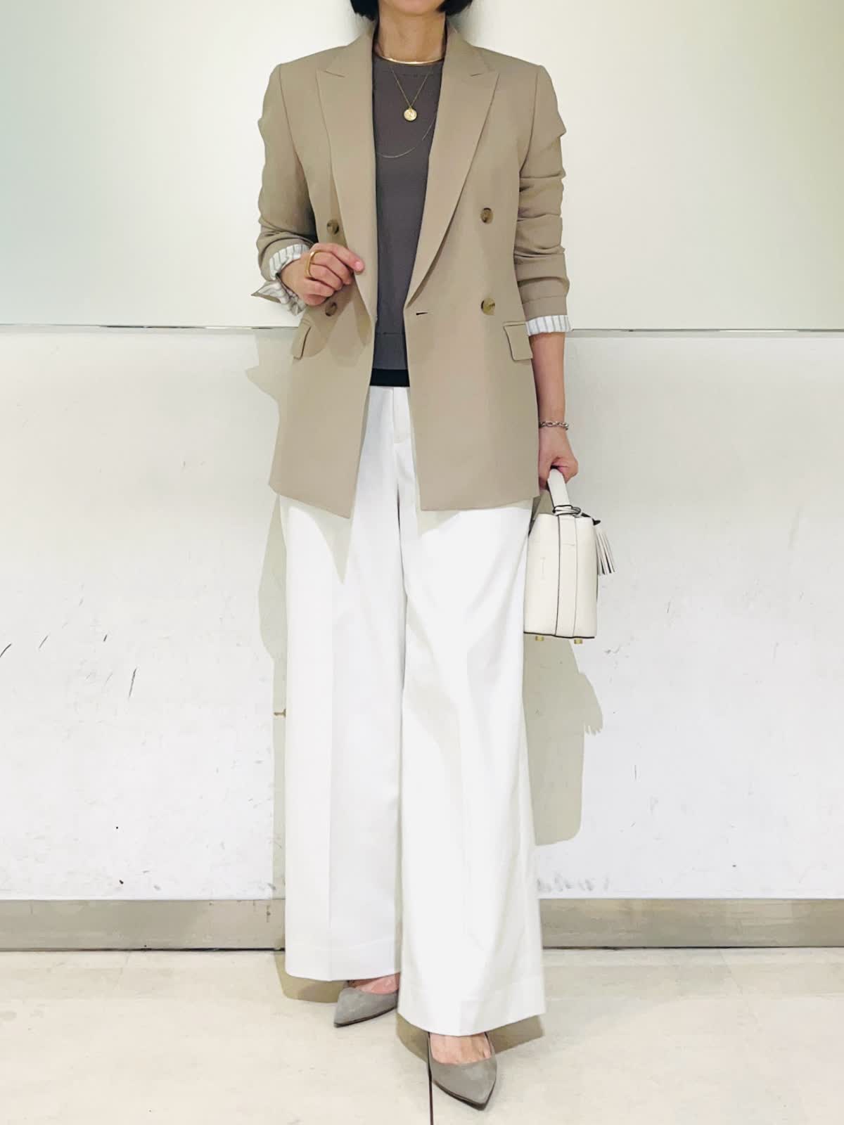 【着用アイテム】すべて9号 【着用カラー】ジャケット:ベージュ ニット:モカチャ パンツ:オフホワイト 春のオフィスコーディネート。柔らかなベージュのジャケットにオフホワイトのパンツが清涼感があり女性らしい組み合わせ。インナーにはトレンドカラーのブラウンのニットを合わせました。ニットは袖と裾が配色になっていてインしなくてもスタイリングが決まります。