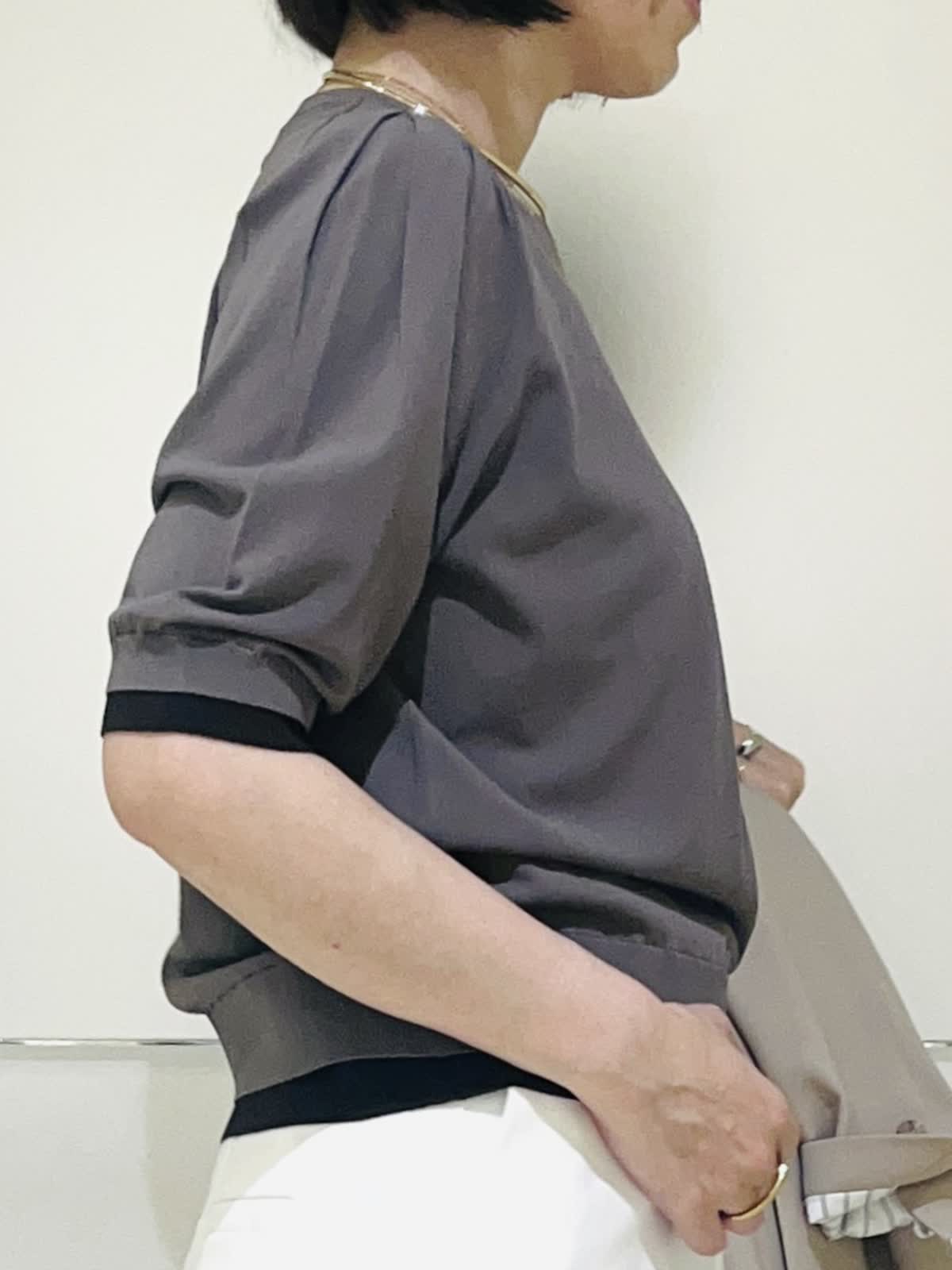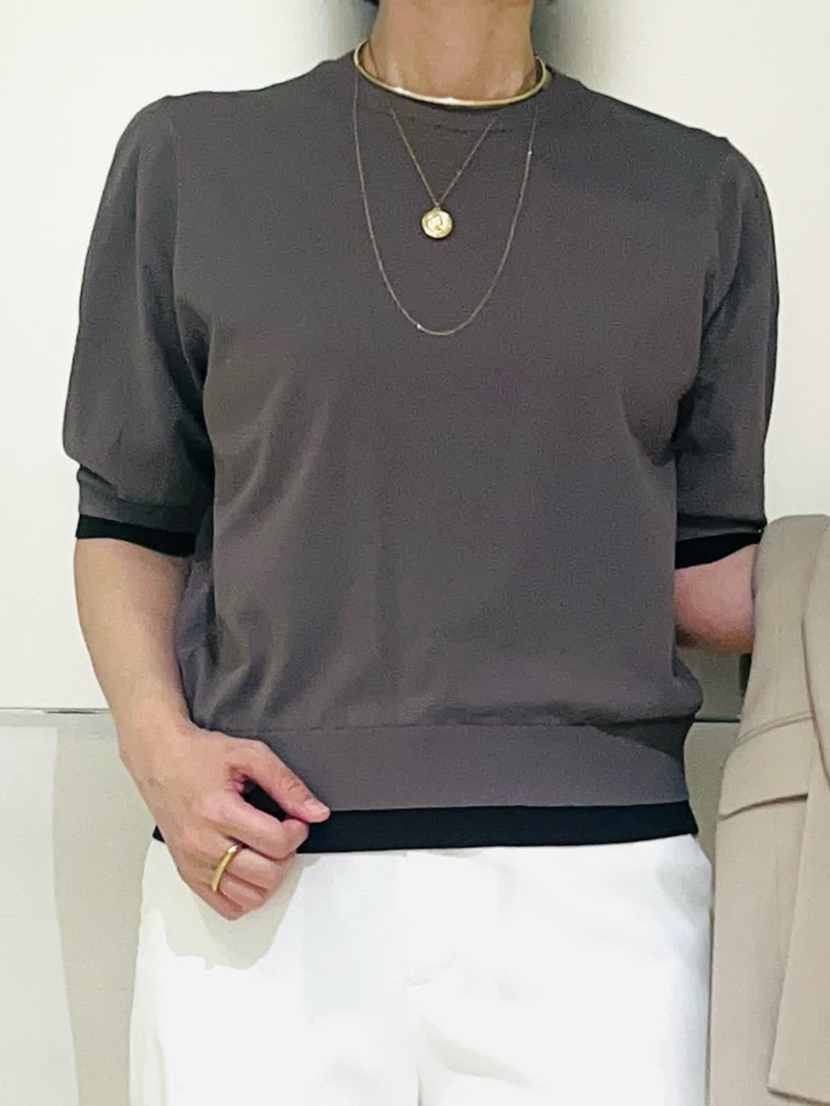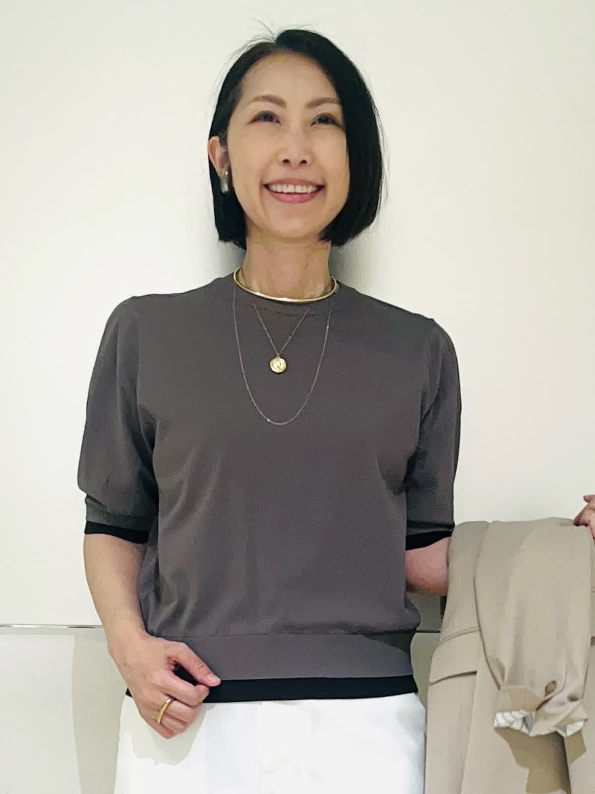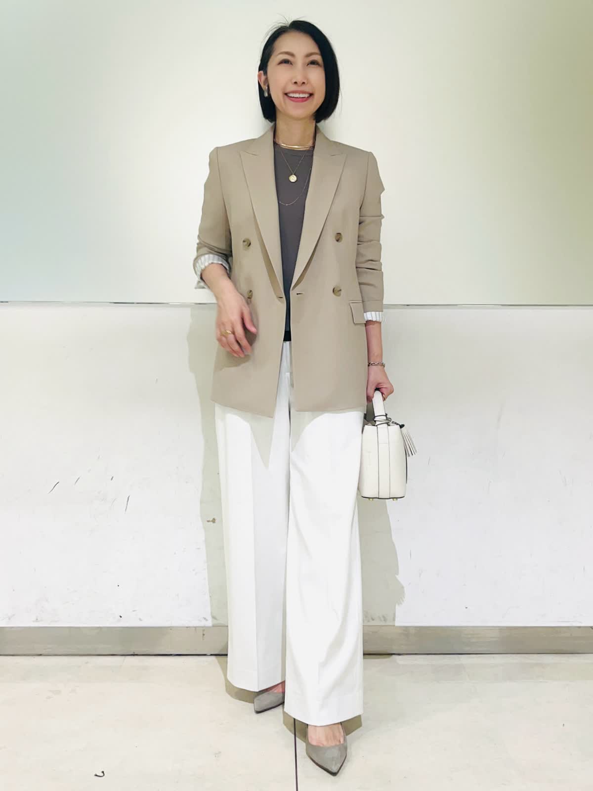 【着用アイテム】すべて9号 【着用カラー】ジャケット:ベージュ ニット:モカチャ パンツ:オフホワイト 春のオフィスコーディネート。柔らかなベージュのジャケットにオフホワイトのパンツが清涼感があり女性らしい組み合わせ。インナーにはトレンドカラーのブラウンのニットを合わせました。ニットは袖と裾が配色になっていてインしなくてもスタイリングが決まります。
