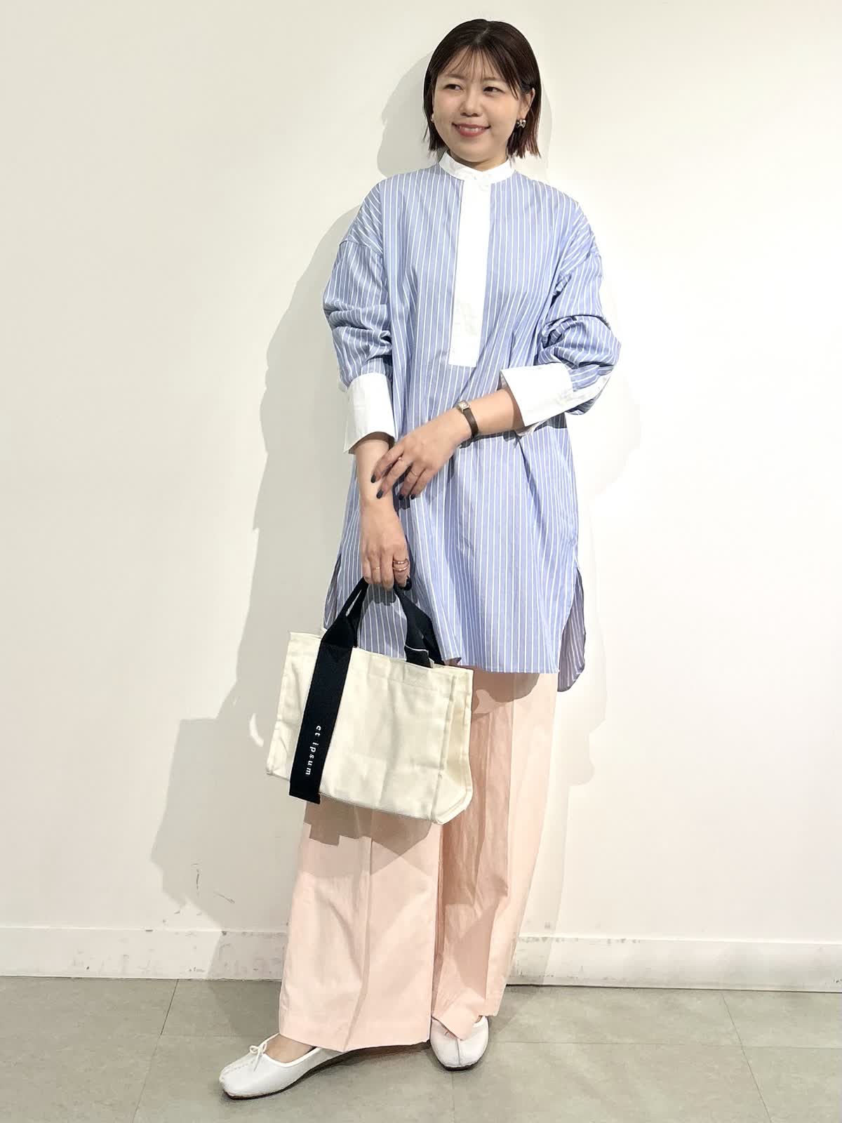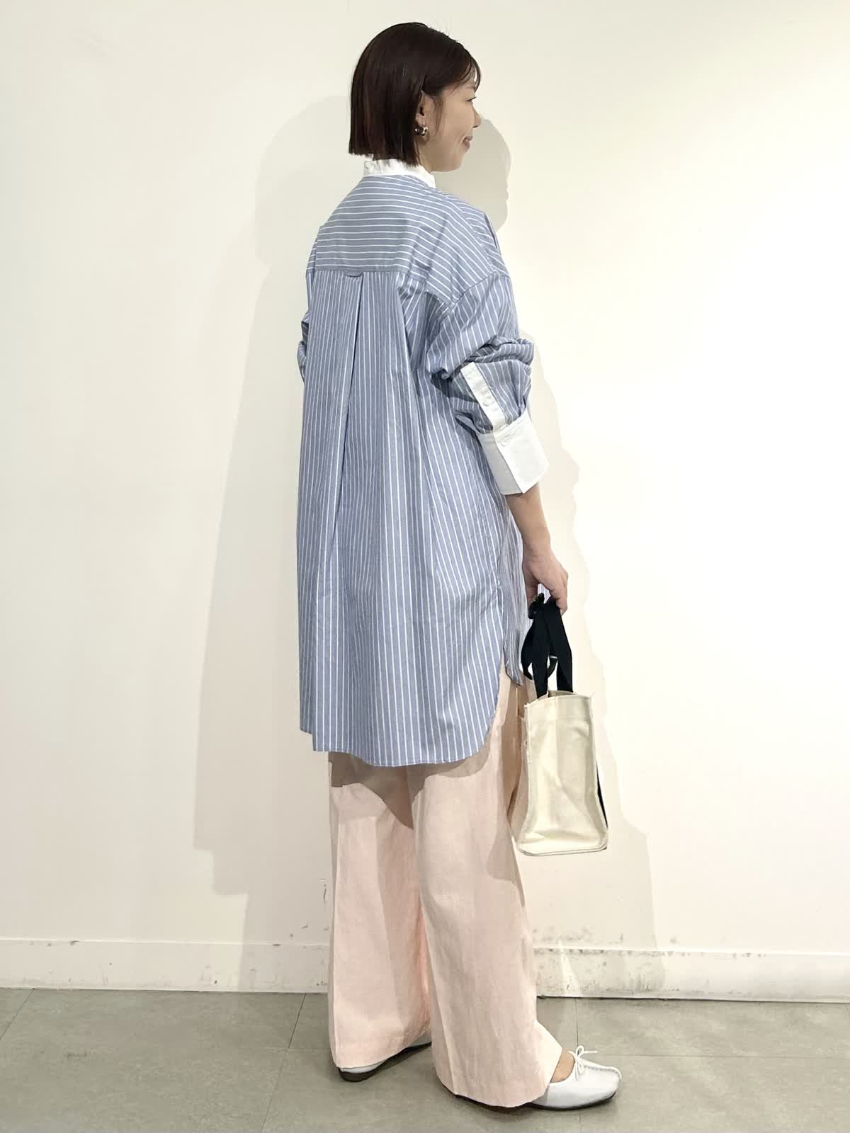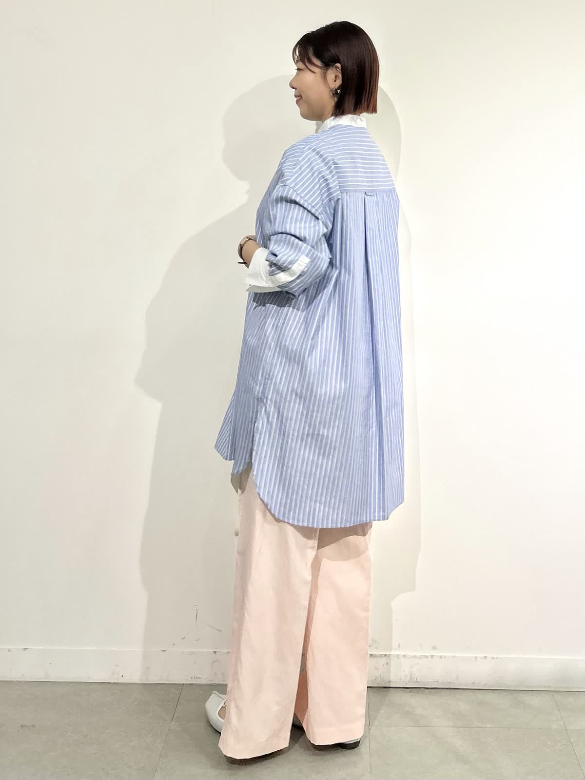 【着用カラー】ブラウス:ストライプ パンツ:ピンク シューズ: オフホワイト