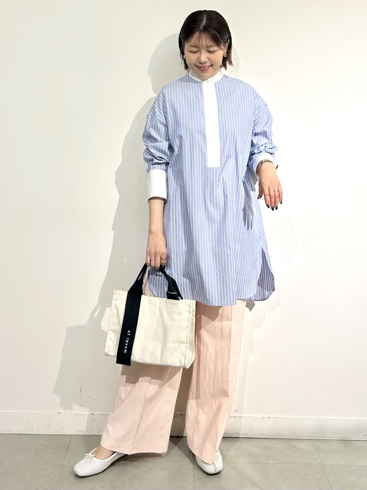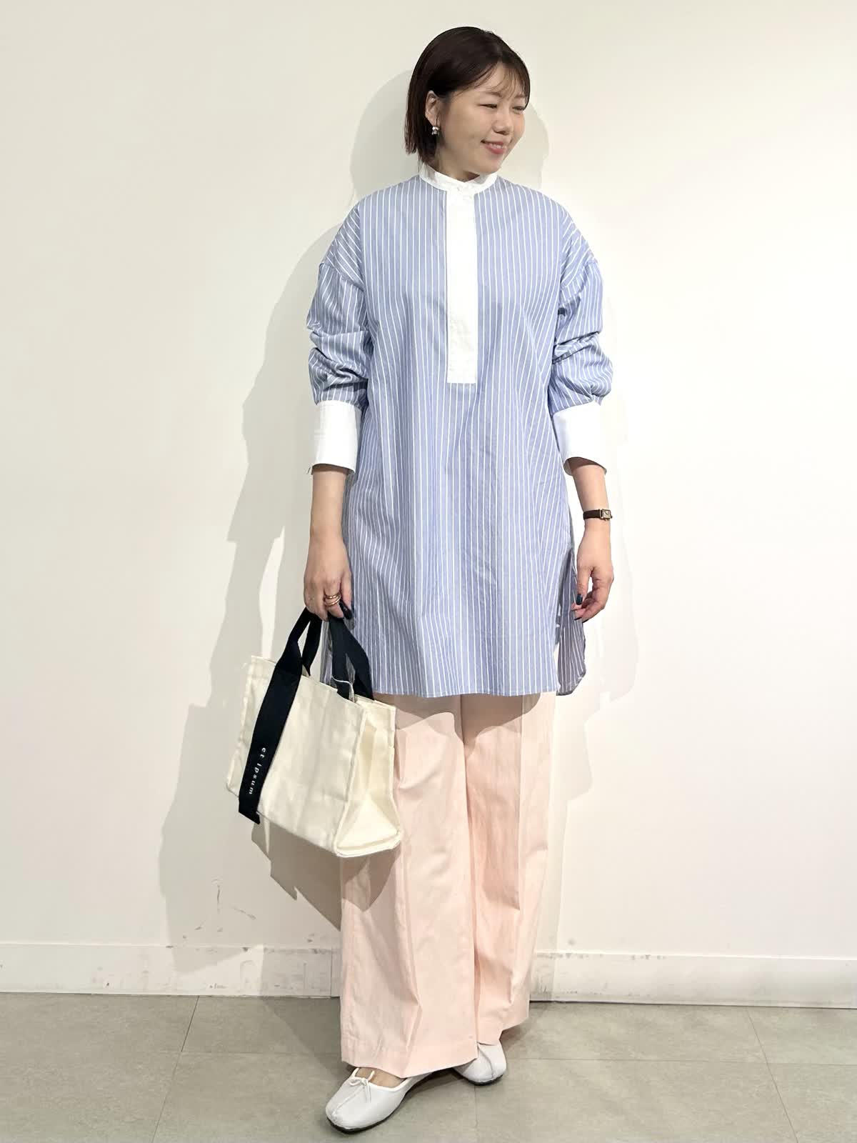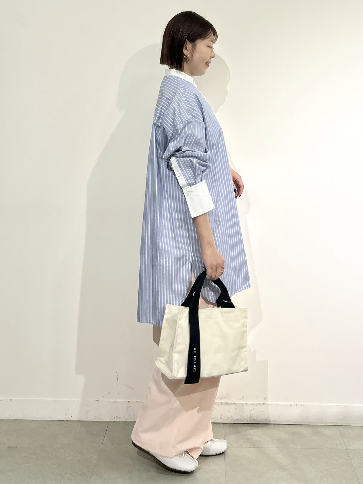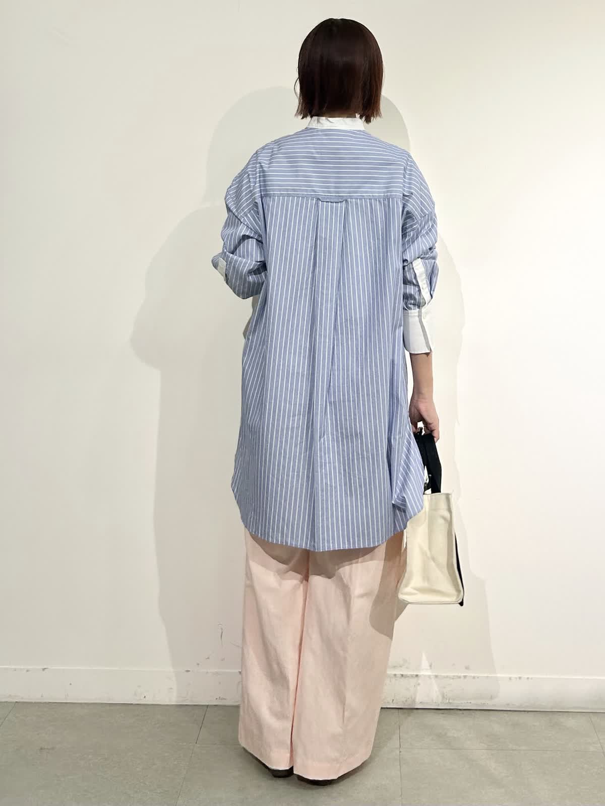 【着用カラー】ブラウス:ストライプ パンツ:ピンク シューズ: オフホワイト