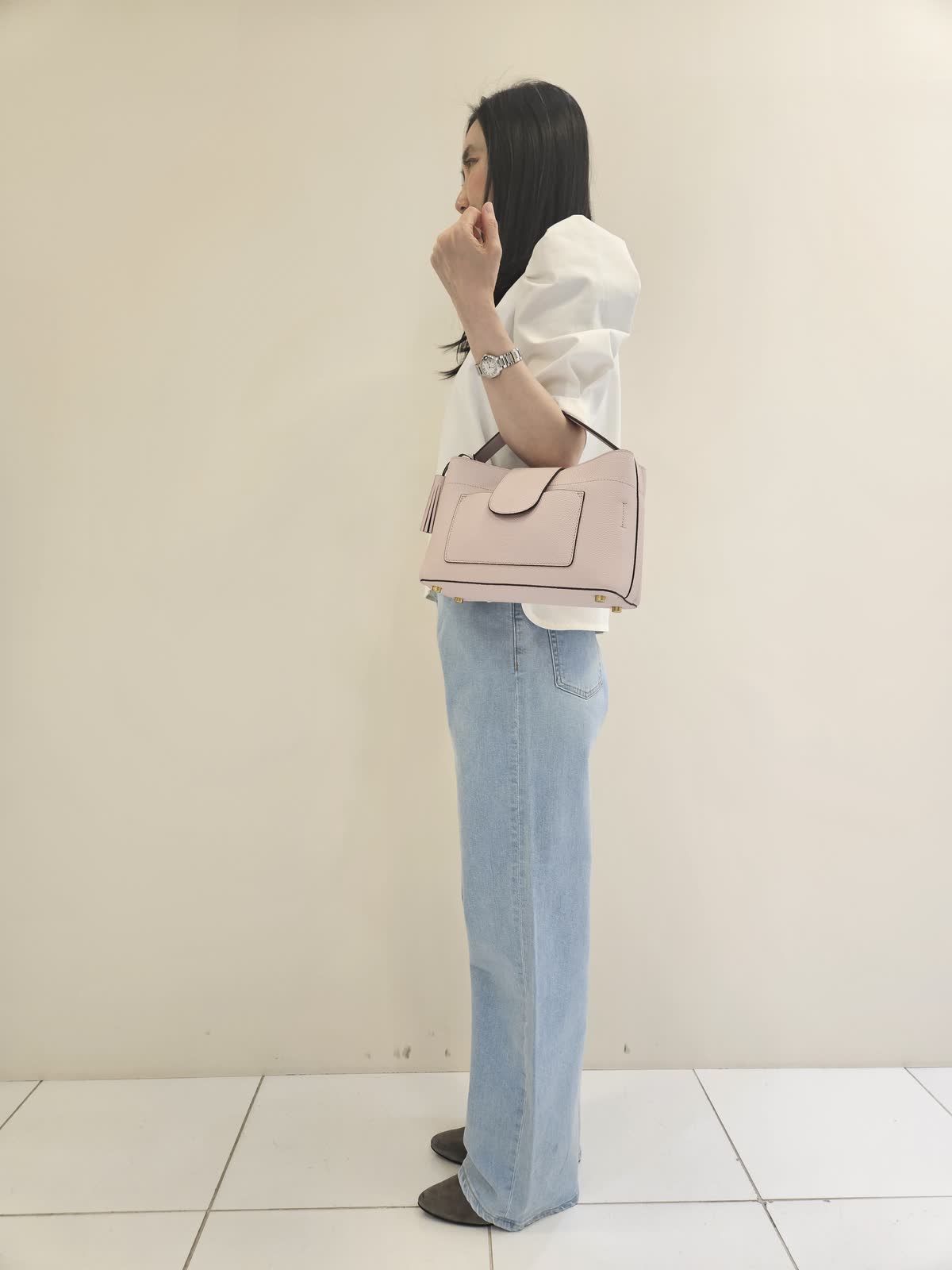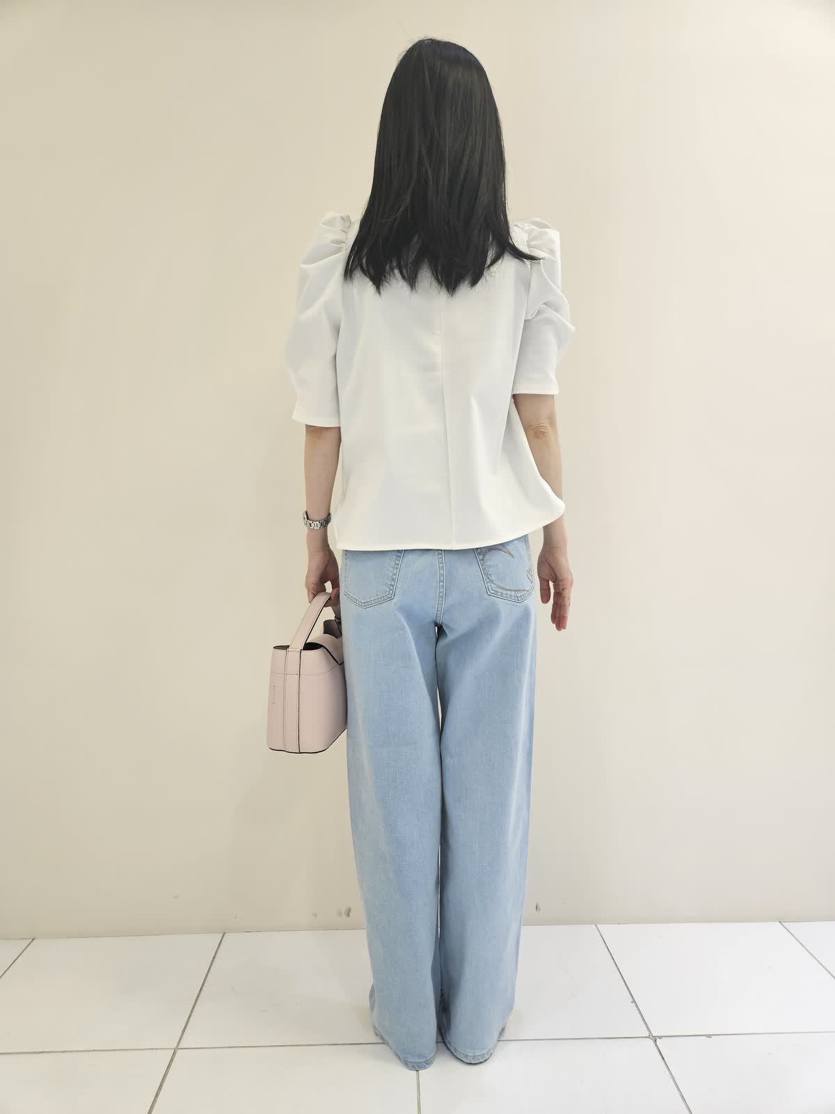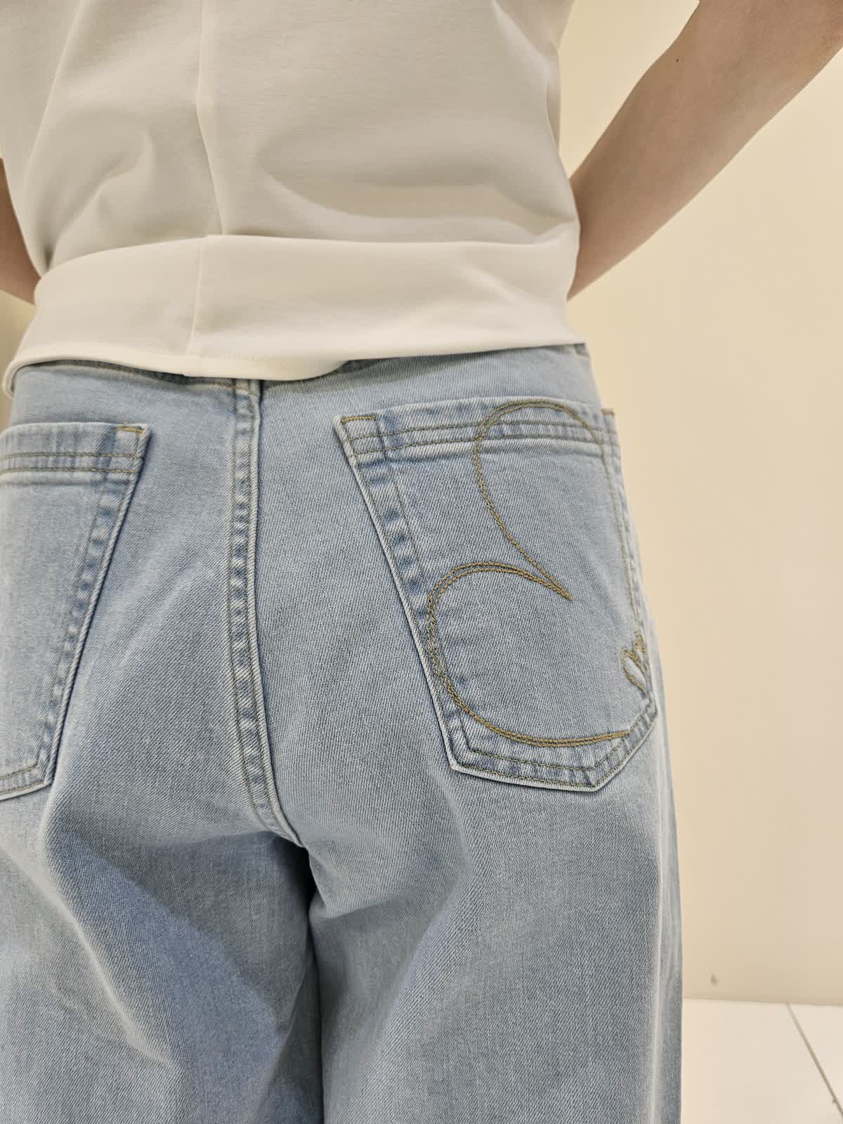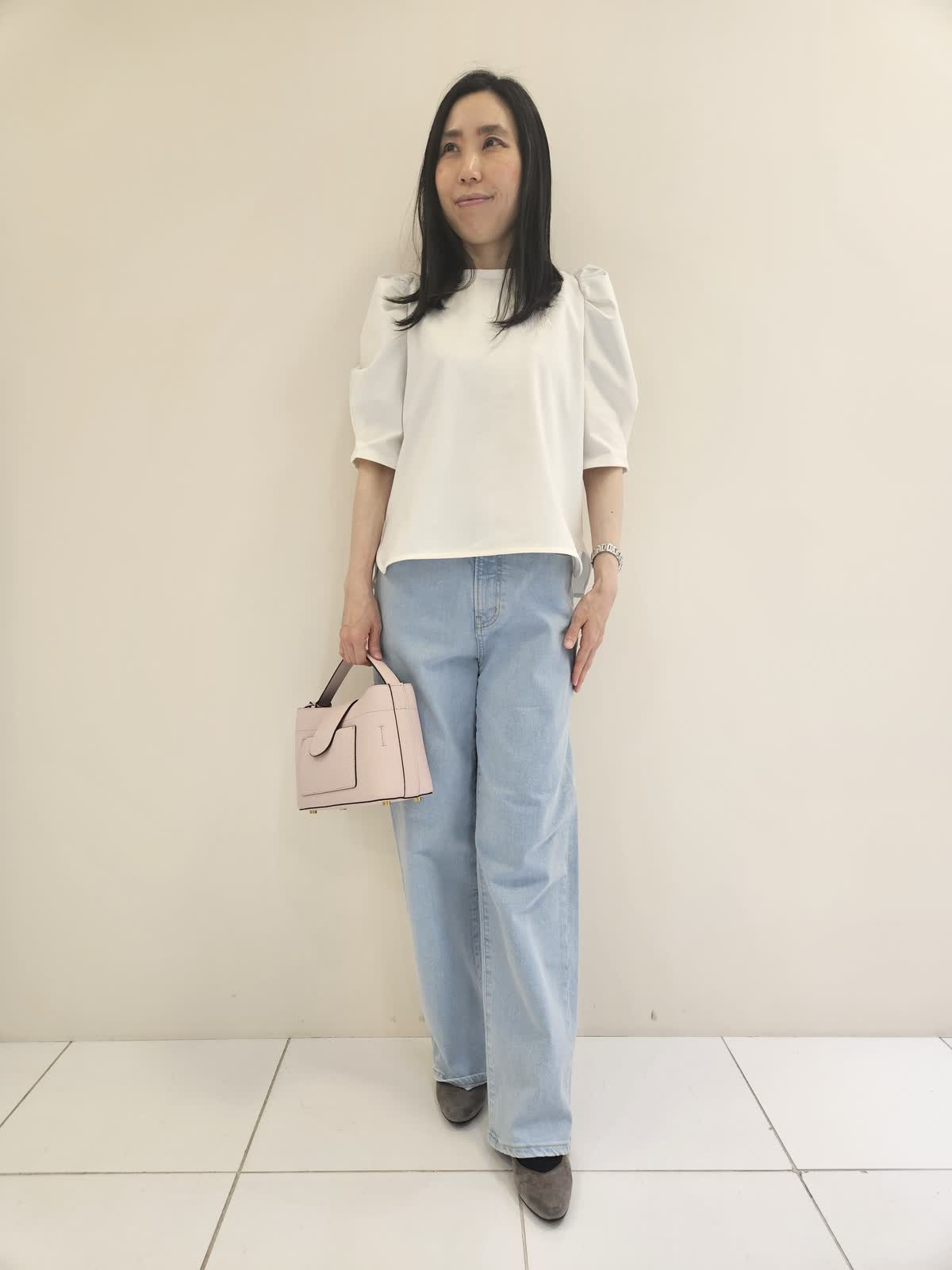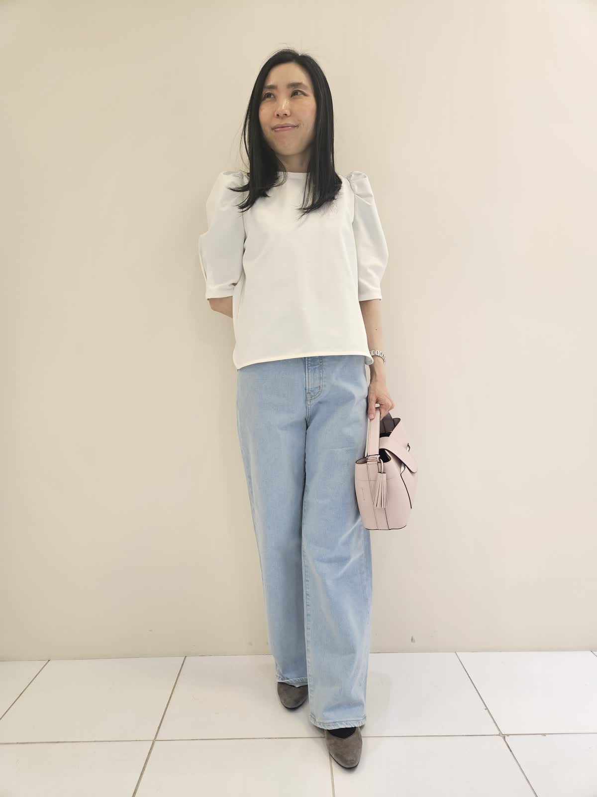 【着用サイズ・カラー】カットソー:オフホワイト9号・パンツ:サックス9号 ・バッグ:ピンク フリー 肩のデザインがお洒落なカットソーは胸元のロゴがポイントです。デニムも後ろポケットのハートの刺繍がポイントでストレッチがきいていて動きやすいです。バッグは優しい色合いで母の日のギフトにもお勧めです。
