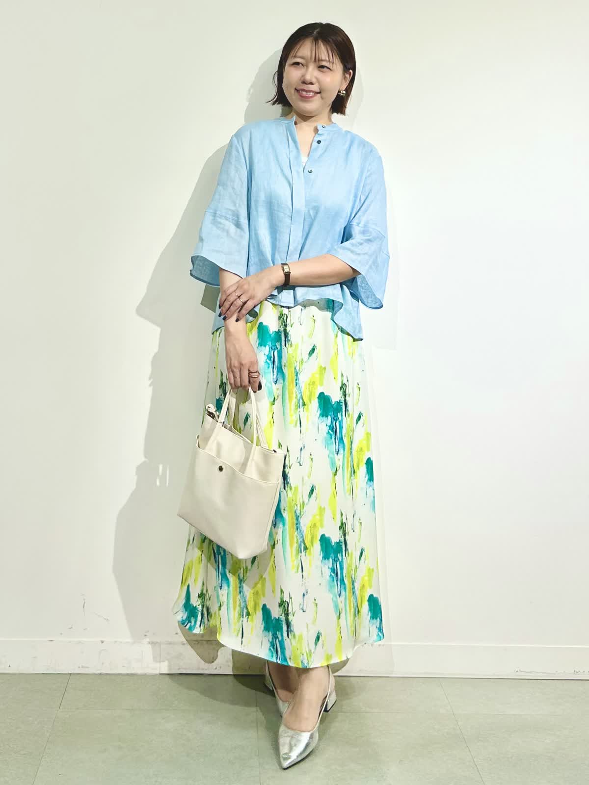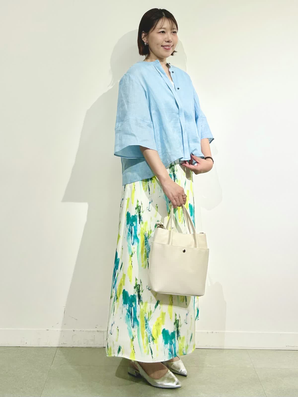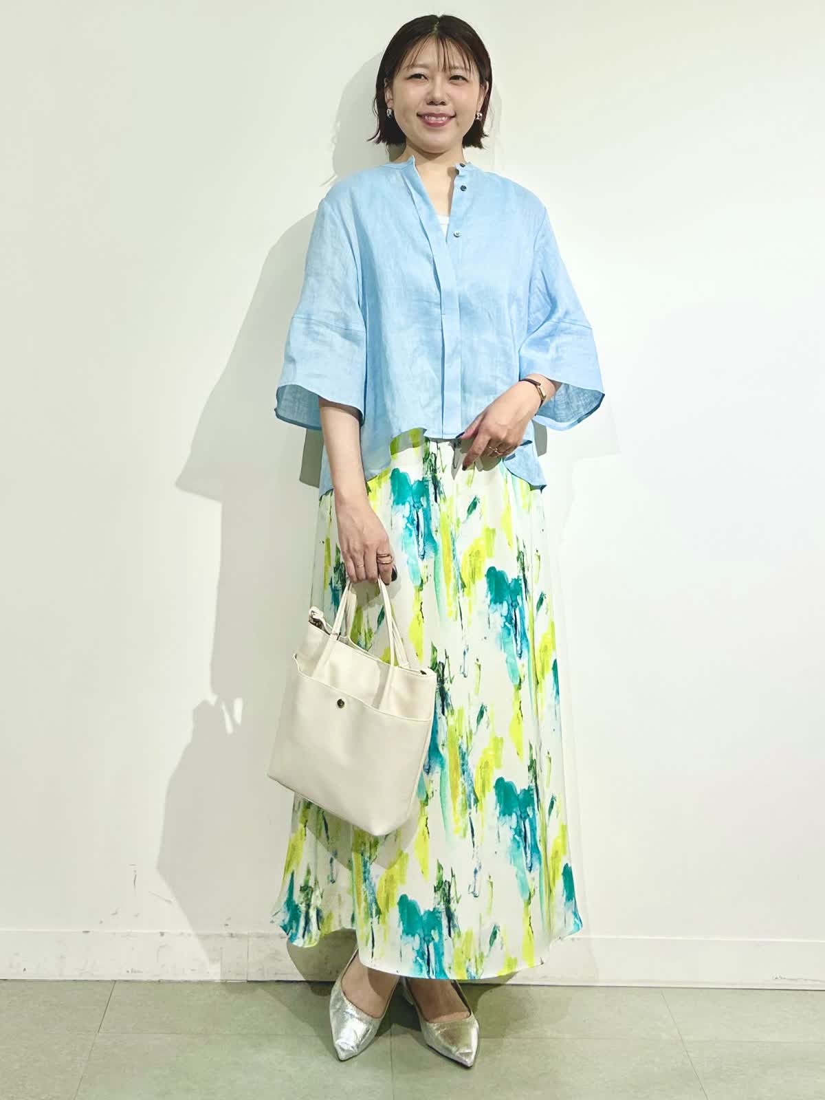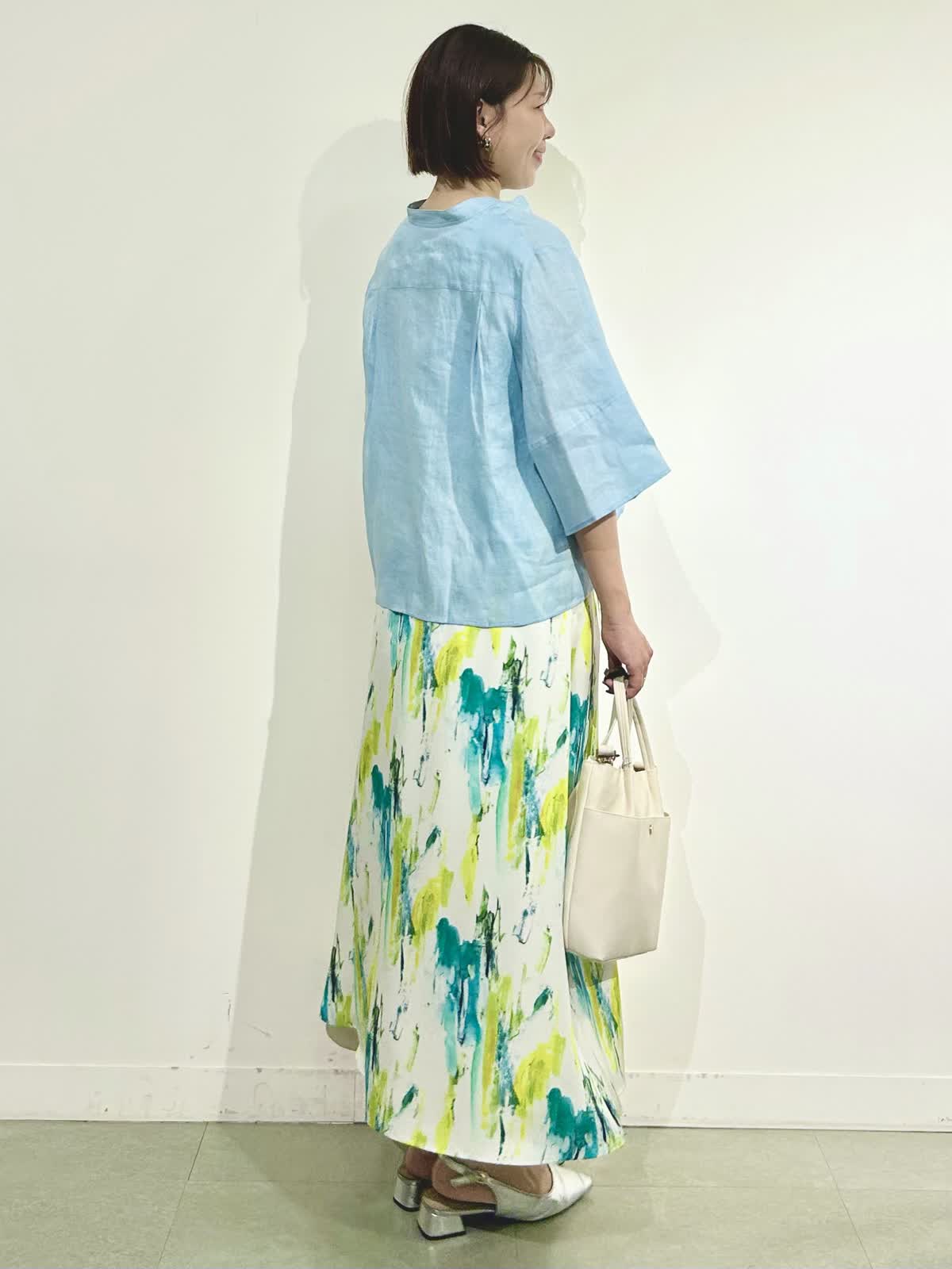 【着用カラー】ブラウス:サックス スカート:ペパーミント パンツ:グレーベージュ タンク:オフホワイト バッグ:グレー