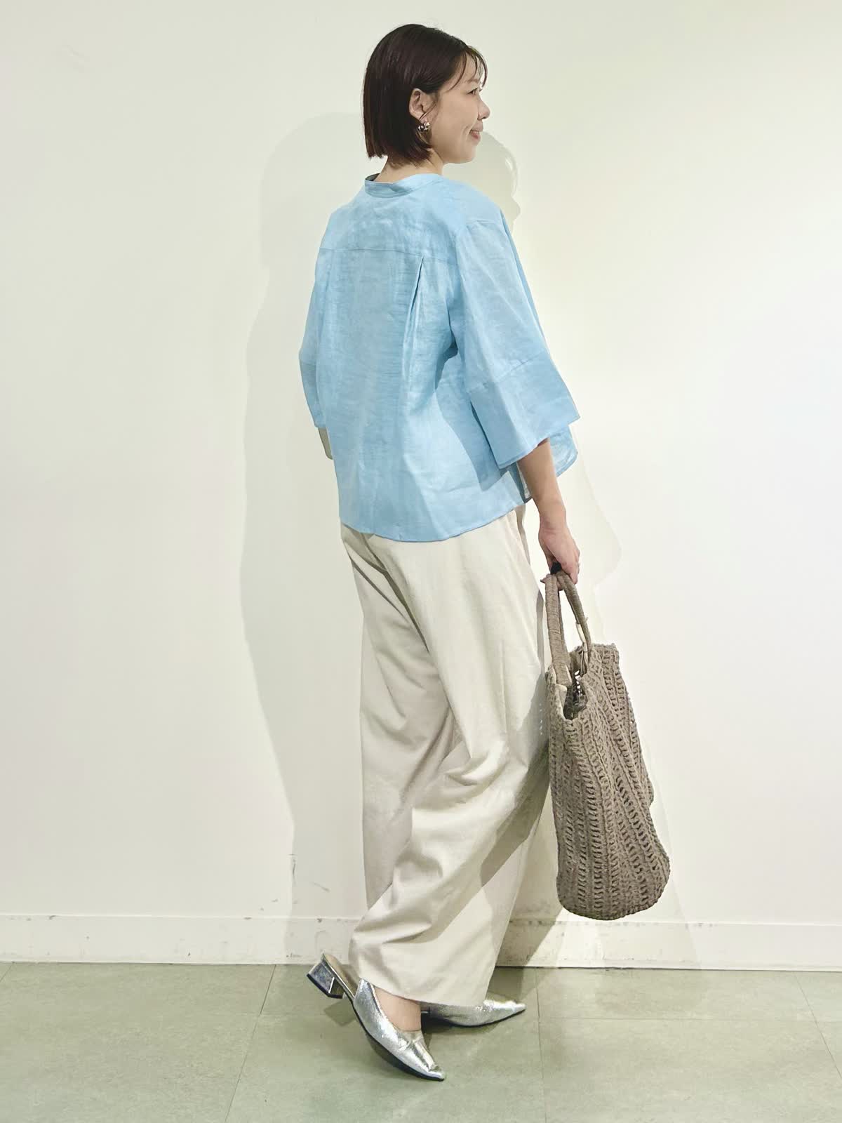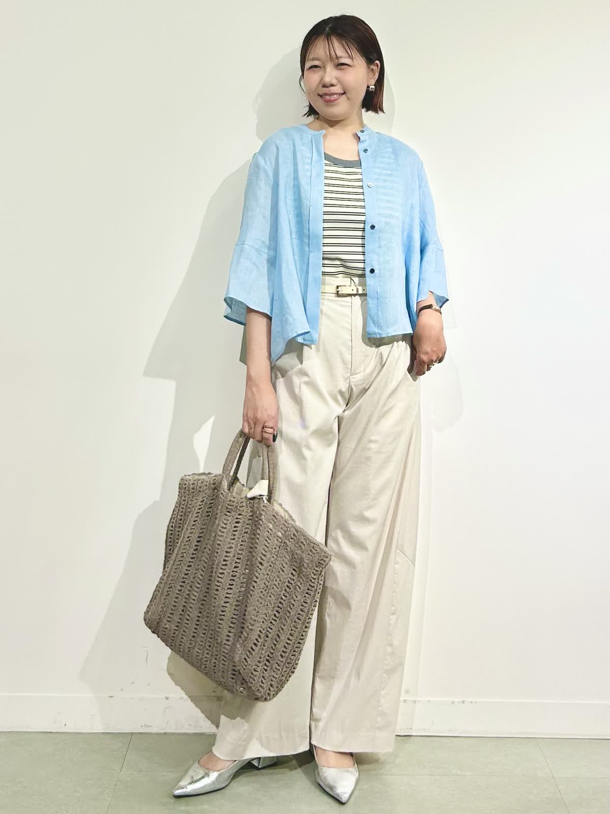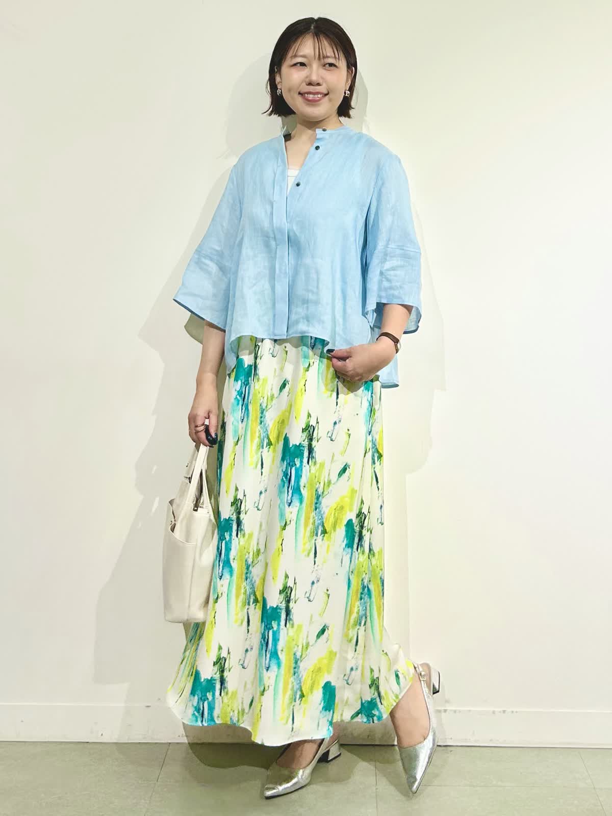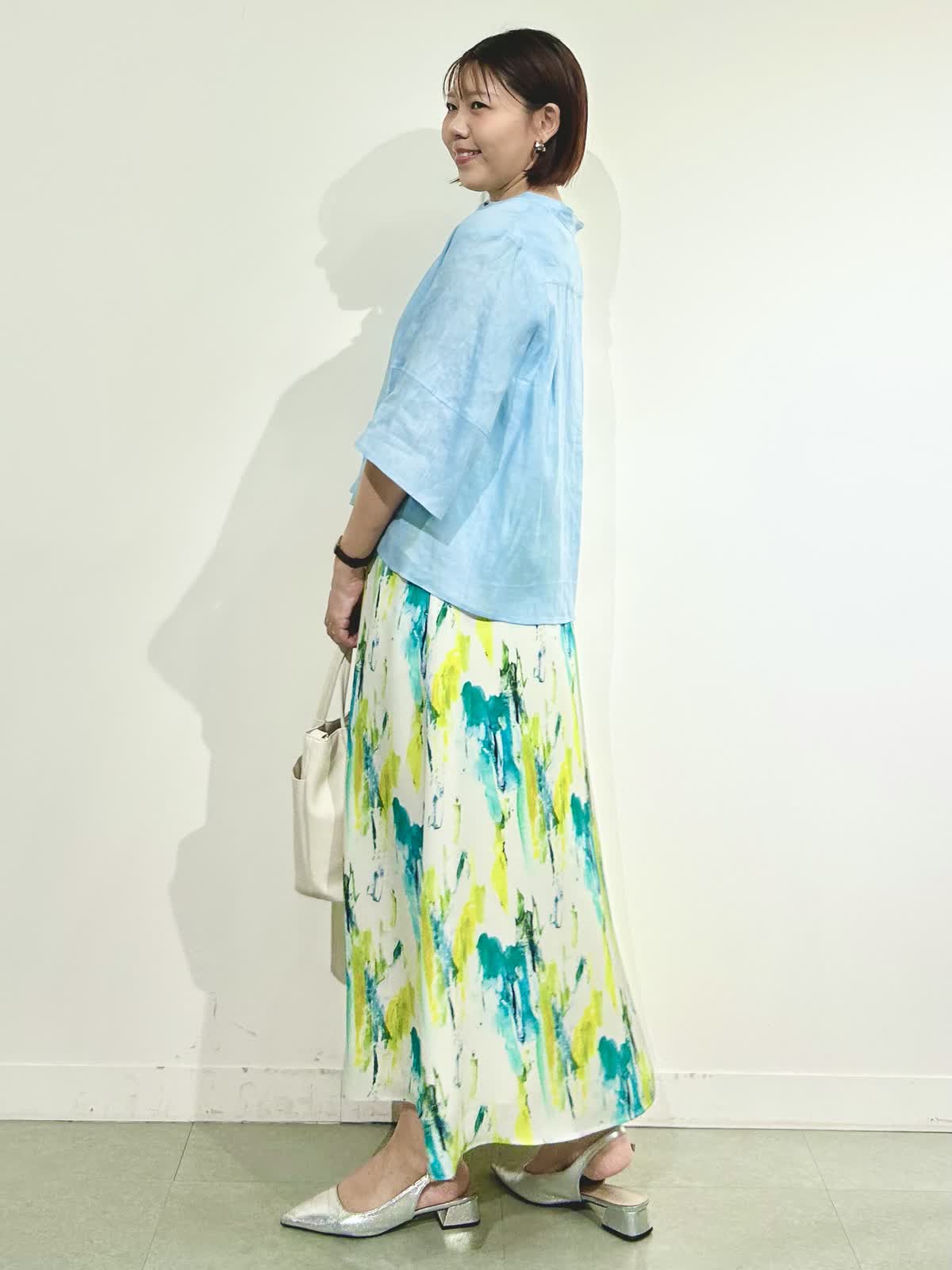 【着用カラー】ブラウス:サックス スカート:ペパーミント パンツ:グレーベージュ タンク:オフホワイト バッグ:グレー