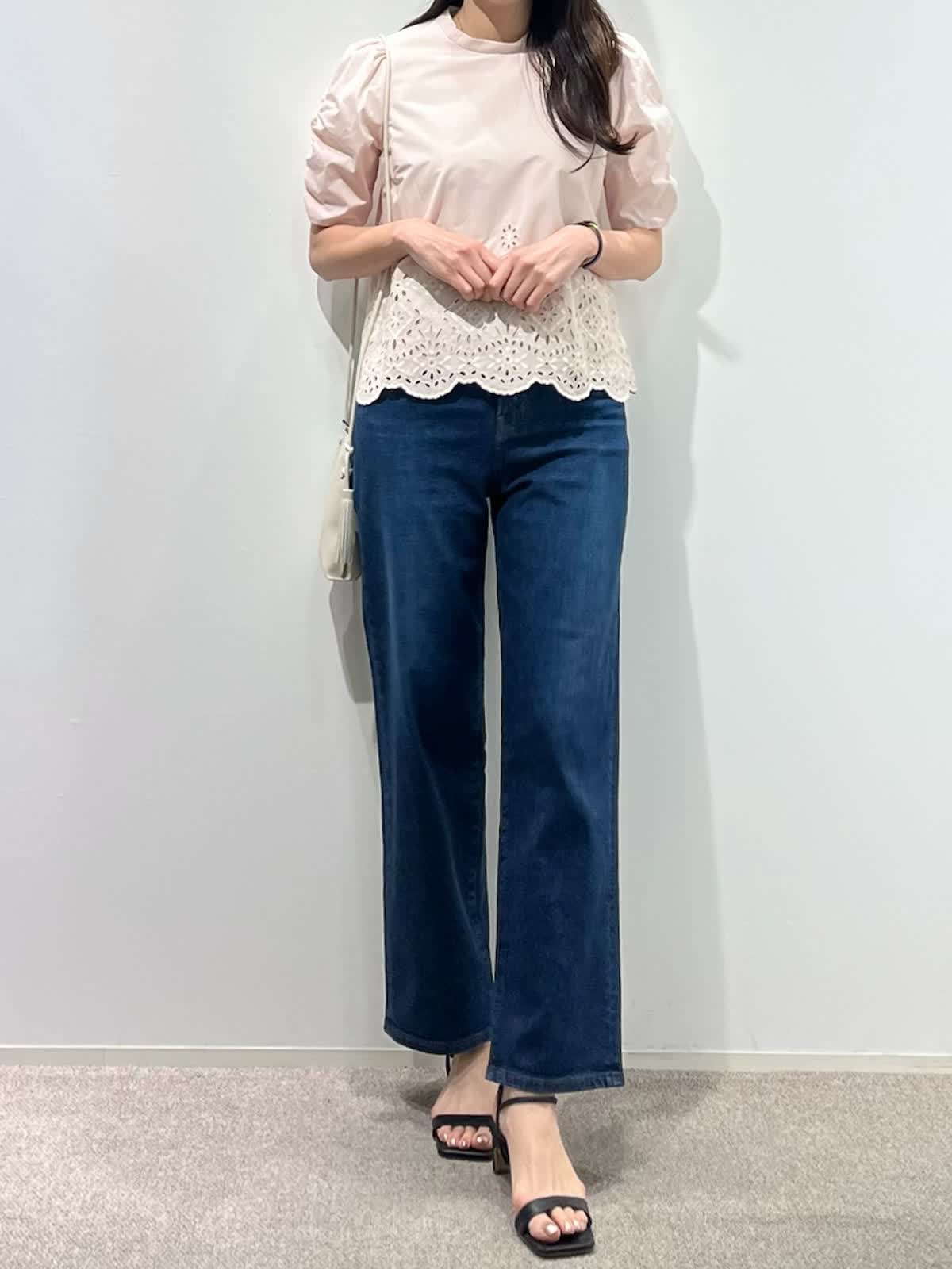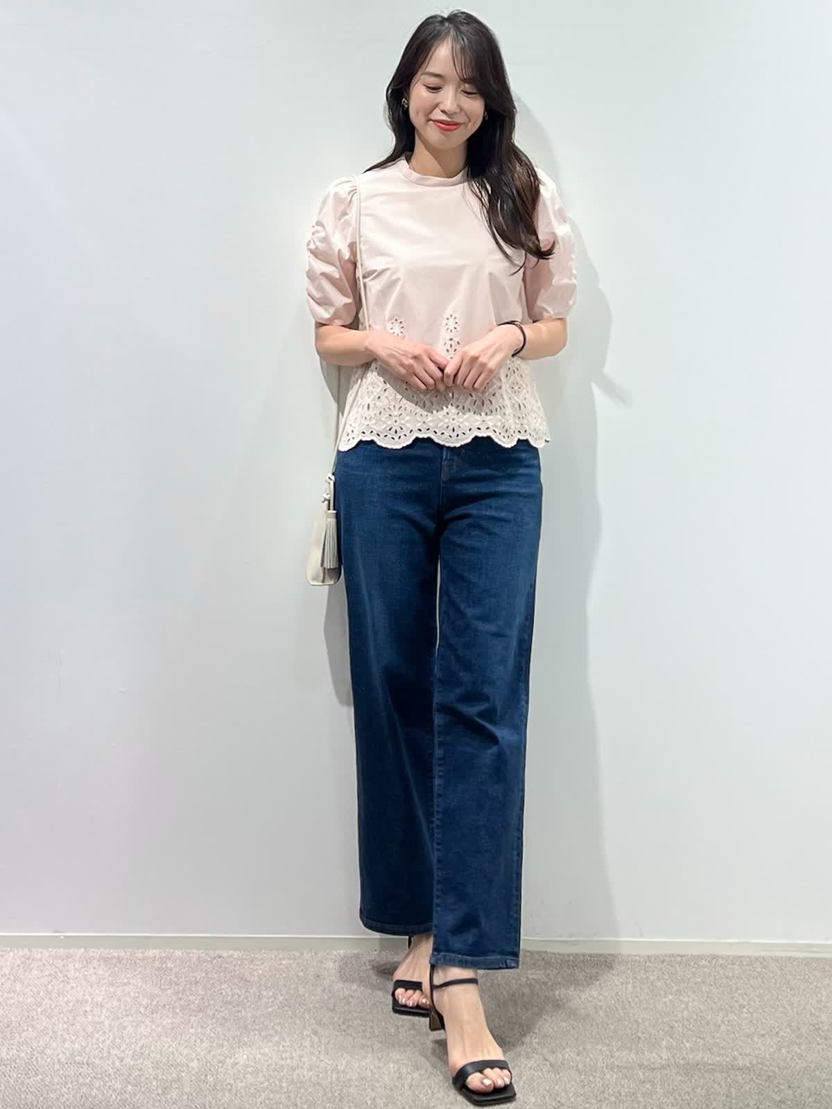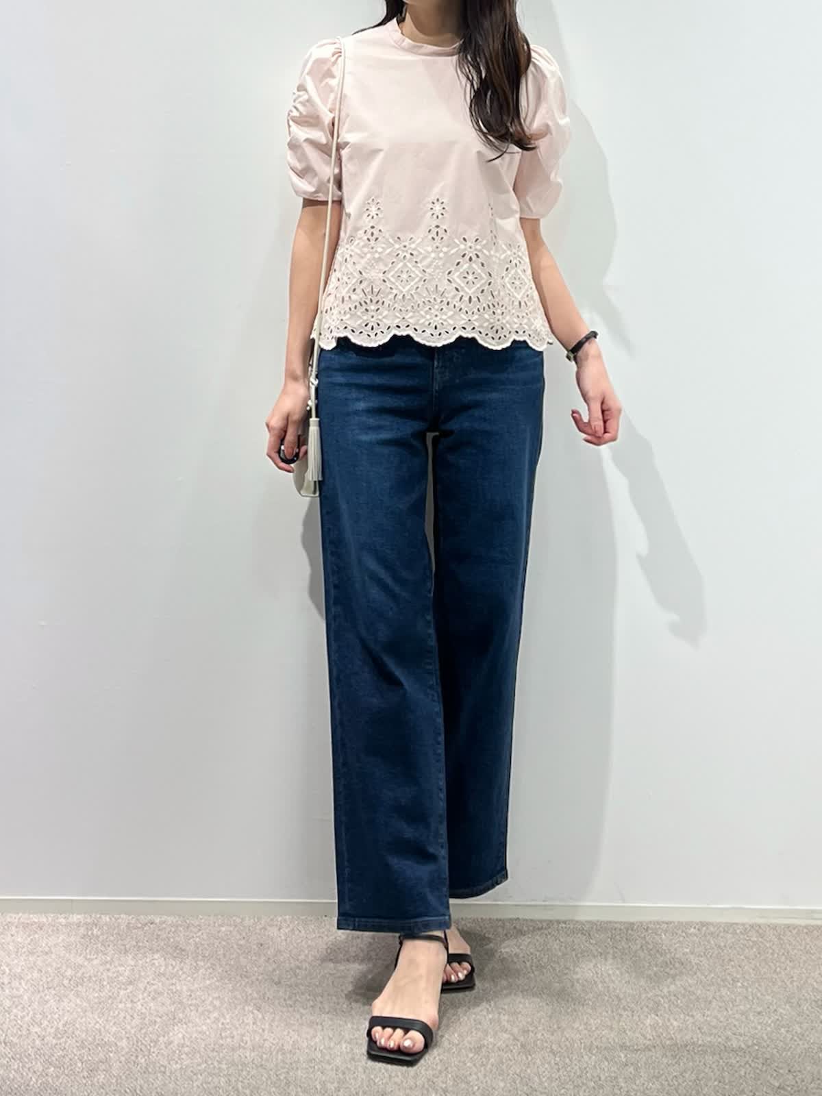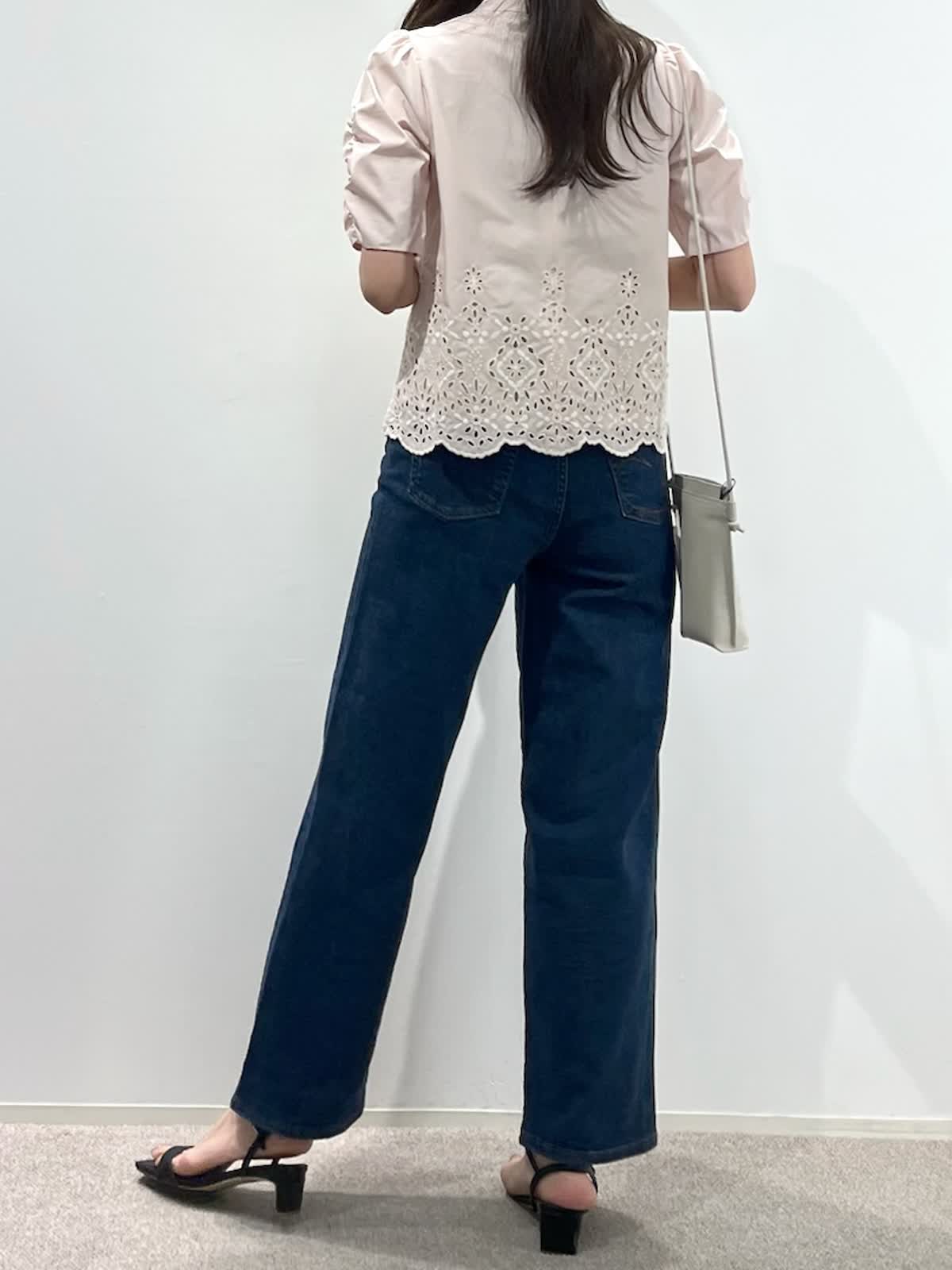 【着用サイズ】ブラウス:9号 パンツ:9号 【着用カラー】ブラウス:ピンク パンツ:インディゴ バッグ:オフホワイト 「ラクして可愛い華やかトップス×デニムコーデ」 華奢なスタンドカラーのネックラインと、ボリューム袖が華やかなデザインブラウス。体型カバーも叶う丈感でバランス良く着こなせるのでおすすめ。スカラップレースで、フェミニンな着映えブラウスなので、デニムコーデにこなれ感がプラス。ボトムを変えれば、通勤にも万能。ラクなのに可愛い華やかトップスなので、シンプル合わせでお出かけスタイルにおすすめです。デニムはストレッチ性があり、柔らかい履き心地の美シルエットパンツ。バックポケットには、Maglieオリジナルのハートステッチがポイント。甘くなりすぎないフェミニンな大人カジュアルスタイルの完成。