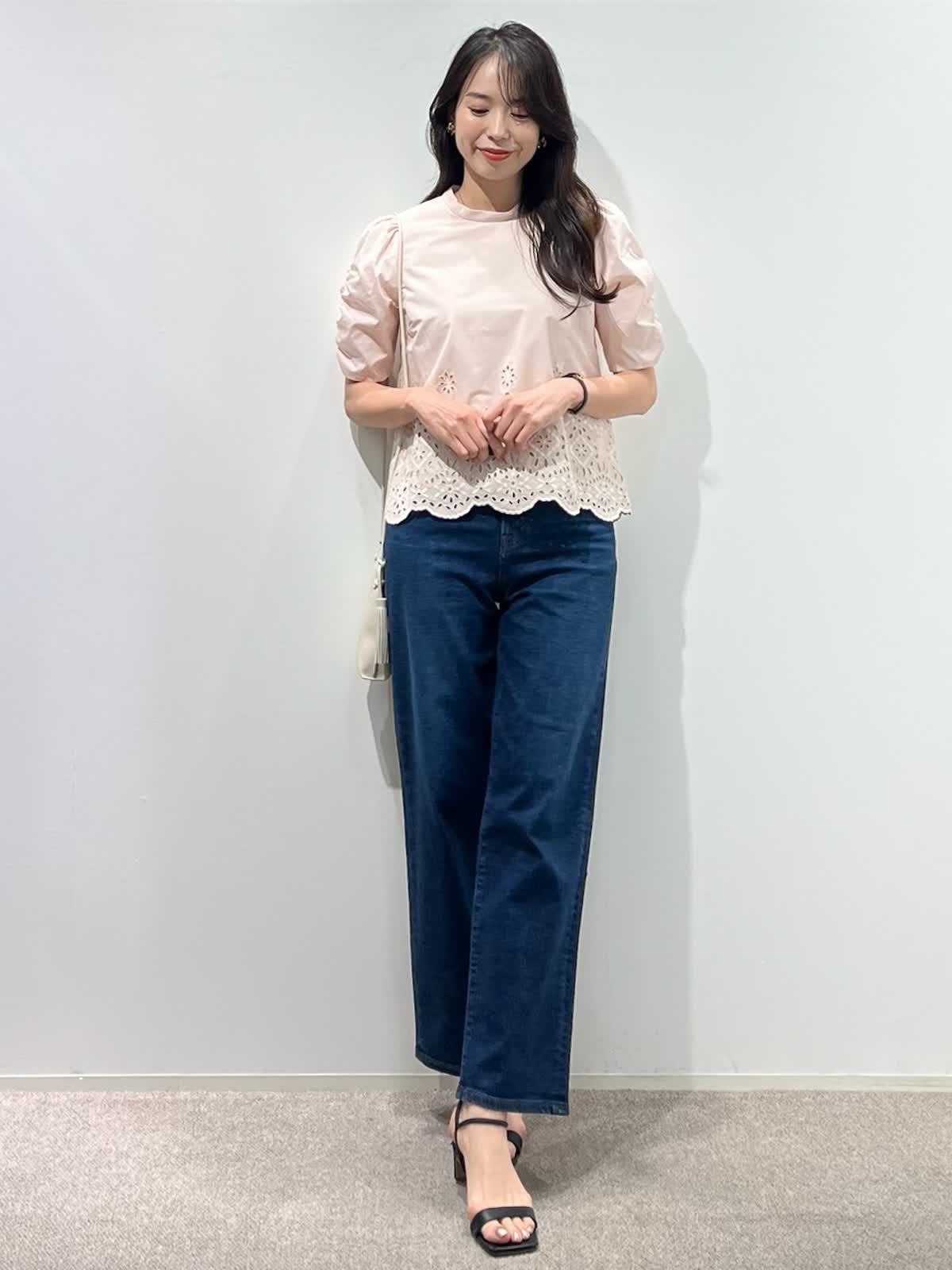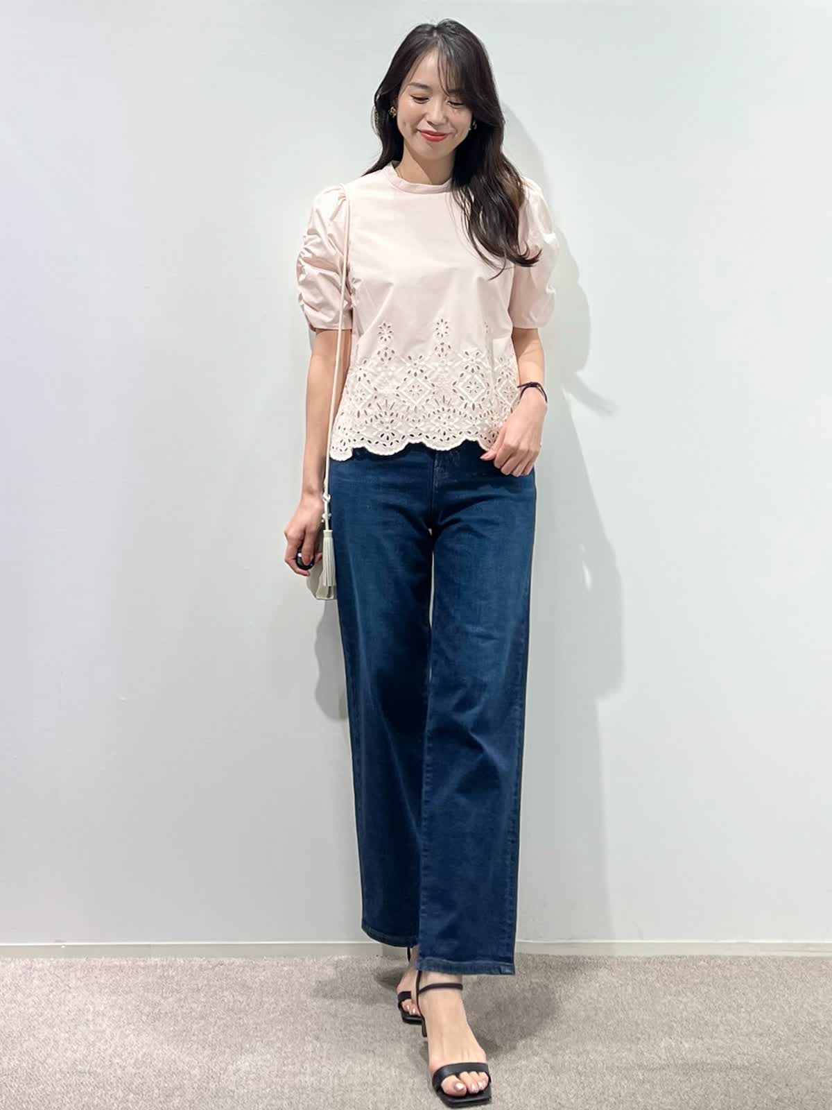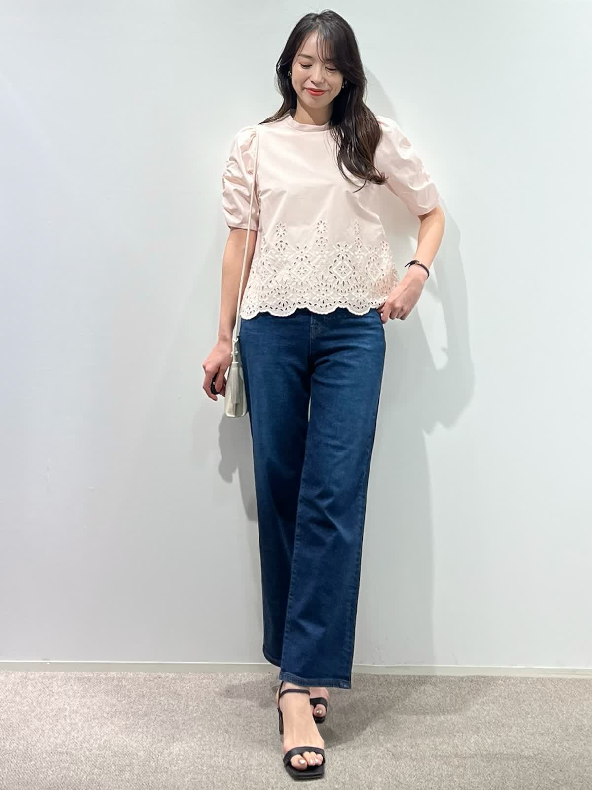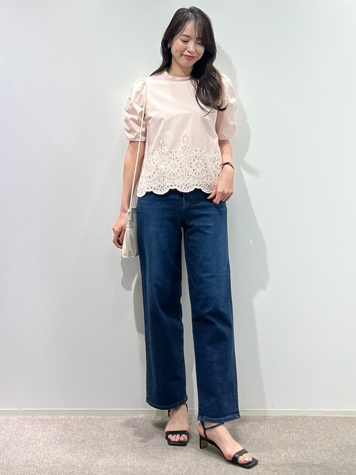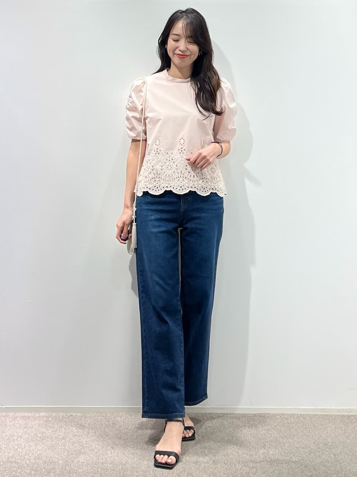 【着用サイズ】ブラウス:9号 パンツ:9号 【着用カラー】ブラウス:ピンク パンツ:インディゴ バッグ:オフホワイト 「ラクして可愛い華やかトップス×デニムコーデ」 華奢なスタンドカラーのネックラインと、ボリューム袖が華やかなデザインブラウス。体型カバーも叶う丈感でバランス良く着こなせるのでおすすめ。スカラップレースで、フェミニンな着映えブラウスなので、デニムコーデにこなれ感がプラス。ボトムを変えれば、通勤にも万能。ラクなのに可愛い華やかトップスなので、シンプル合わせでお出かけスタイルにおすすめです。デニムはストレッチ性があり、柔らかい履き心地の美シルエットパンツ。バックポケットには、Maglieオリジナルのハートステッチがポイント。甘くなりすぎないフェミニンな大人カジュアルスタイルの完成。