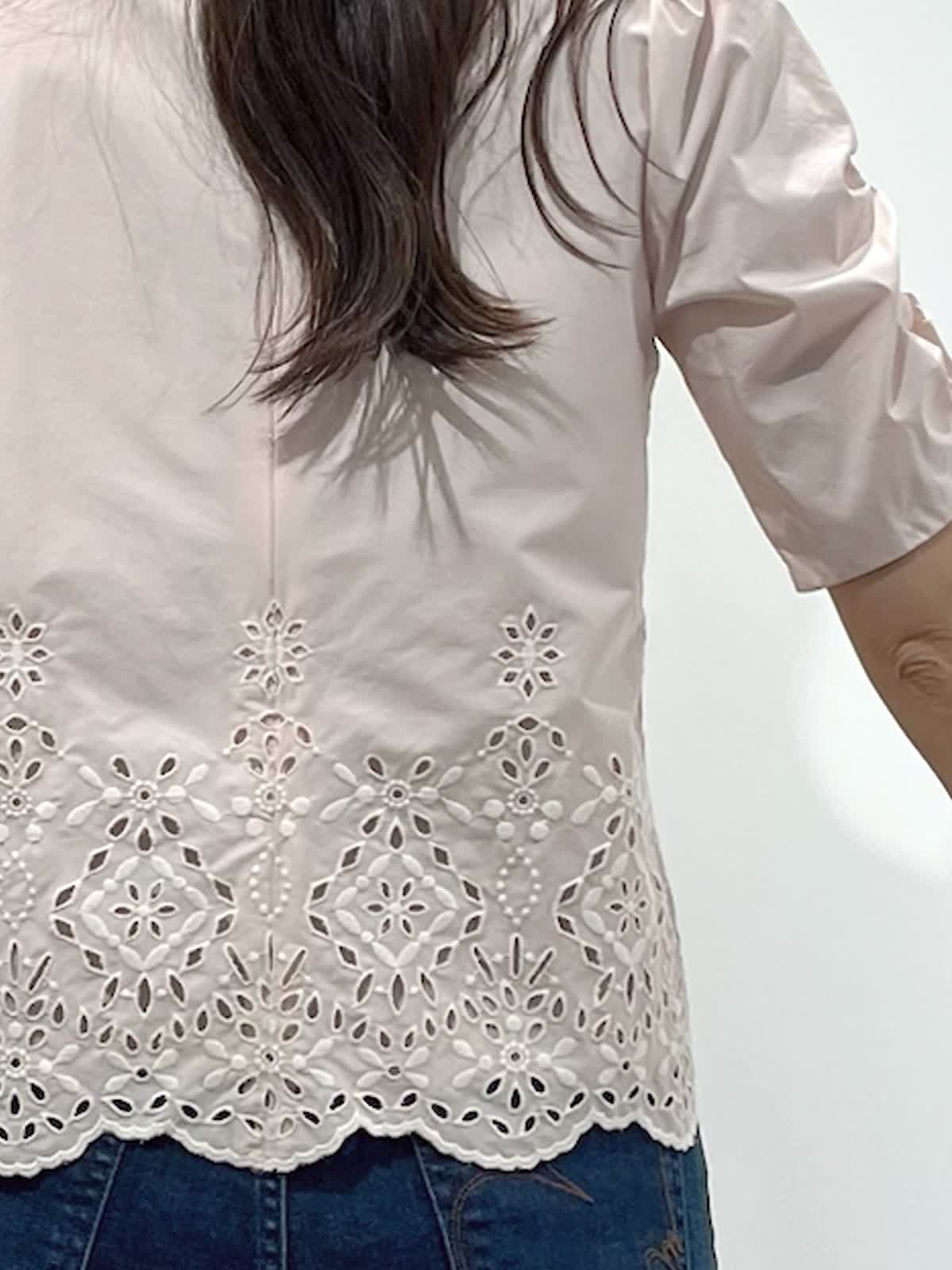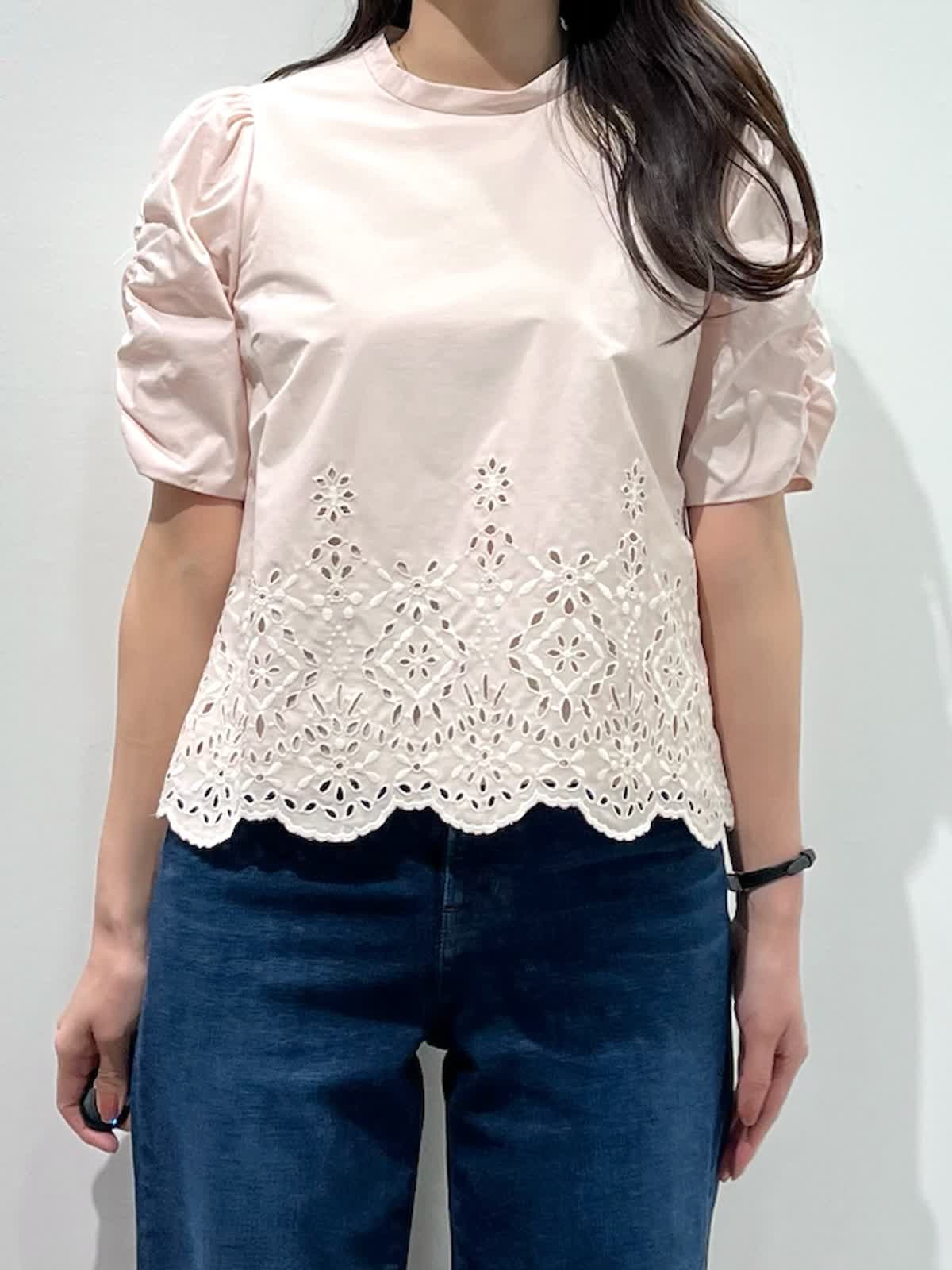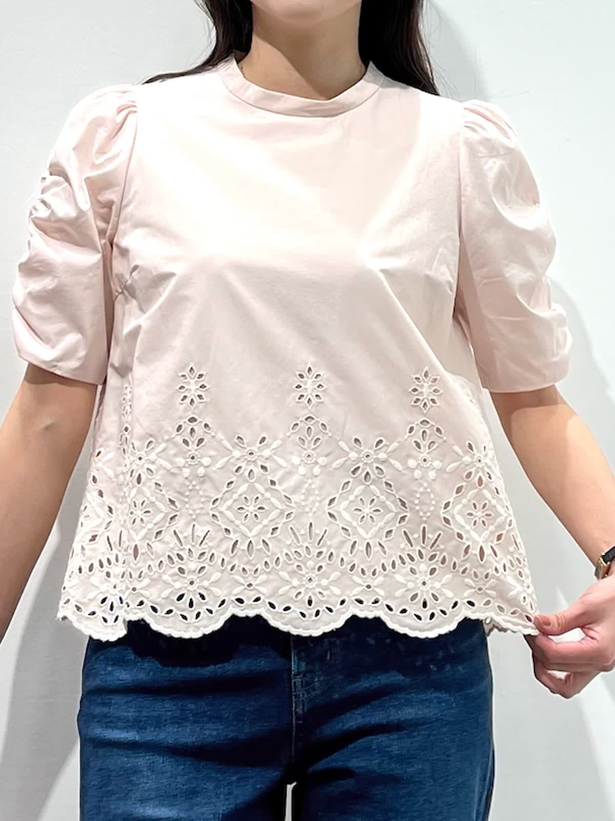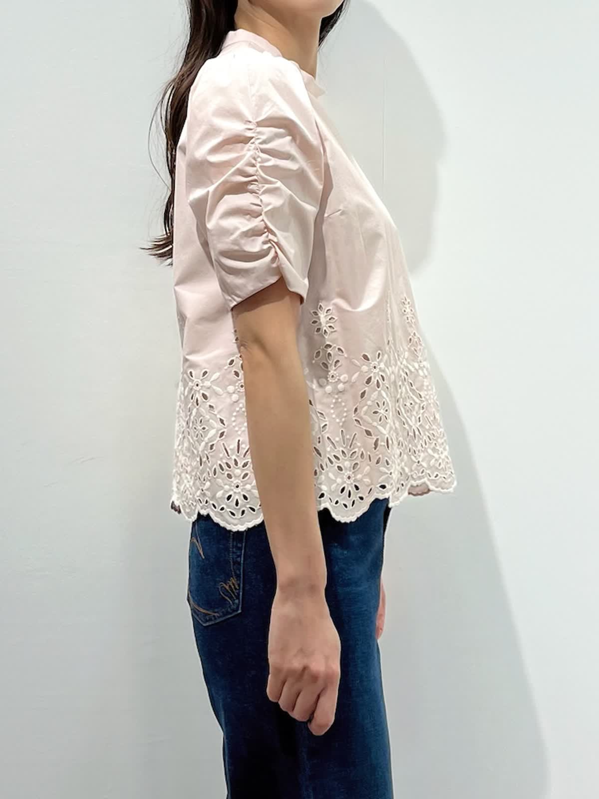 【着用サイズ】ブラウス:9号 パンツ:9号 【着用カラー】ブラウス:ピンク パンツ:インディゴ バッグ:オフホワイト 「ラクして可愛い華やかトップス×デニムコーデ」 華奢なスタンドカラーのネックラインと、ボリューム袖が華やかなデザインブラウス。体型カバーも叶う丈感でバランス良く着こなせるのでおすすめ。スカラップレースで、フェミニンな着映えブラウスなので、デニムコーデにこなれ感がプラス。ボトムを変えれば、通勤にも万能。ラクなのに可愛い華やかトップスなので、シンプル合わせでお出かけスタイルにおすすめです。デニムはストレッチ性があり、柔らかい履き心地の美シルエットパンツ。バックポケットには、Maglieオリジナルのハートステッチがポイント。甘くなりすぎないフェミニンな大人カジュアルスタイルの完成。