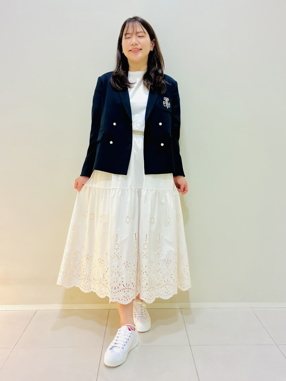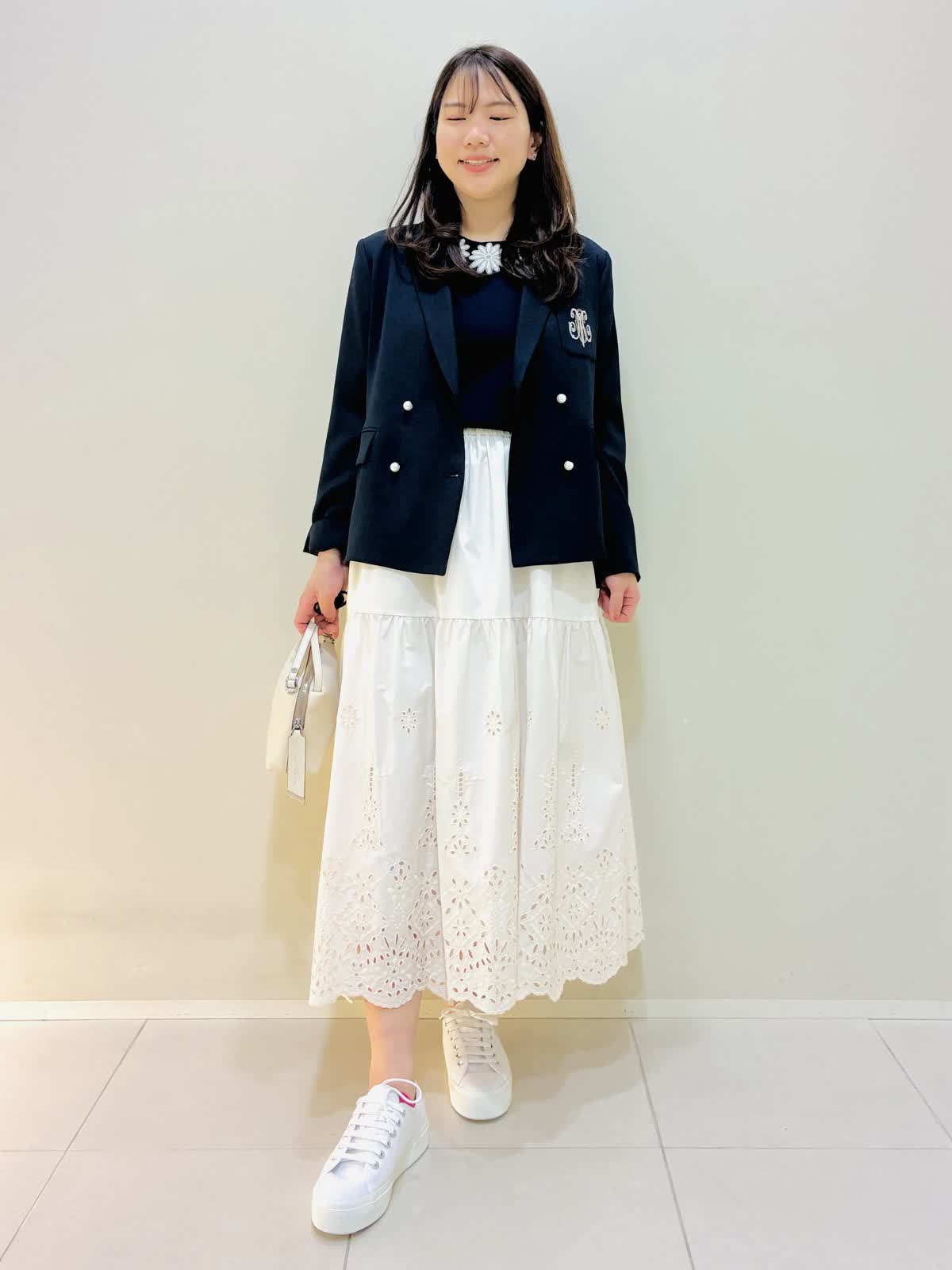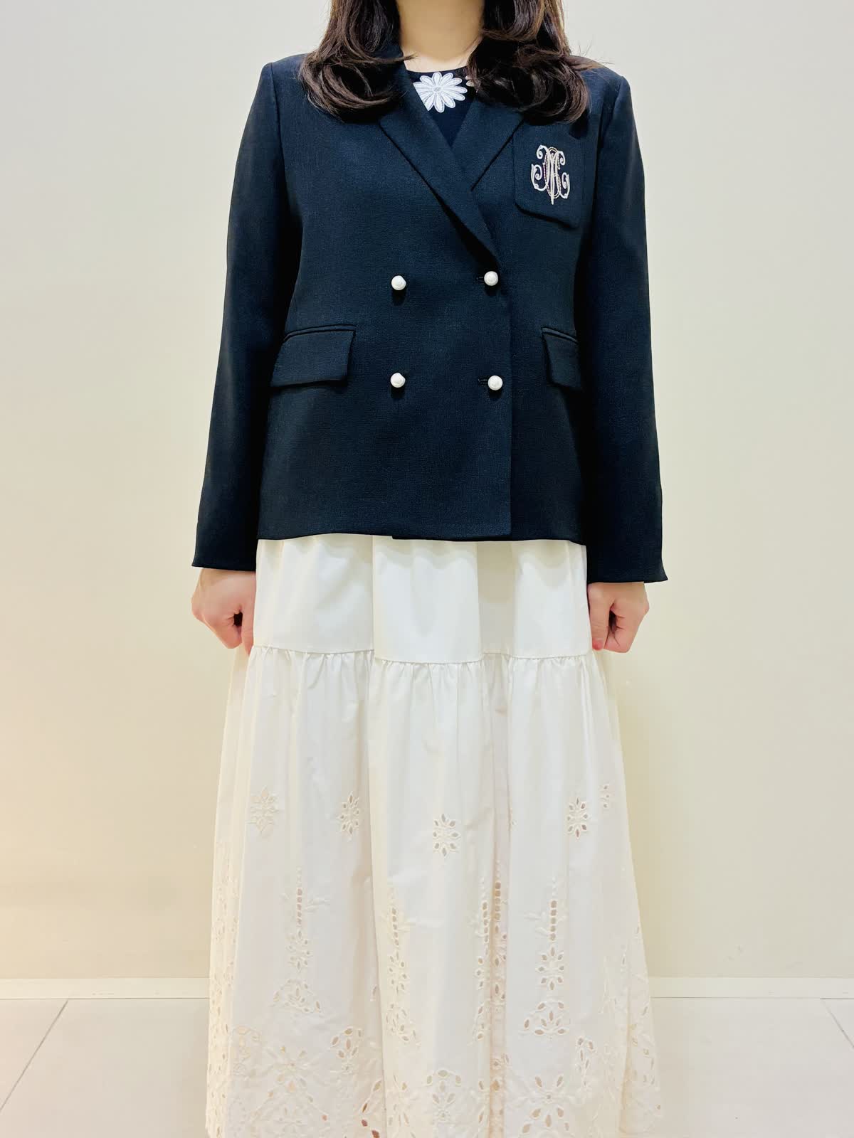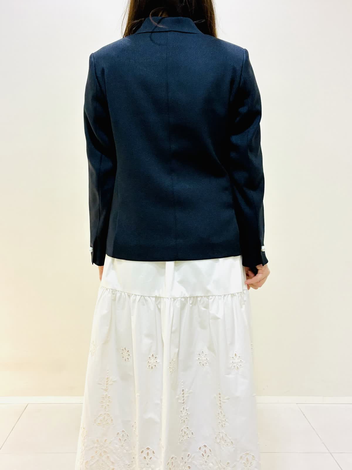 【着用サイズ】 ジャケット:ネイビー:9号サイズ ニット:ネイビー:9号サイズ スカート:オフホワイト:9号サイズ ブラウス:オフホワイト:9号サイズ 『春のお出かけコーデ』 ジャケットはスッキリ見え、ダブルのジャケットにしては丈は短めなので小柄な方も合わせやすいです。パンツコーデもおすすめですが、ワンピースやスカートコーデとの相性もバッチリです。 スカートはブラウスも作っており、セットアップコーデもできます。