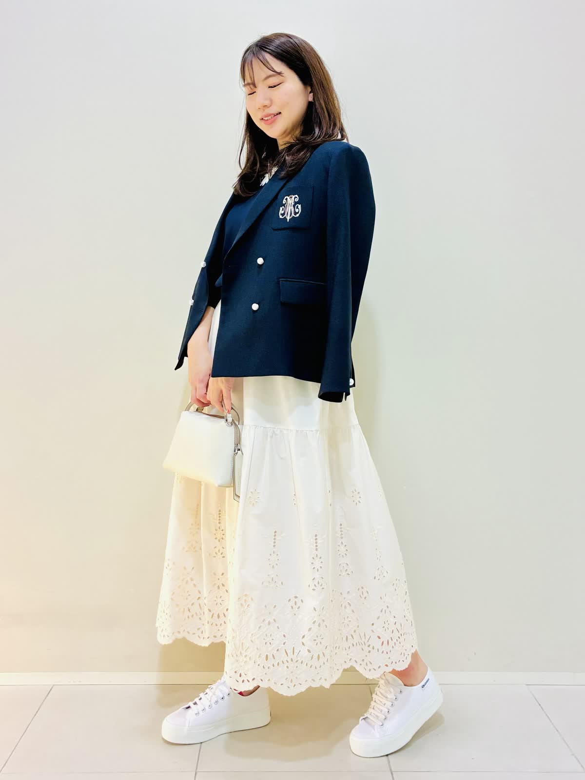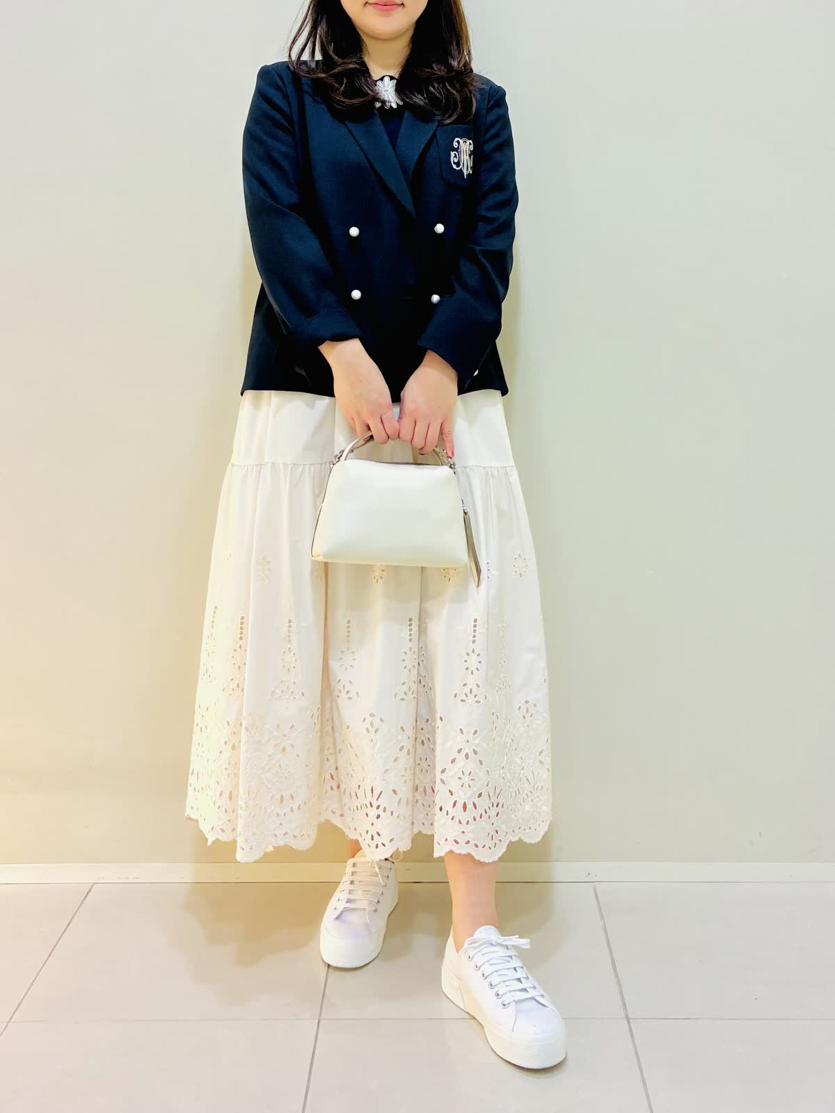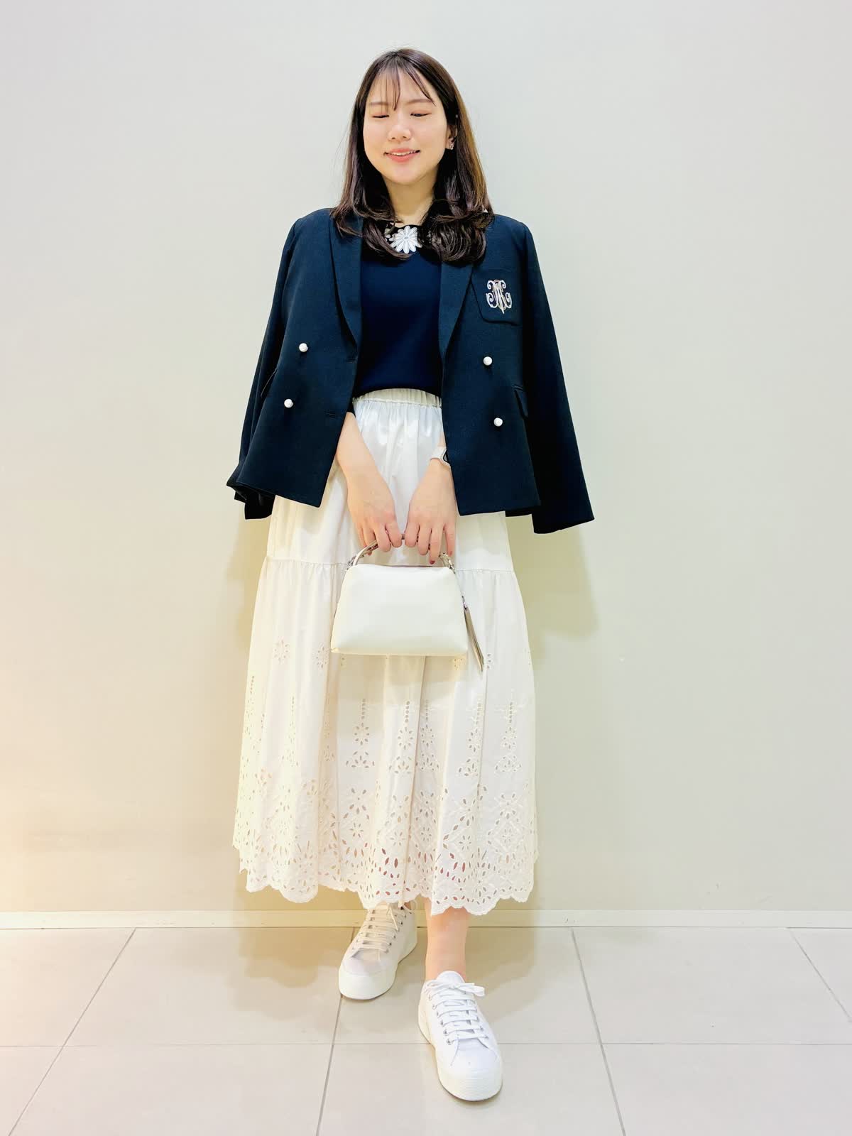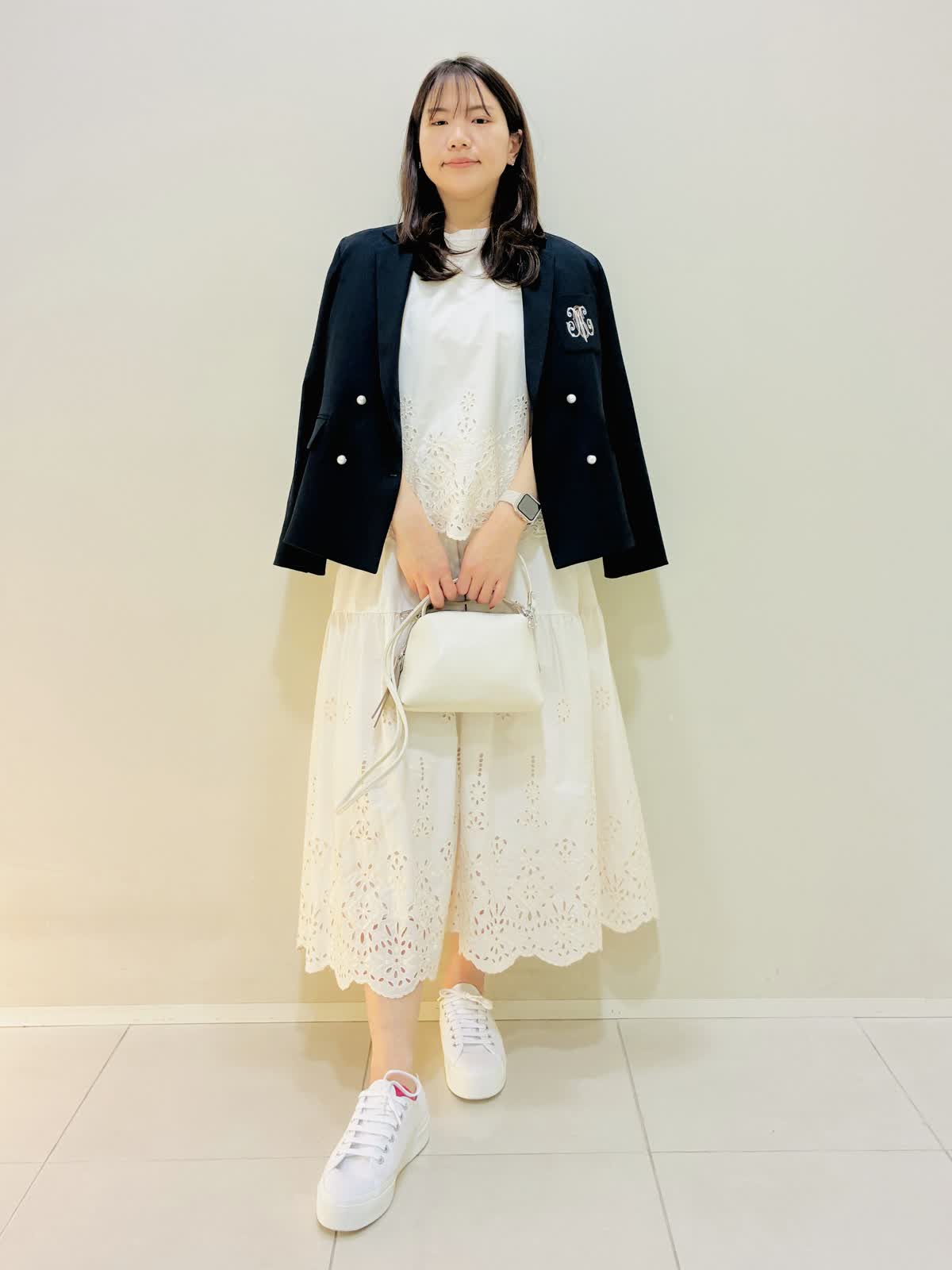 【着用サイズ】 ジャケット:ネイビー:9号サイズ ニット:ネイビー:9号サイズ スカート:オフホワイト:9号サイズ ブラウス:オフホワイト:9号サイズ 『春のお出かけコーデ』 ジャケットはスッキリ見え、ダブルのジャケットにしては丈は短めなので小柄な方も合わせやすいです。パンツコーデもおすすめですが、ワンピースやスカートコーデとの相性もバッチリです。 スカートはブラウスも作っており、セットアップコーデもできます。