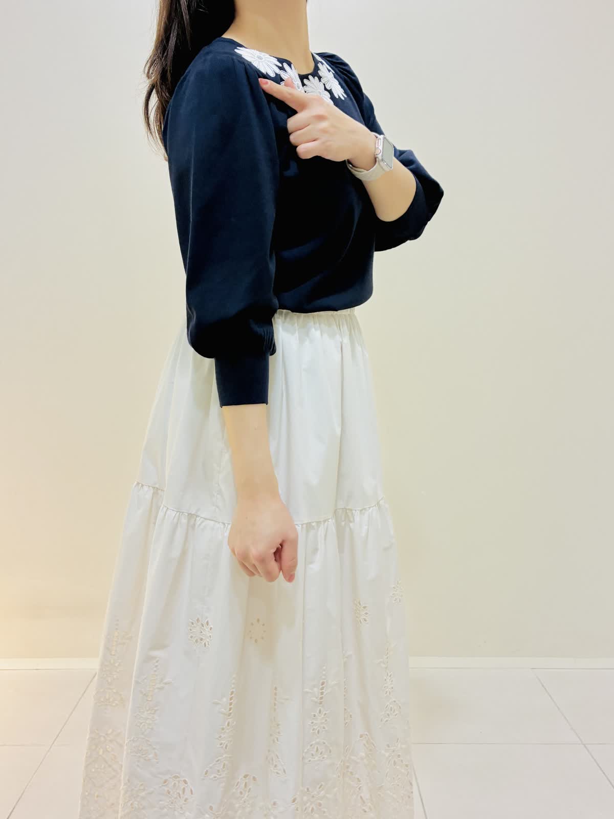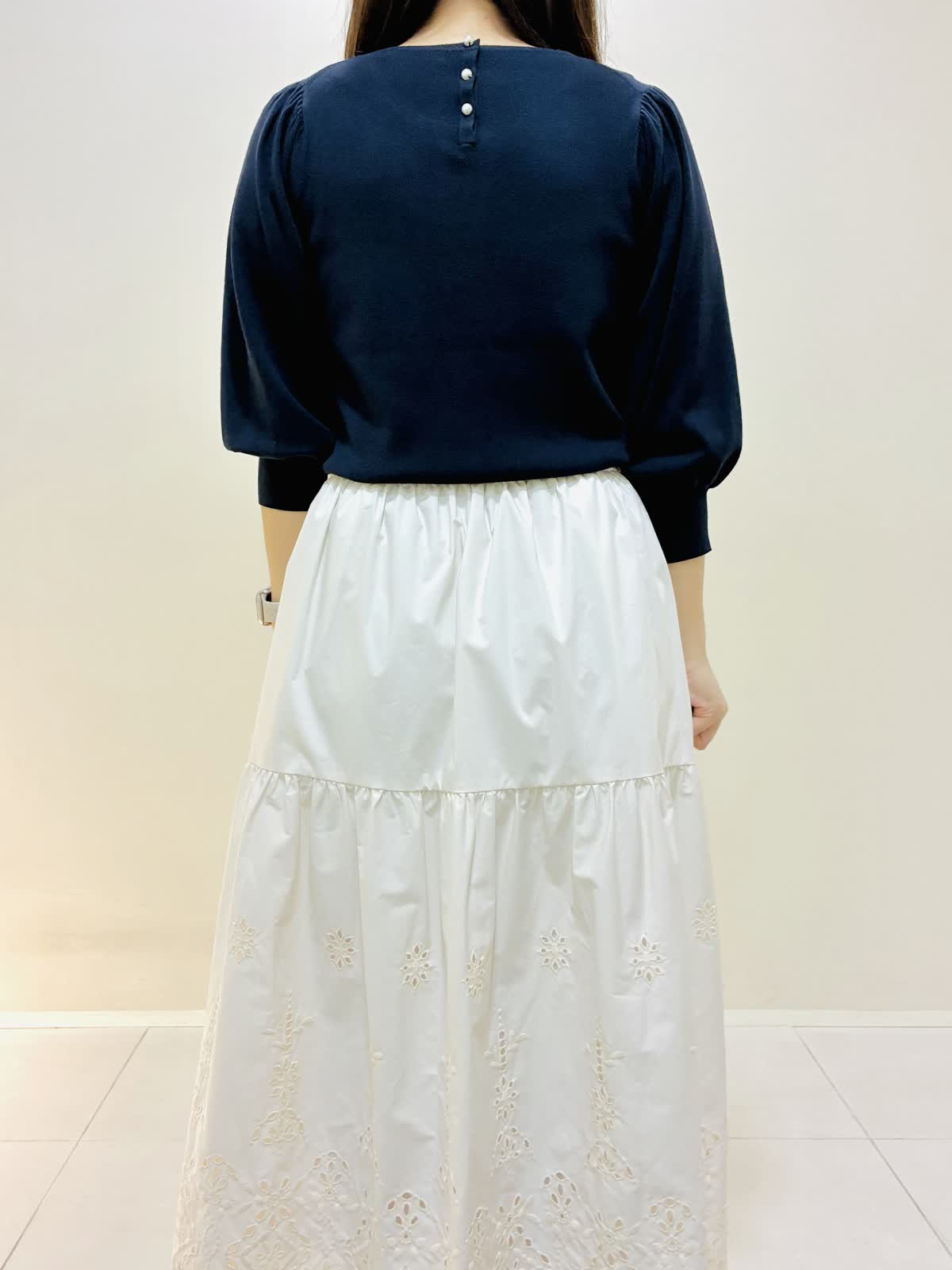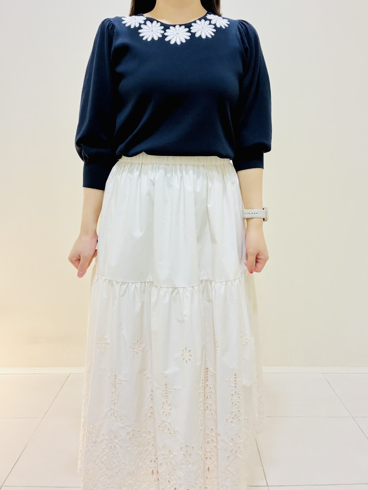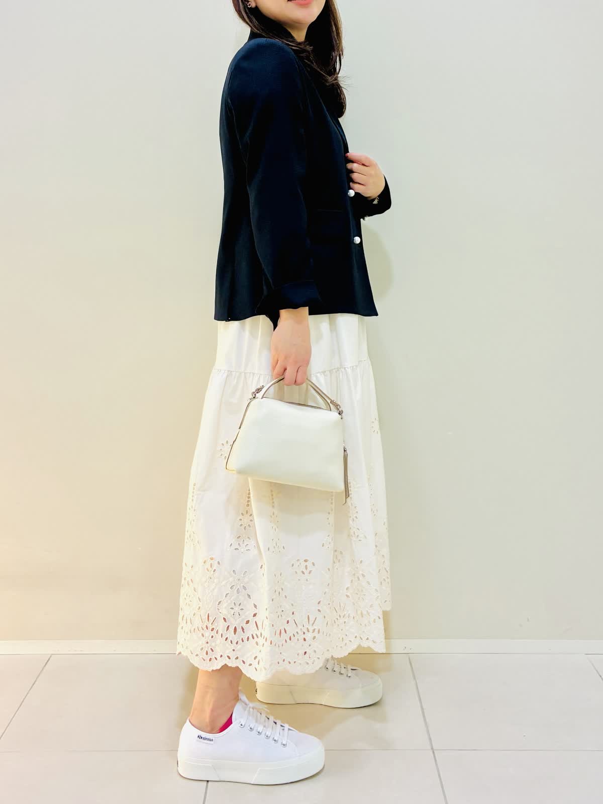 【着用サイズ】 ジャケット:ネイビー:9号サイズ ニット:ネイビー:9号サイズ スカート:オフホワイト:9号サイズ ブラウス:オフホワイト:9号サイズ 『春のお出かけコーデ』 ジャケットはスッキリ見え、ダブルのジャケットにしては丈は短めなので小柄な方も合わせやすいです。パンツコーデもおすすめですが、ワンピースやスカートコーデとの相性もバッチリです。 スカートはブラウスも作っており、セットアップコーデもできます。