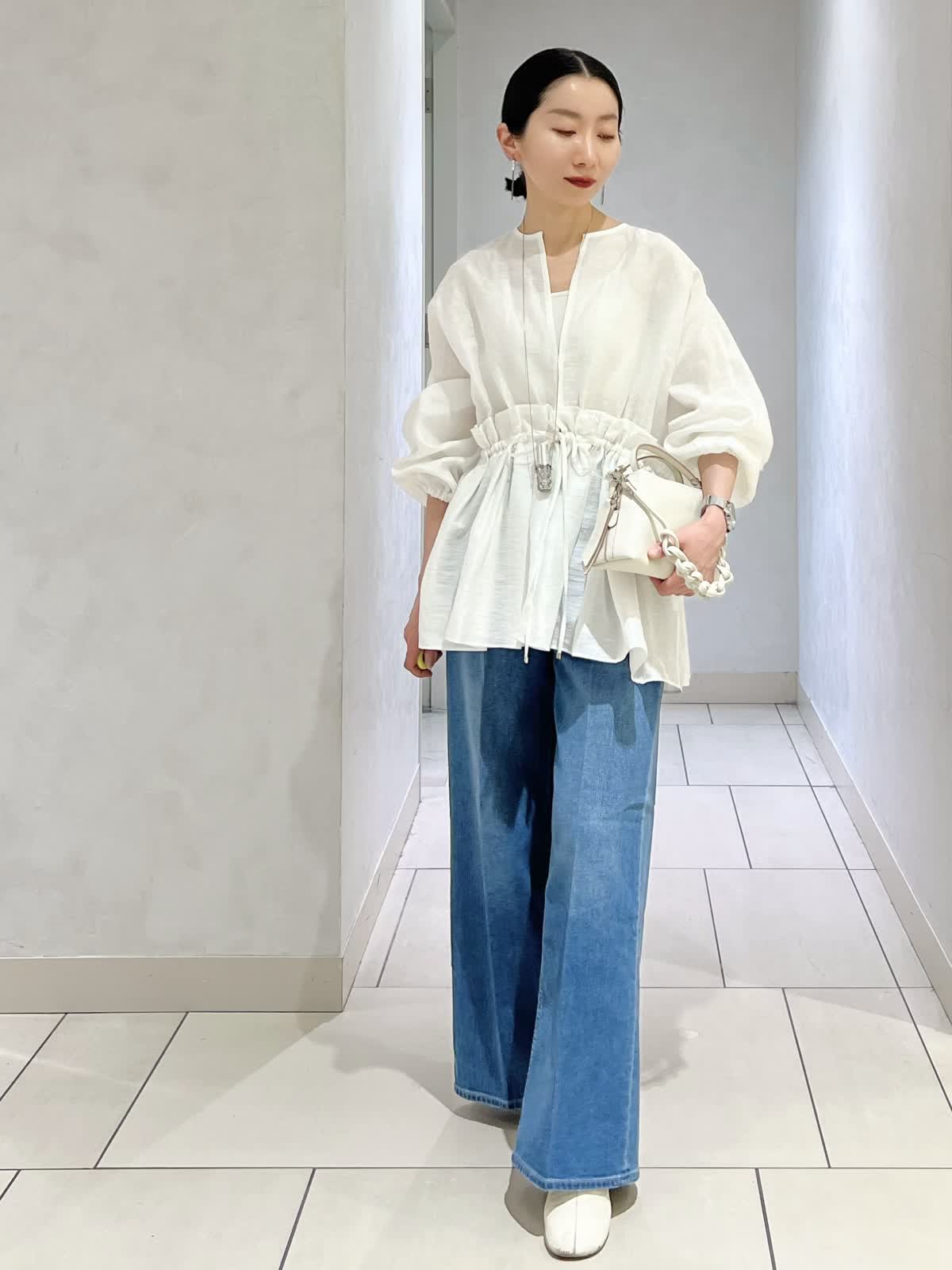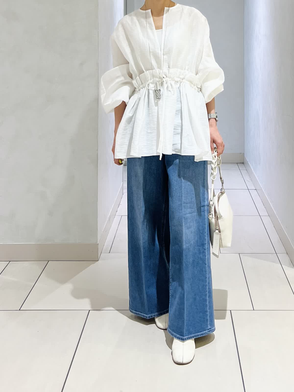 【カラー・サイズ】ブラウス:オフホワイト・9号 パンツ:インディゴ・5号 羽織りとしても使える前開きのブラウスジャケット。たっぷり入ったギャザーで、着るだけで華やかな印象に。ボリュームのある袖とウエストマークで、メリハリのあるシルエットに仕上がります。デニムでカジュアルにも、きれいめボトムで上品にも着回せる一着です。